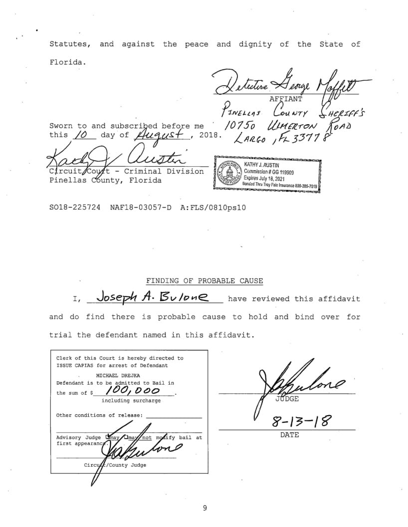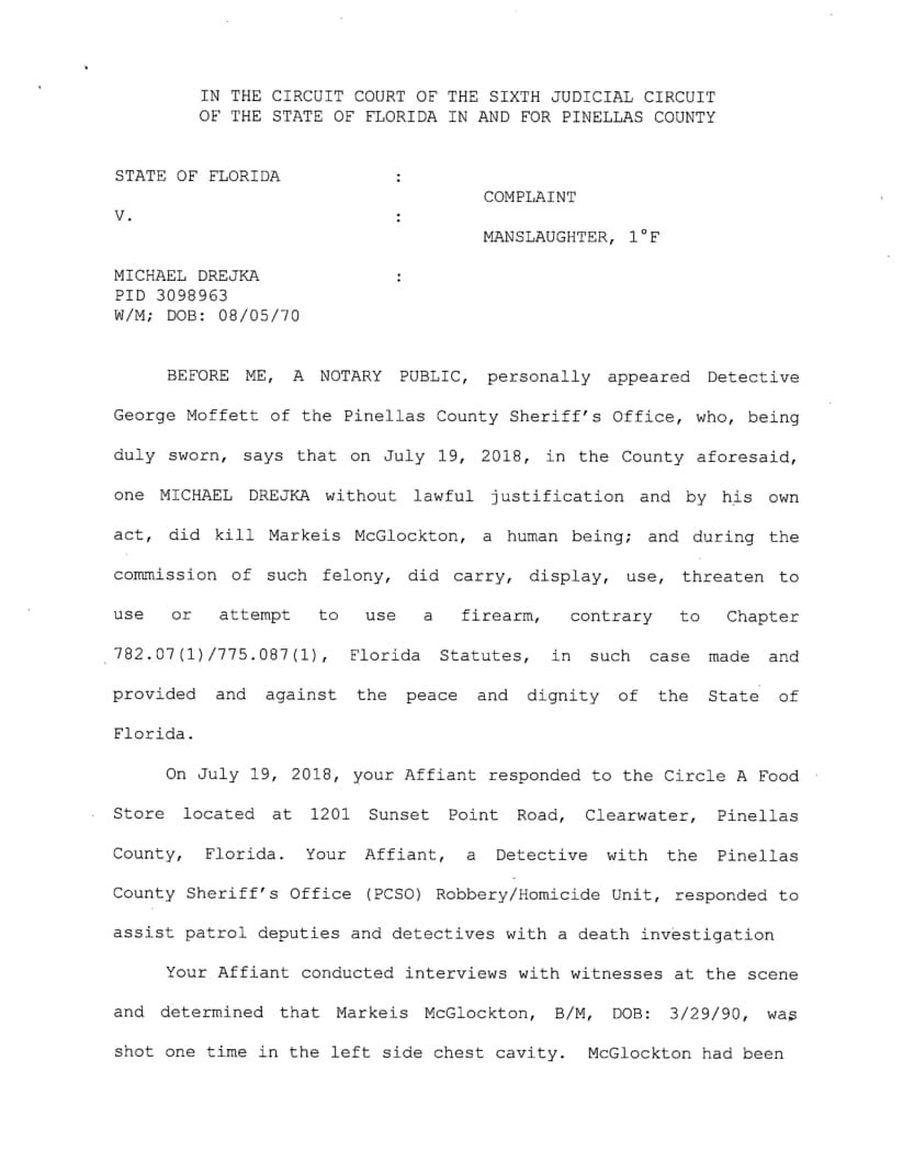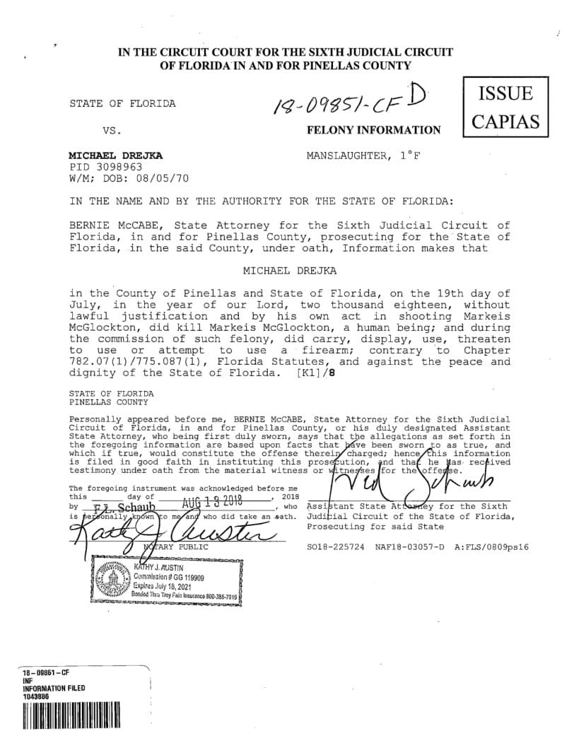 The State Attorney conducted his review and decided to charge Drejka with Manslaughter. An arrest warrant was issued this morning and PCSO detectives arrested Drejka. Drejka is being booked into the Pinellas County. Jail and bond has been set at $100,000.