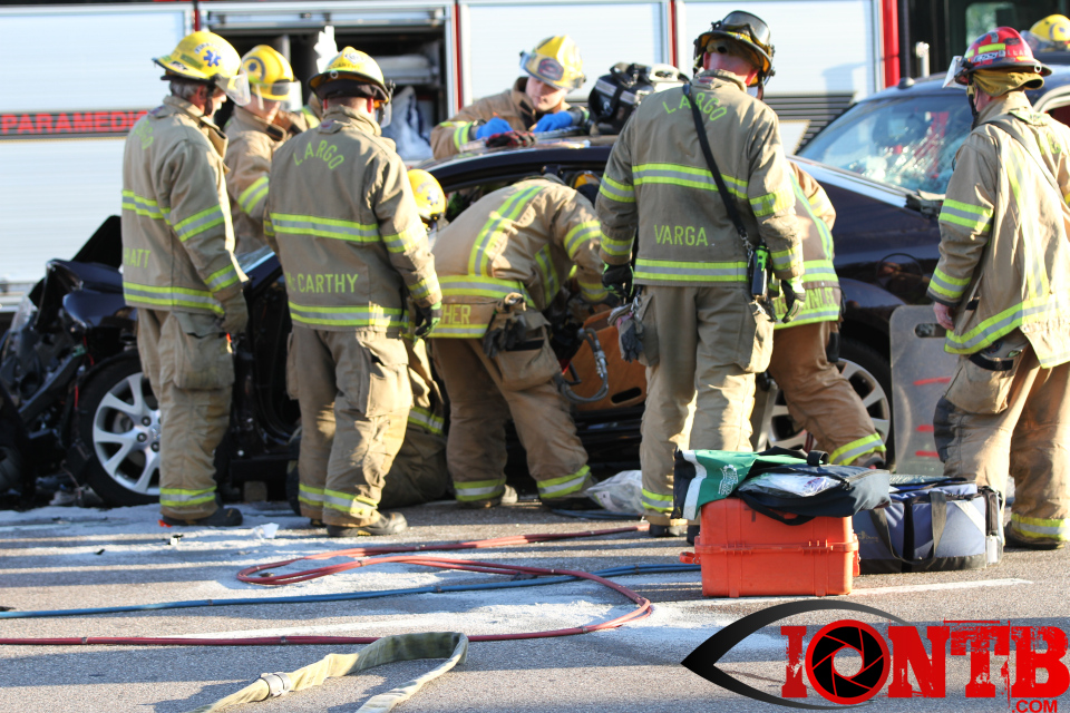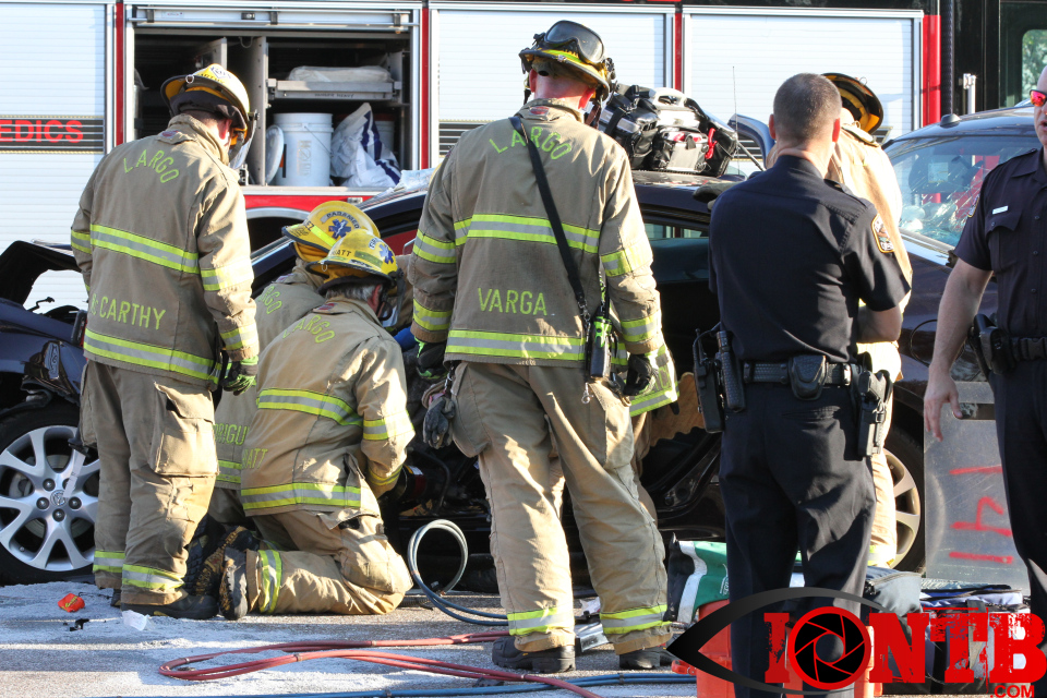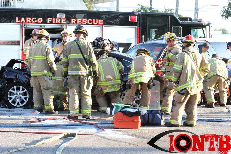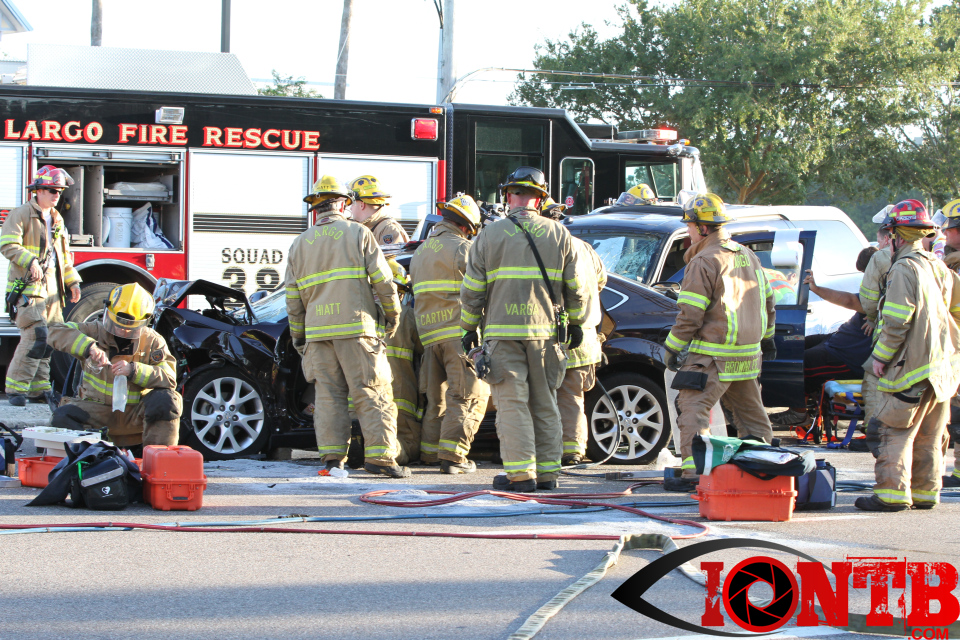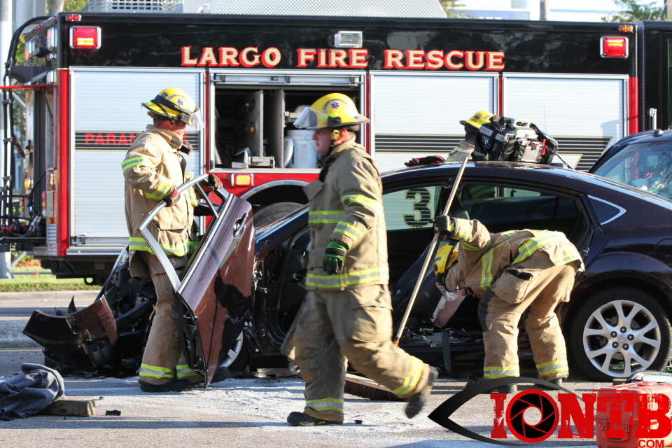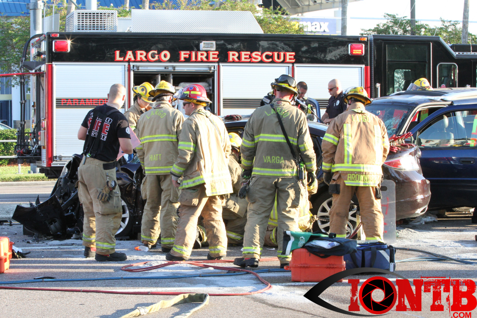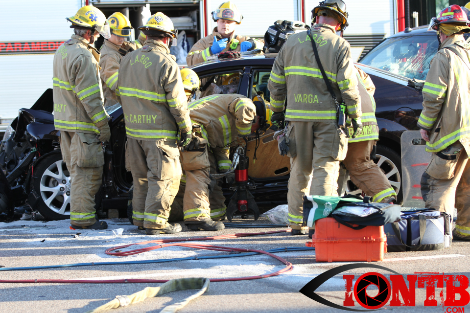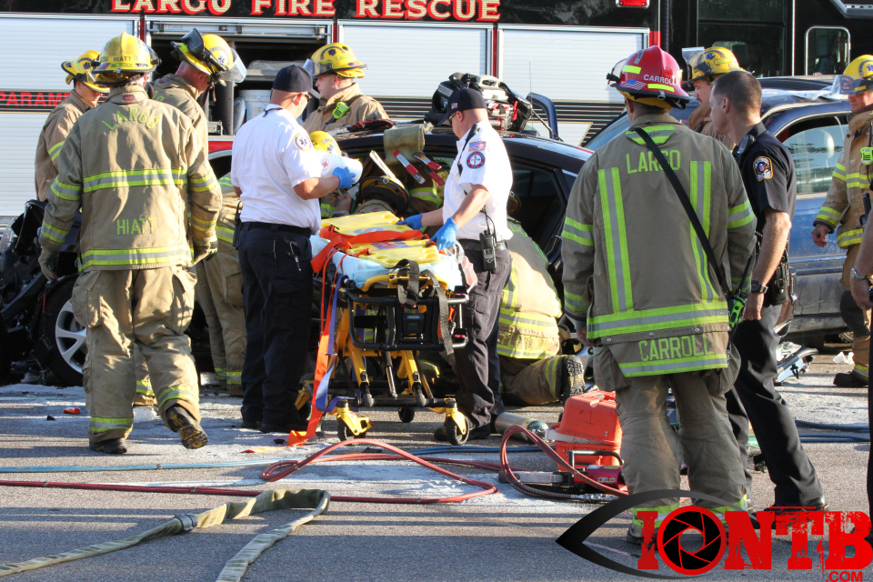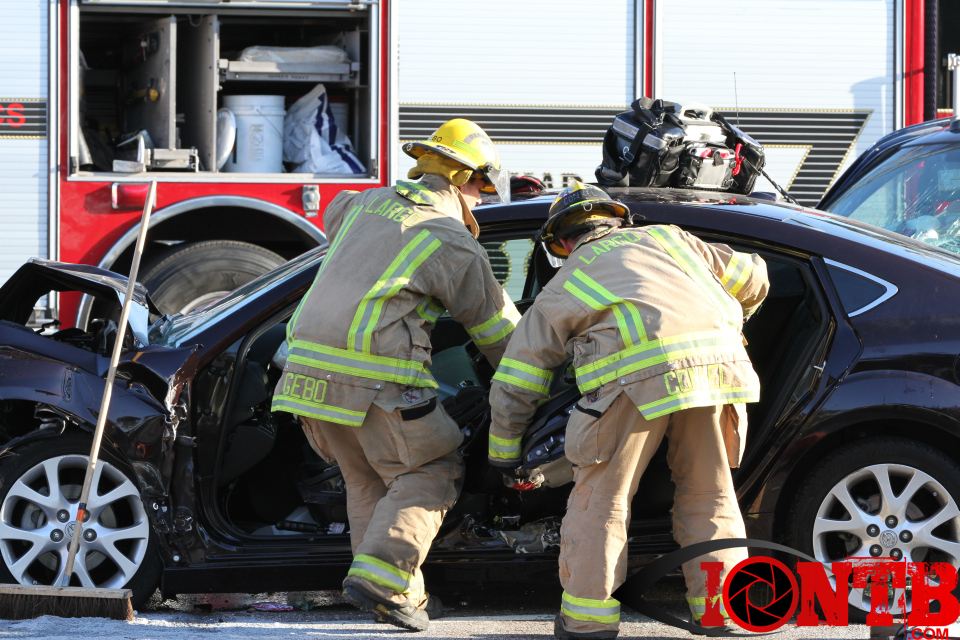Largo’s Engine 40 was first on-scene and reported two vehicles with heavy damage. Additional units from Largo Fire Rescue and Clearwater Fire & Rescue were dispatched to assist. Initially, it appeared as if two patients would need to be extricated from the heavily damaged vehicles. Multiple extrication tools were used to remove the vehicle doors on one of the vehicles. The other individual was able to be removed without requiring an extrication operation.