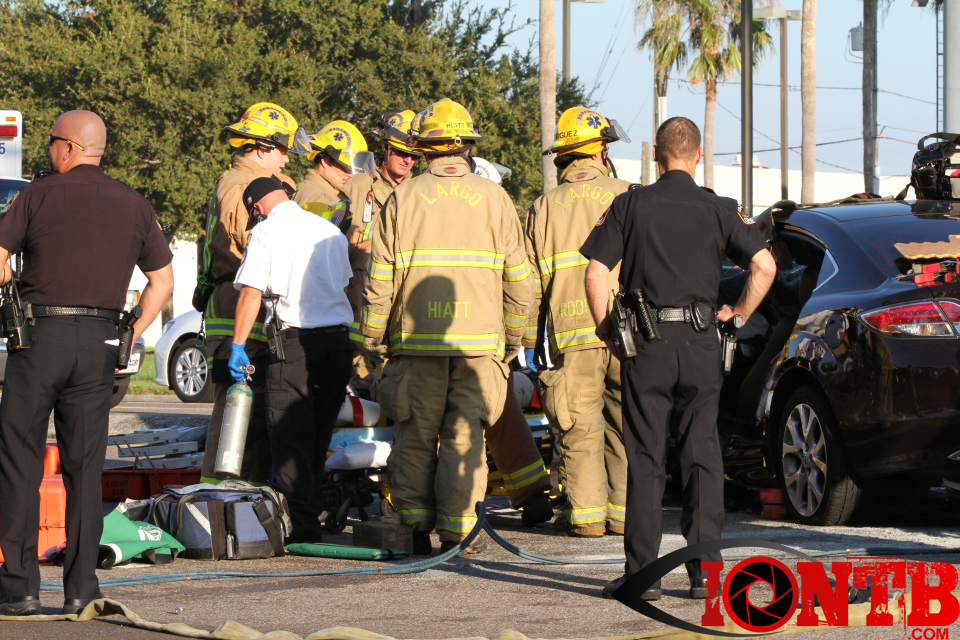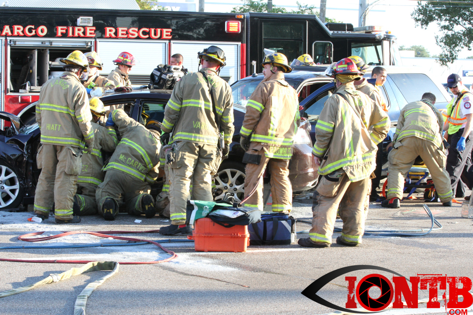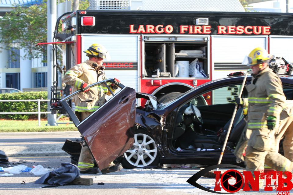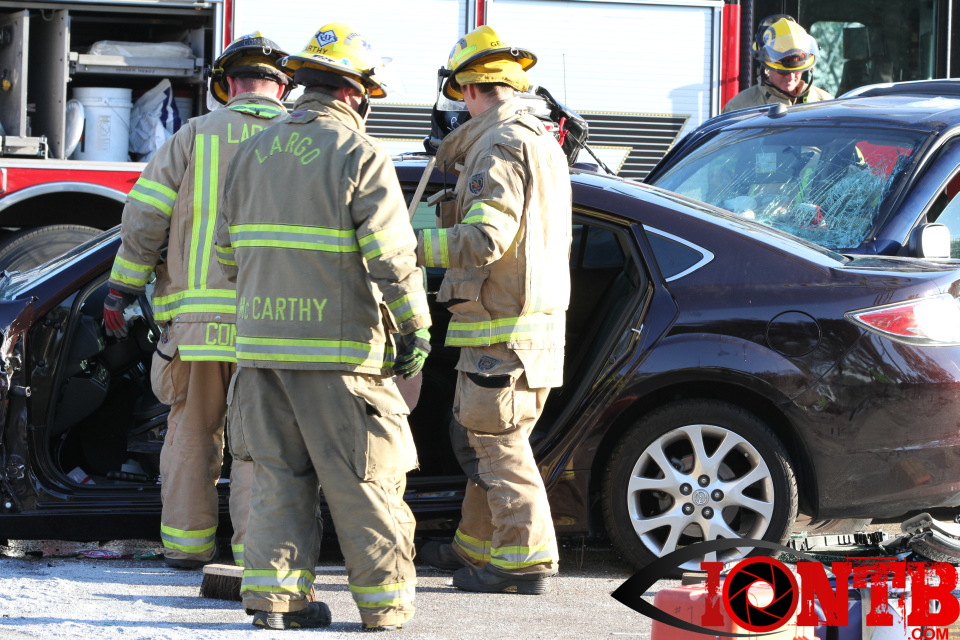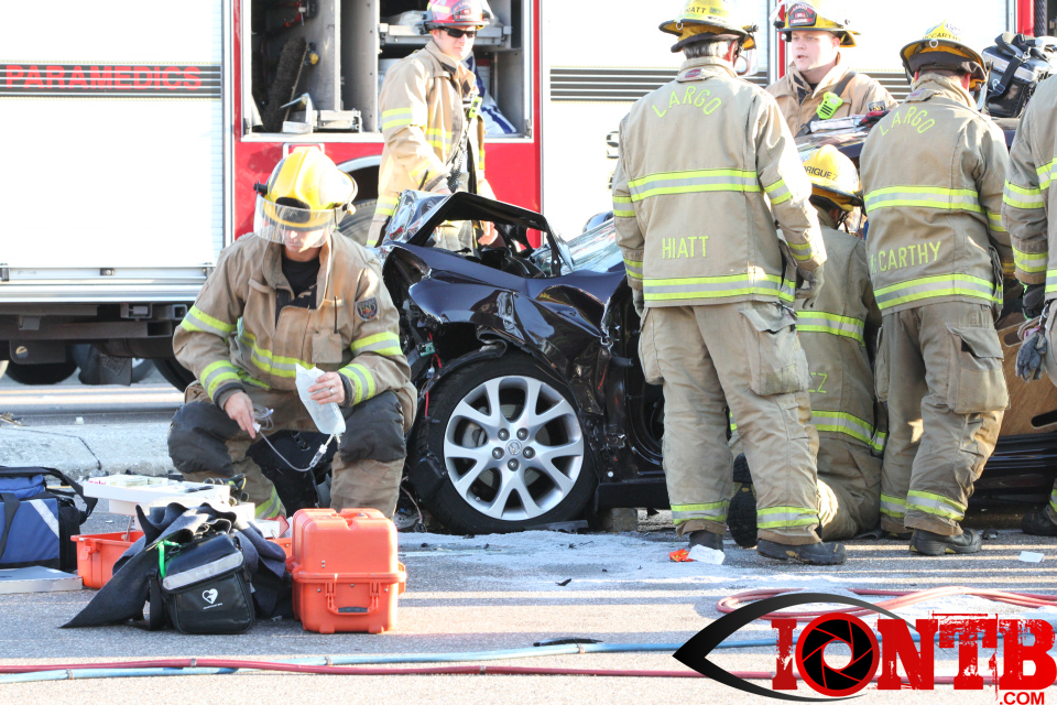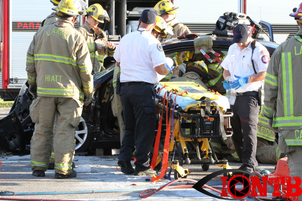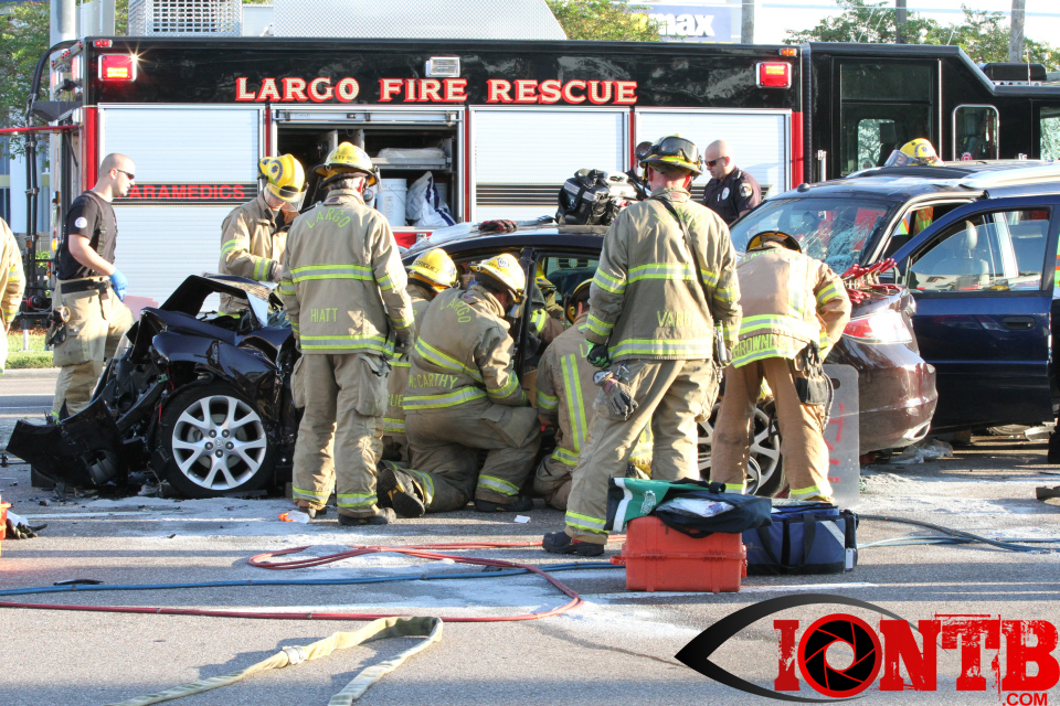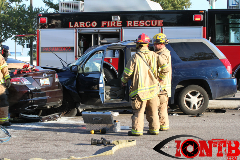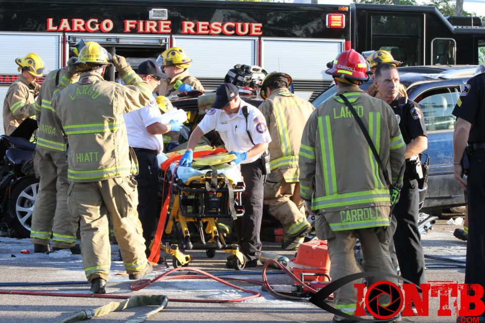 Largo’s Engine 40 was first on-scene and reported two vehicles with heavy damage. Additional units from Largo Fire Rescue and Clearwater Fire & Rescue were dispatched to assist. Initially, it appeared as if two patients would need to be extricated from the heavily damaged vehicles. Multiple extrication tools were used to remove the vehicle doors on one of the vehicles. The other individual was able to be removed without requiring an extrication operation.