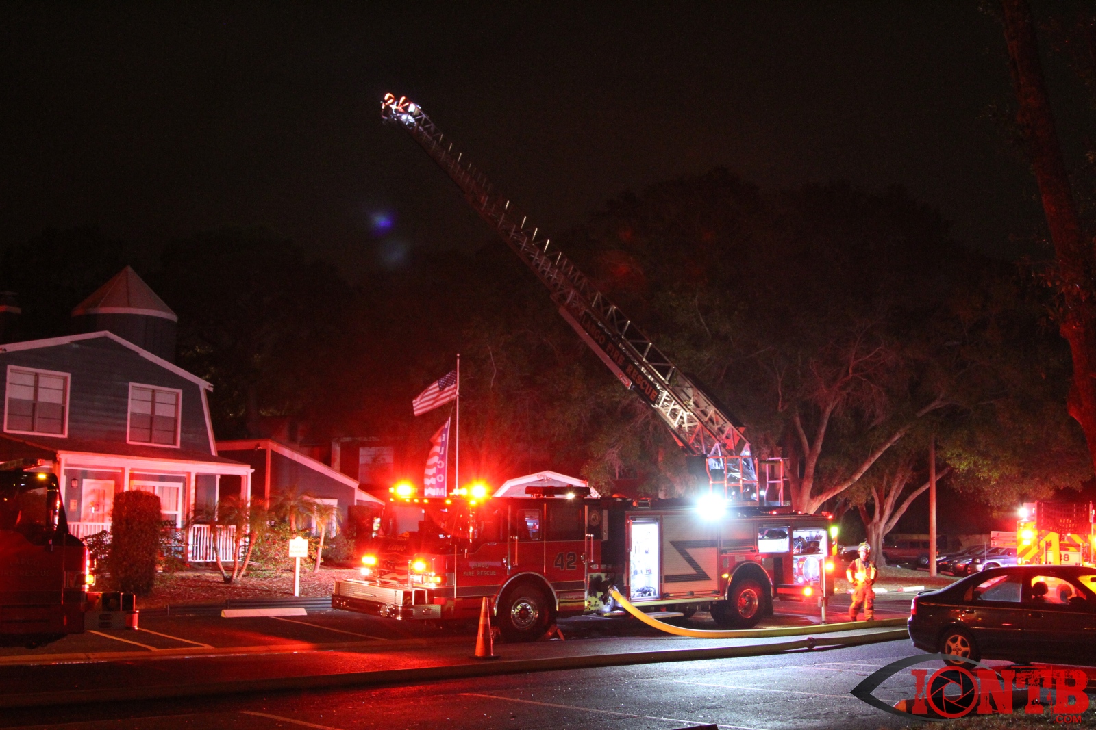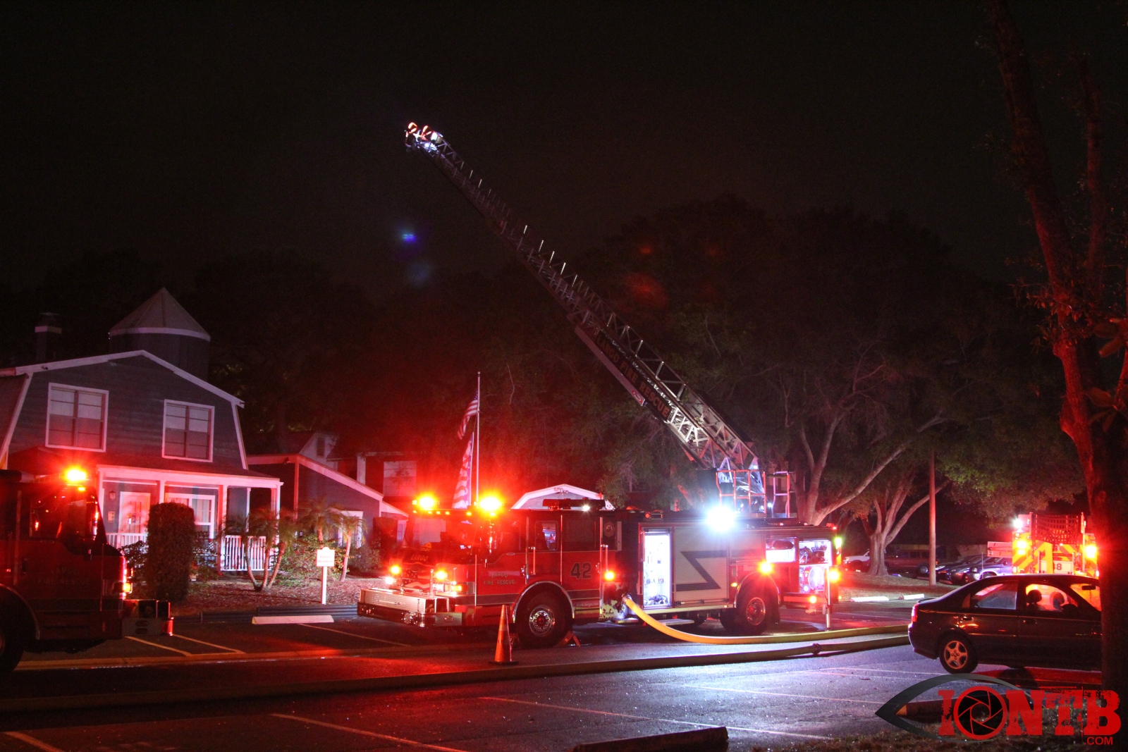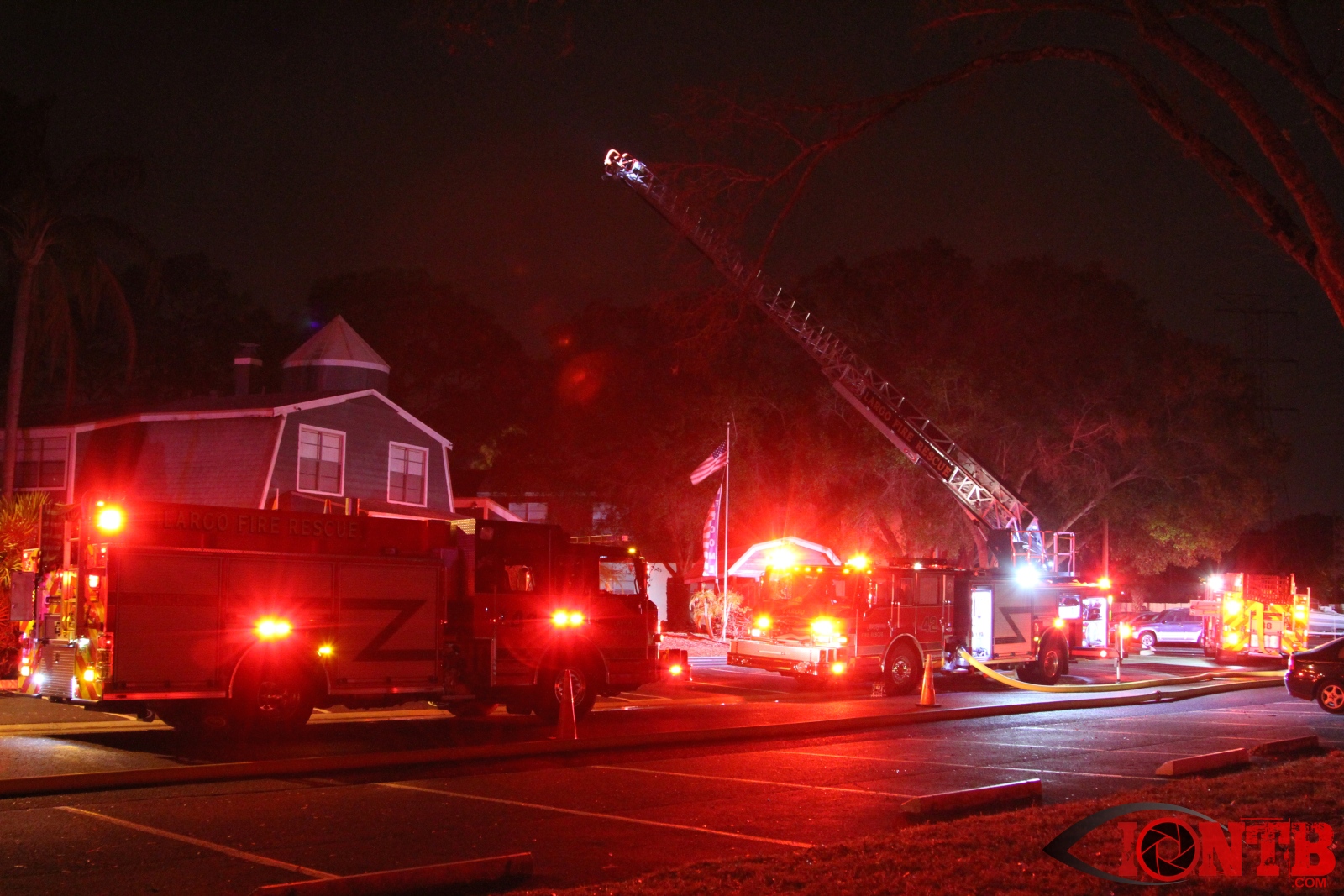 Airport rescue and firefighting (ARFF) units at the nearby St Pete Clearwater airport reported seeing flames. Arriving units reported heavy smoke and flames in two of the units. A second alarm was called as additional resources were required.