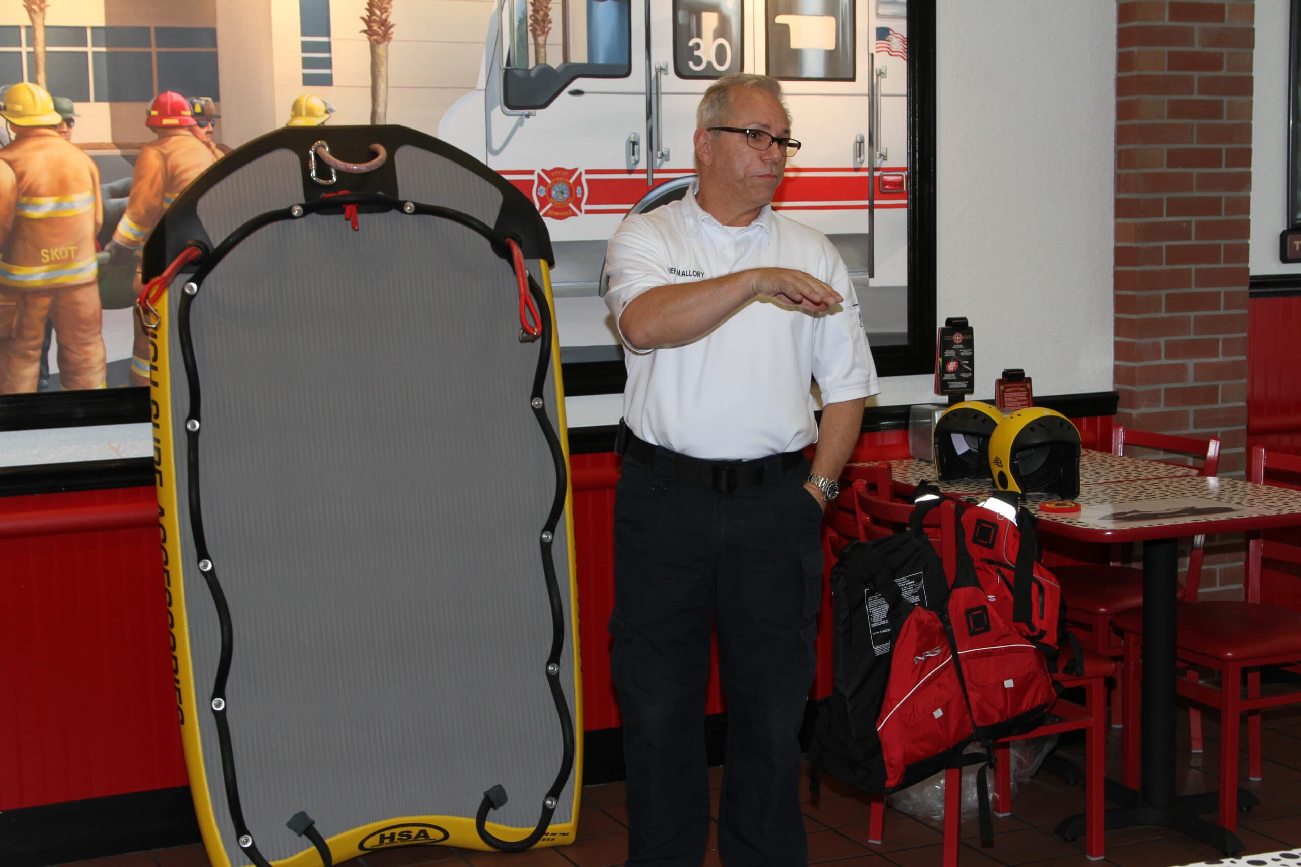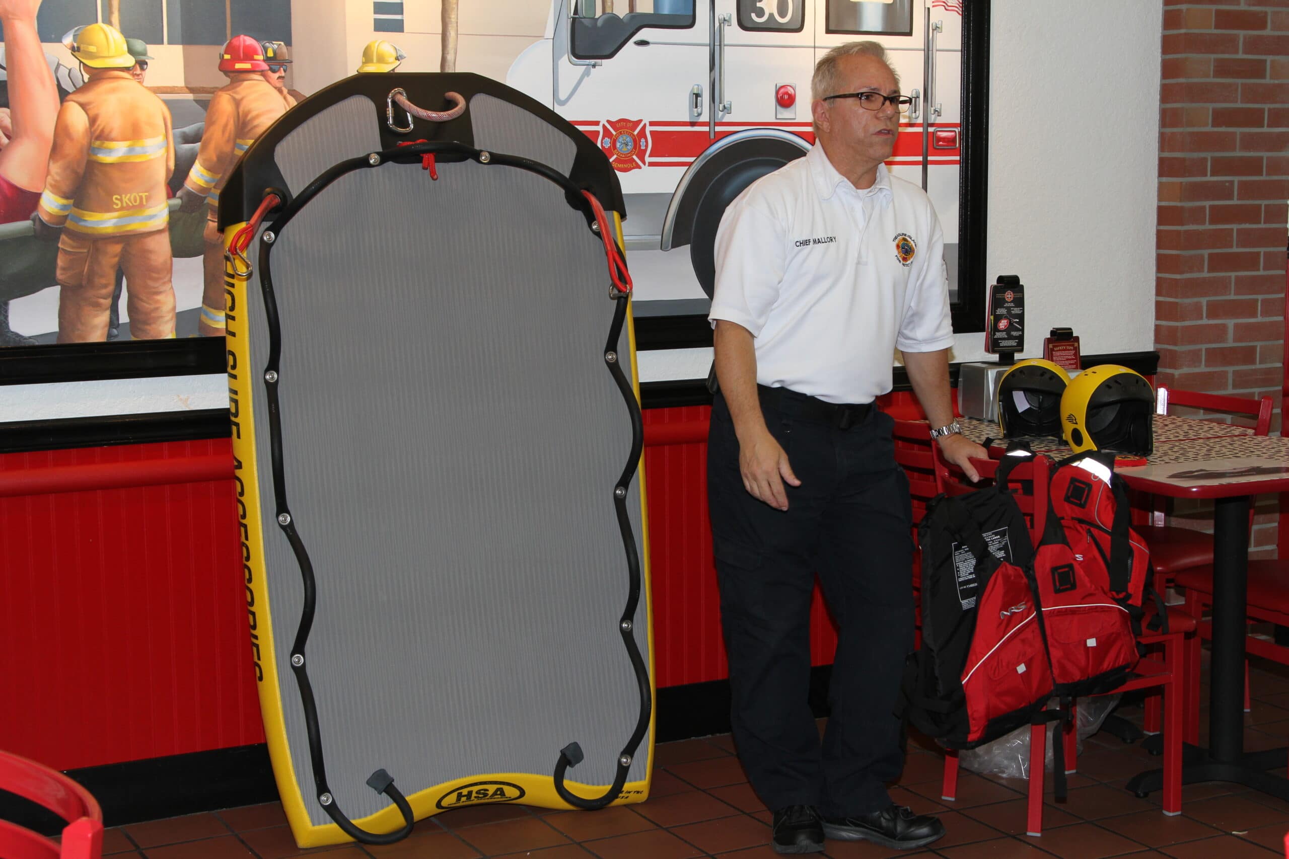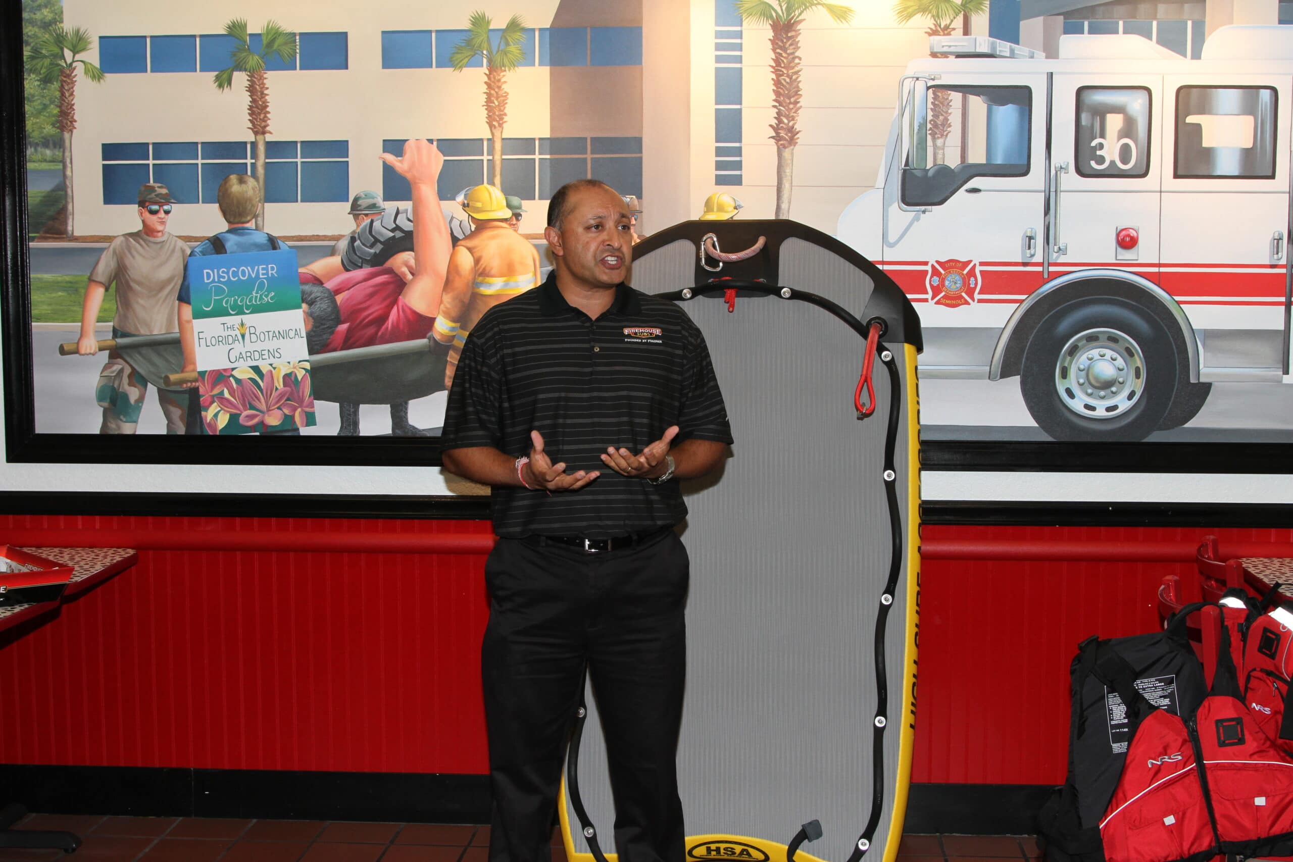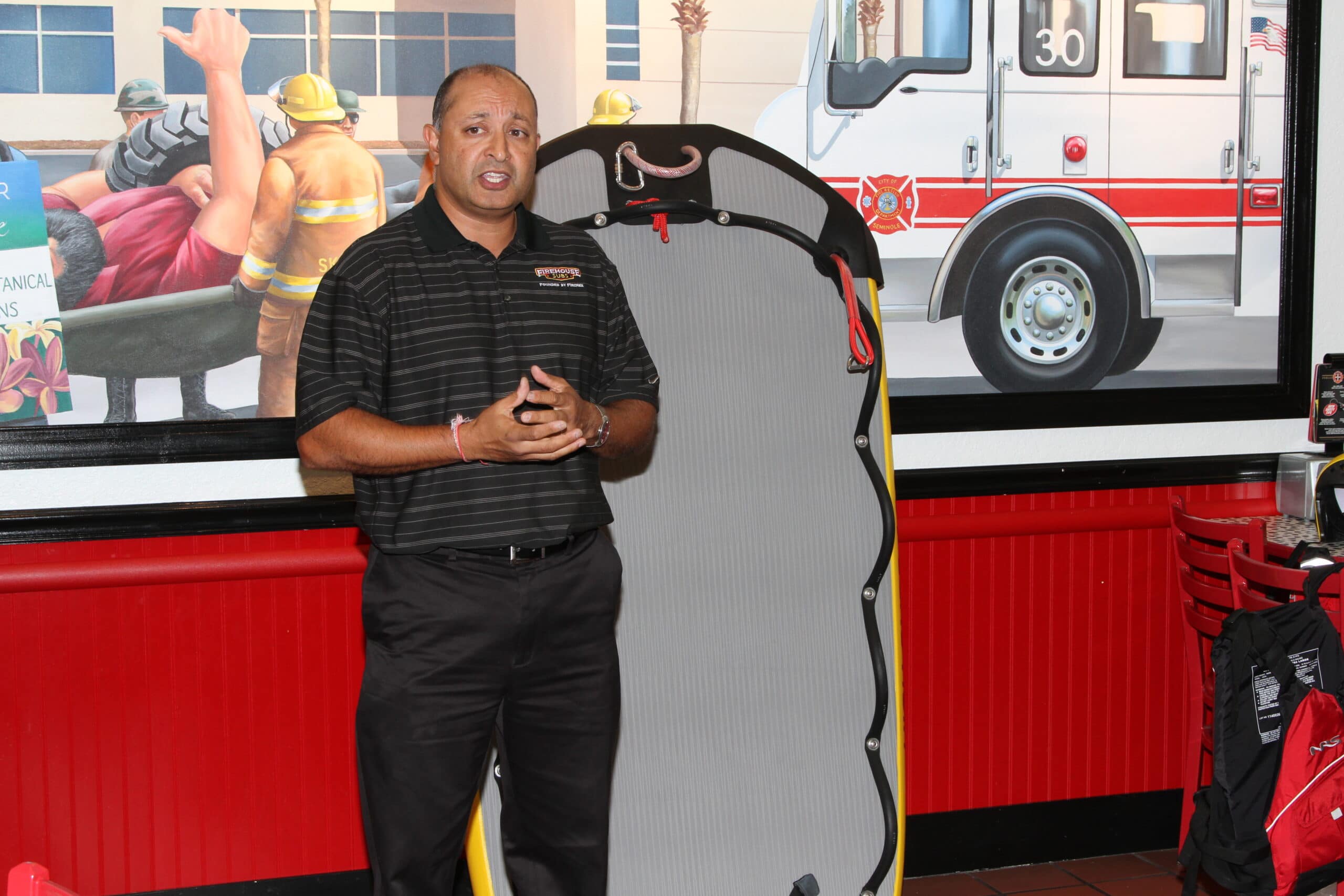 On Tuesday, October 7, 2014 a dedication event was held at the Firehouse Subs Restaurant at 10801 Starkey Road in Largo, Florida.  This event showcased their contribution to both the City of Seminole Fire Rescue and the City of Treasure Island Fire Department.  Franchise owner Sarju Patel said, “Money raised helps people and helps departments like yourselves get equipment that is live-saving.”