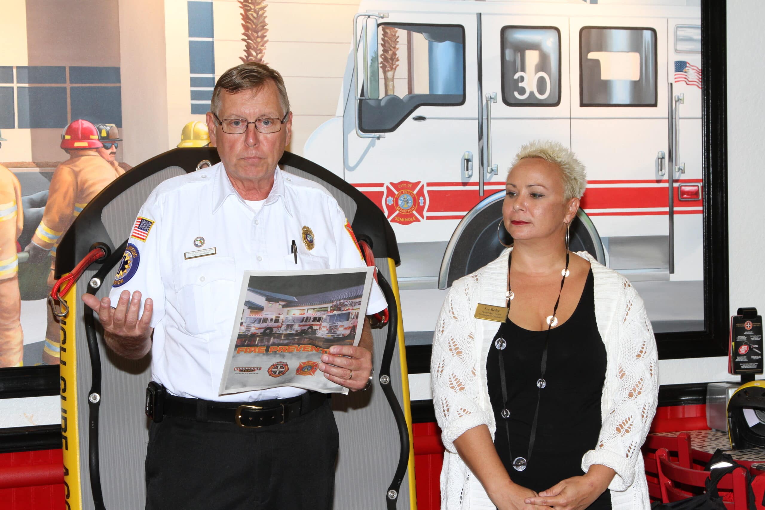 Brad Dykens of Seminole Fire Rescue discusses the “Fire Prevention” teaching tool with Sue Bedry with Tampa Bay Times Newspapers In Education looking on