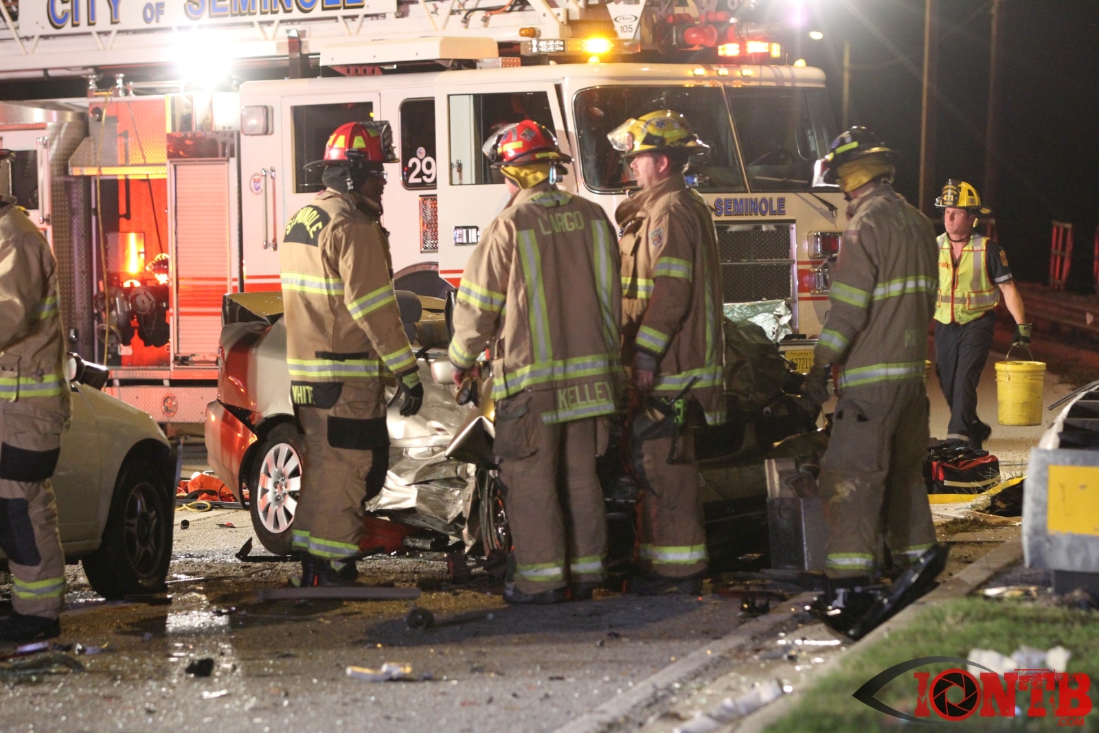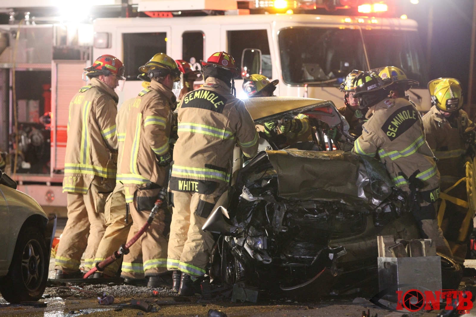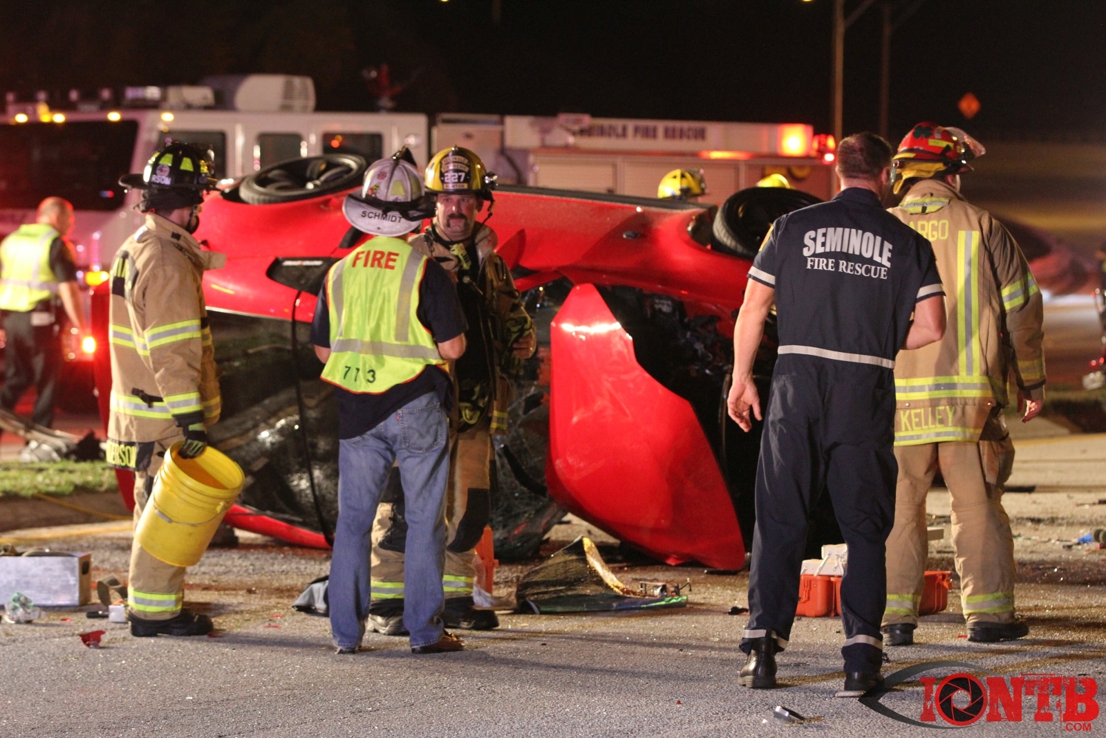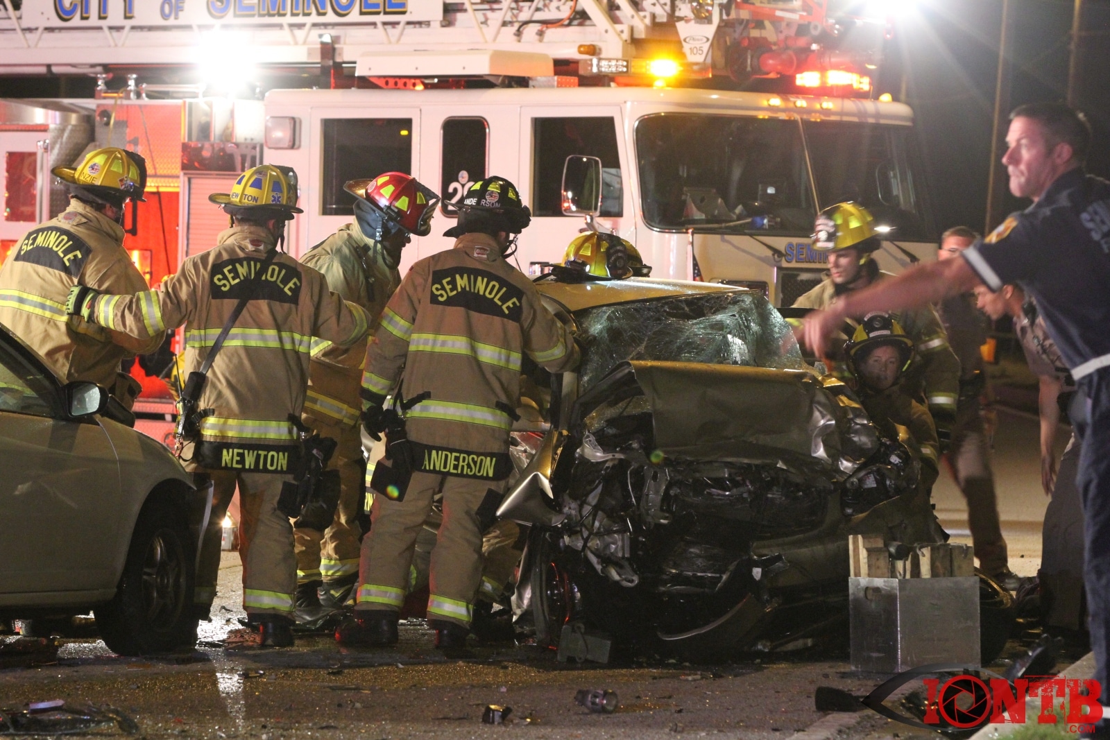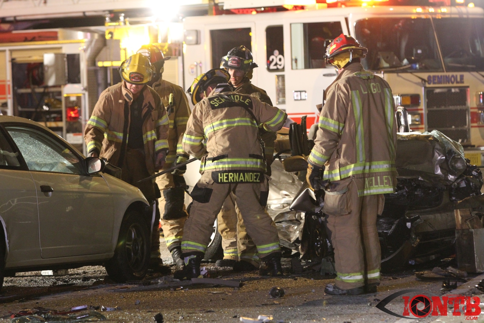 Multiple 911 calls were received following a traffic crash that occurred about 10:08 PM on Thursday, December 4, 2014.  Due to the information being provided by callers, additional units were dispatched. In the end, Seminole Fire Rescue, Largo Fire Rescue, Lealman Special Fire Control District, Florida Highway Patrol, Sunstar Paramedics, and Pinellas County Sheriff’s Office all arrived on-scene to assist. The amount of resources were needed due to the amount of hazards in the roadway, number of patient and the extent of their injuries.
