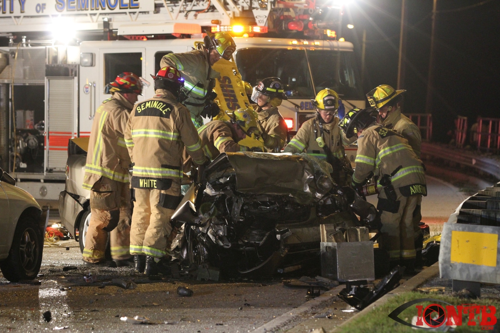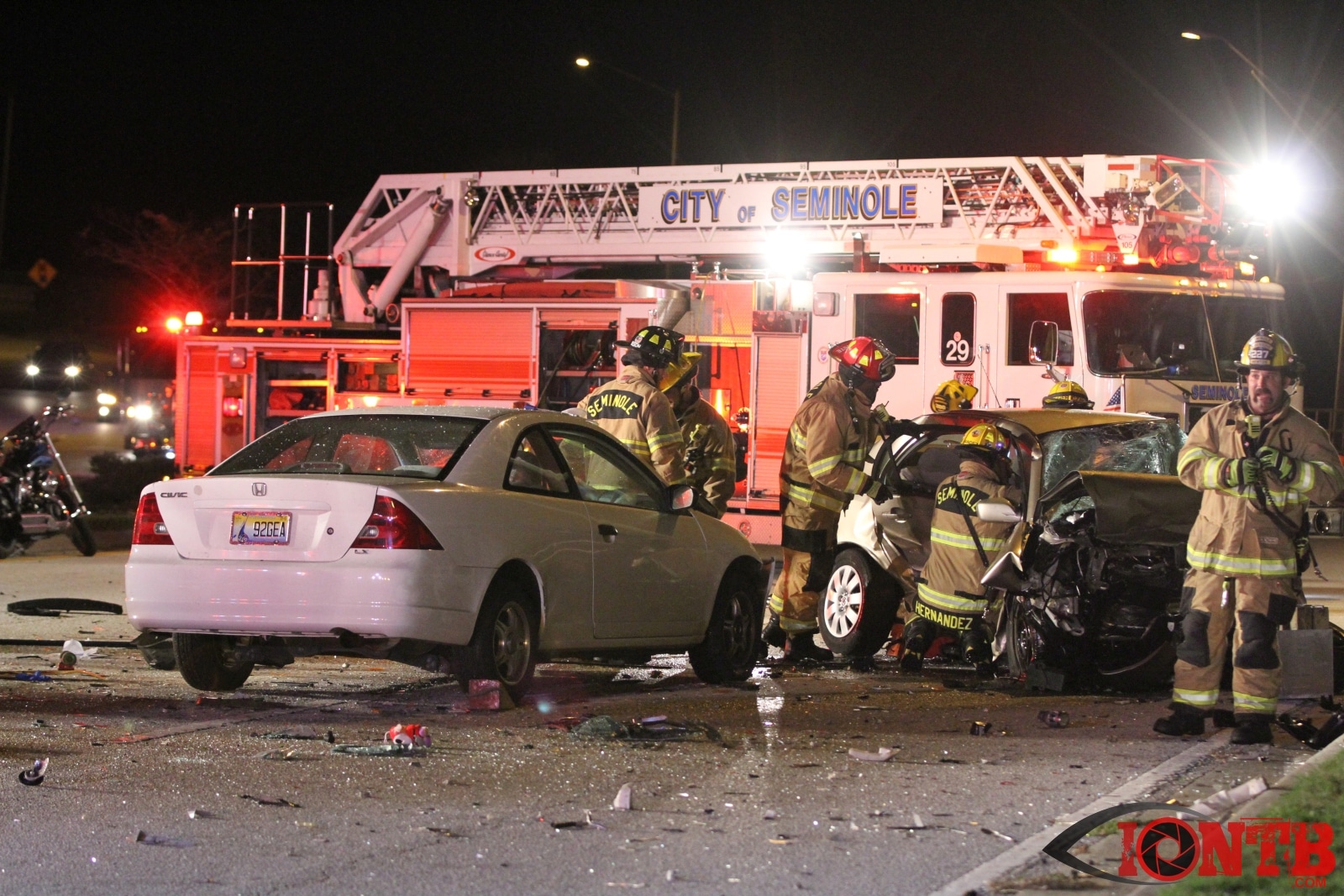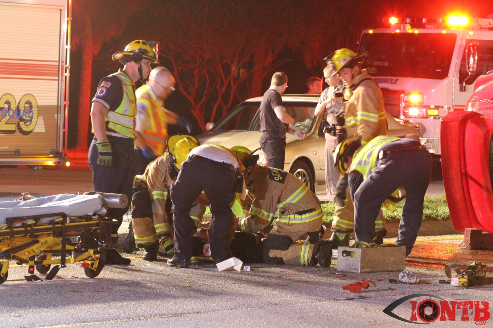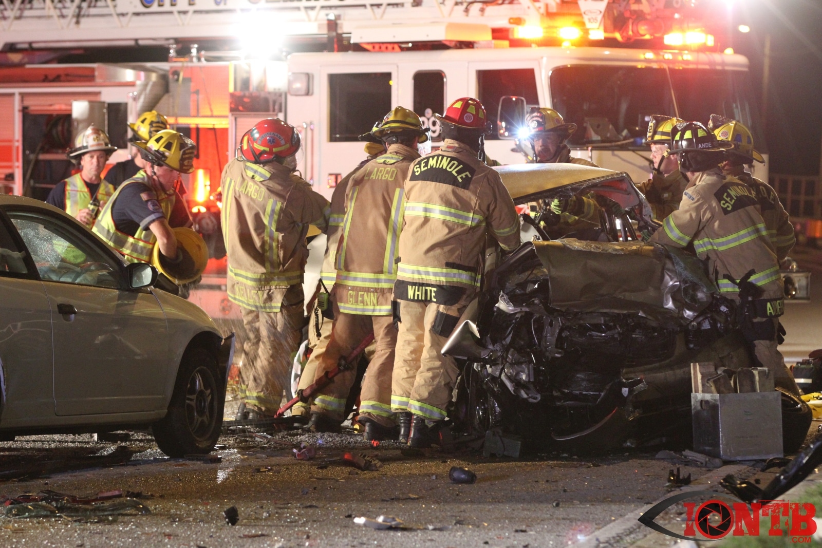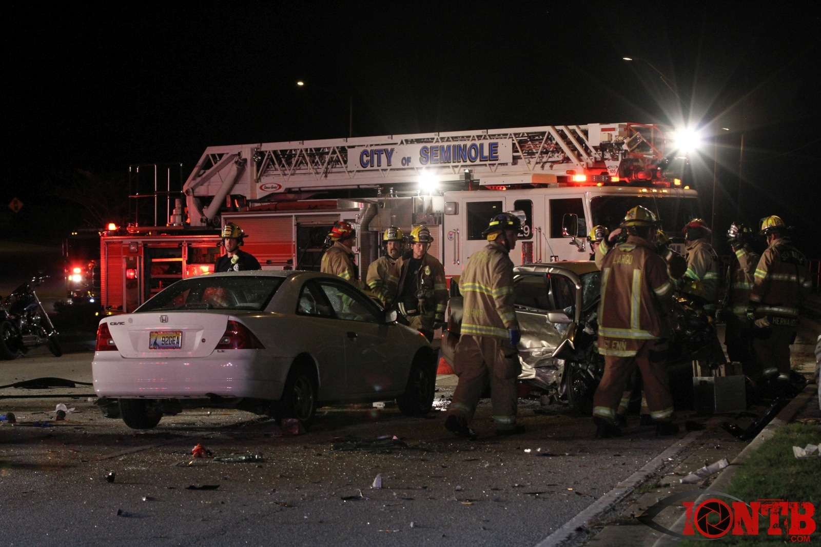 Multiple 911 calls were received following a traffic crash that occurred about 10:08 PM on Thursday, December 4, 2014.  Due to the information being provided by callers, additional units were dispatched. In the end, Seminole Fire Rescue, Largo Fire Rescue, Lealman Special Fire Control District, Florida Highway Patrol, Sunstar Paramedics, and Pinellas County Sheriff’s Office all arrived on-scene to assist. The amount of resources were needed due to the amount of hazards in the roadway, number of patient and the extent of their injuries.
