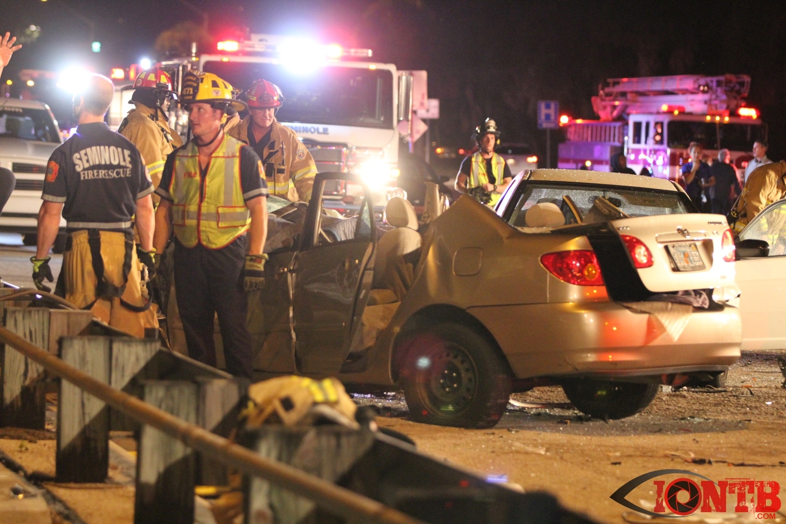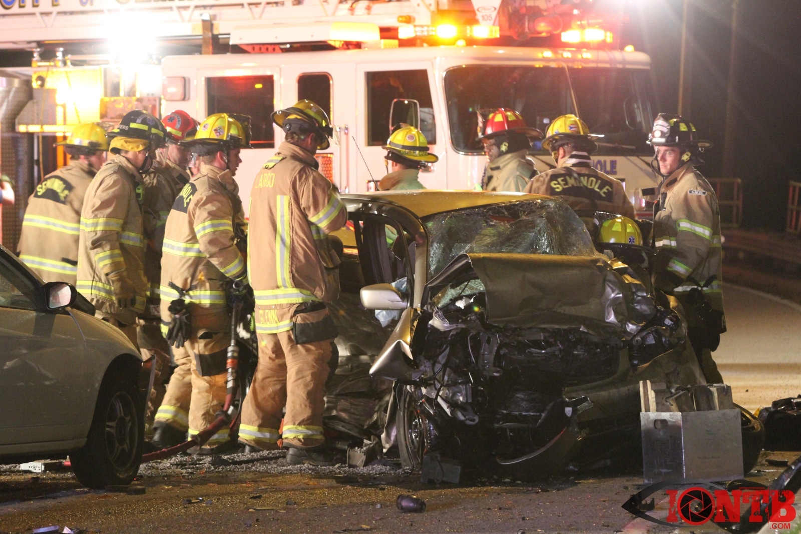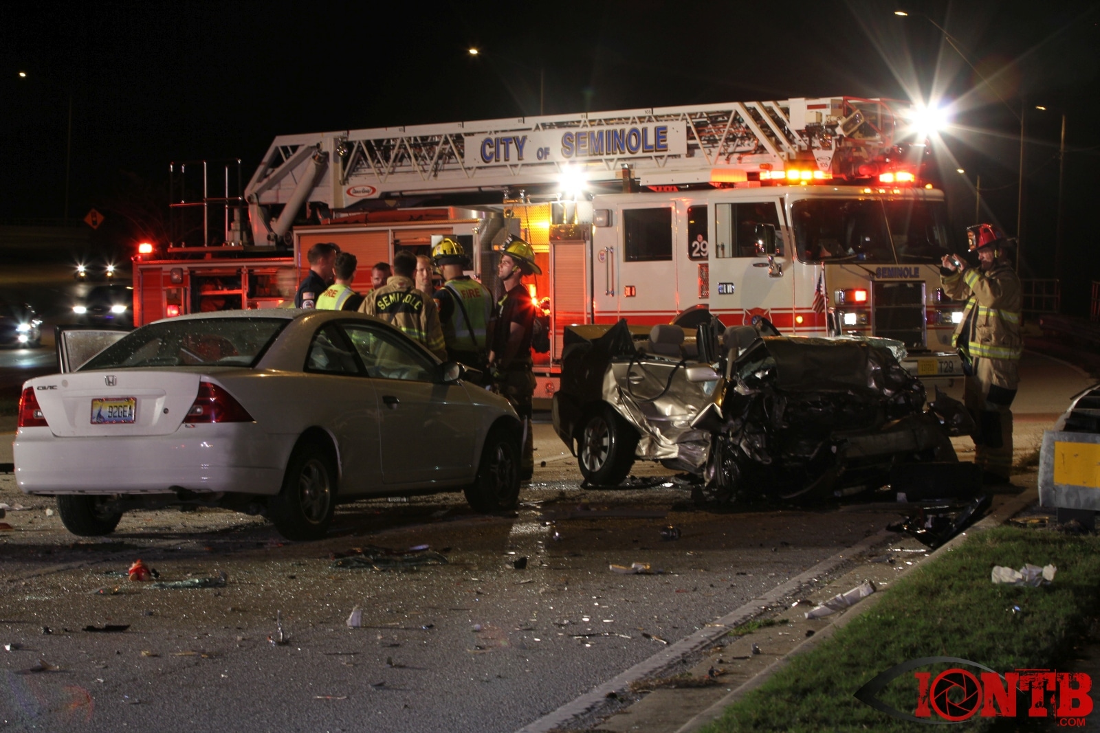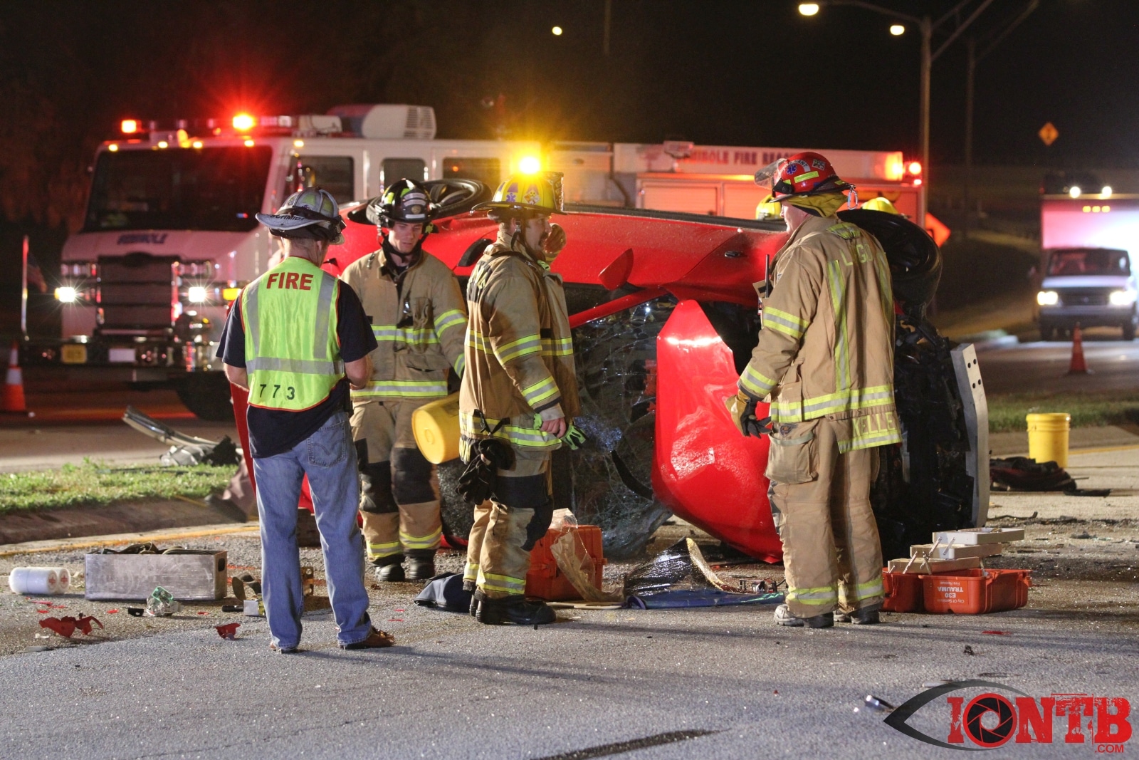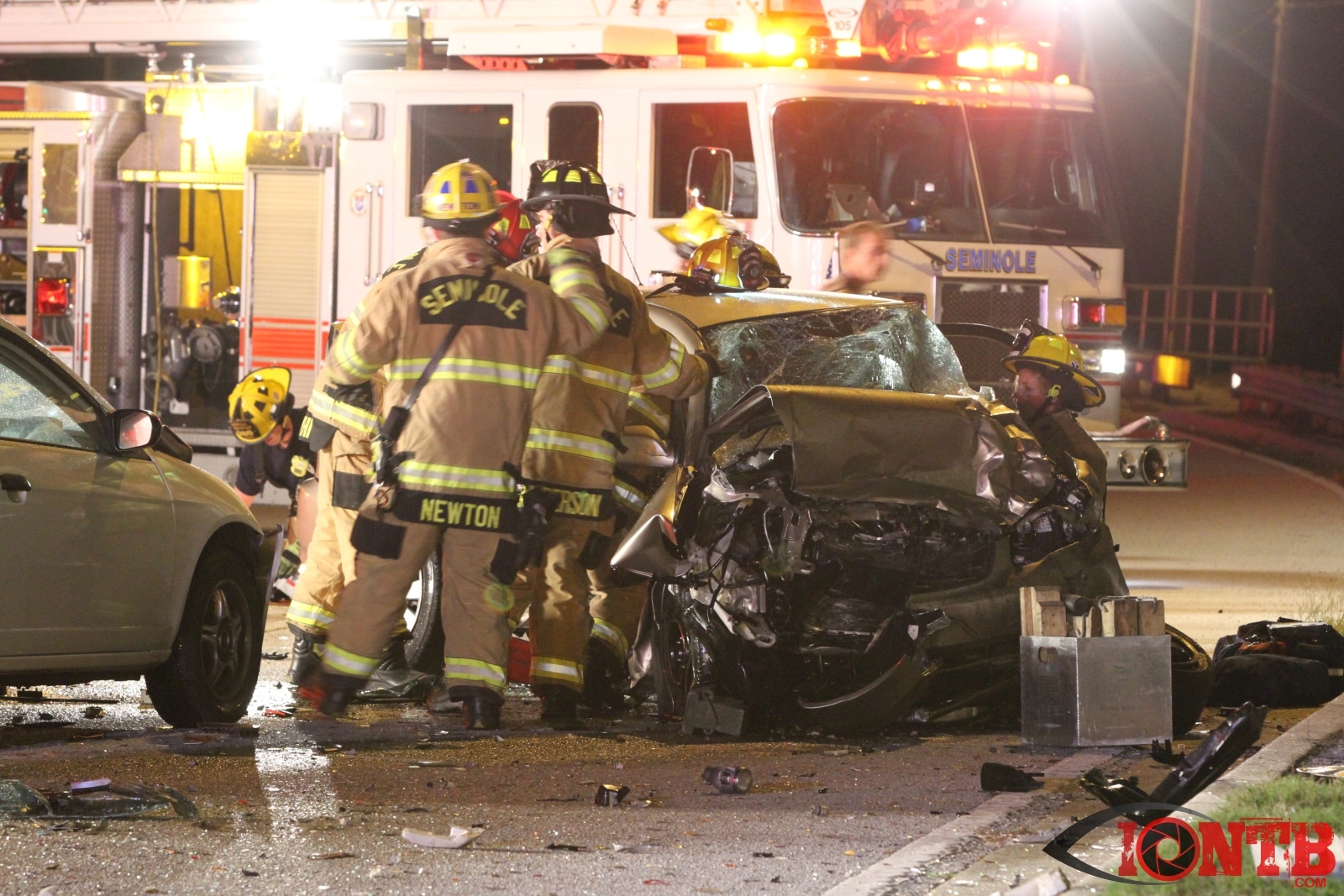 Multiple 911 calls were received following a traffic crash that occurred about 10:08 PM on Thursday, December 4, 2014.  Due to the information being provided by callers, additional units were dispatched. In the end, Seminole Fire Rescue, Largo Fire Rescue, Lealman Special Fire Control District, Florida Highway Patrol, Sunstar Paramedics, and Pinellas County Sheriff’s Office all arrived on-scene to assist. The amount of resources were needed due to the amount of hazards in the roadway, number of patient and the extent of their injuries.