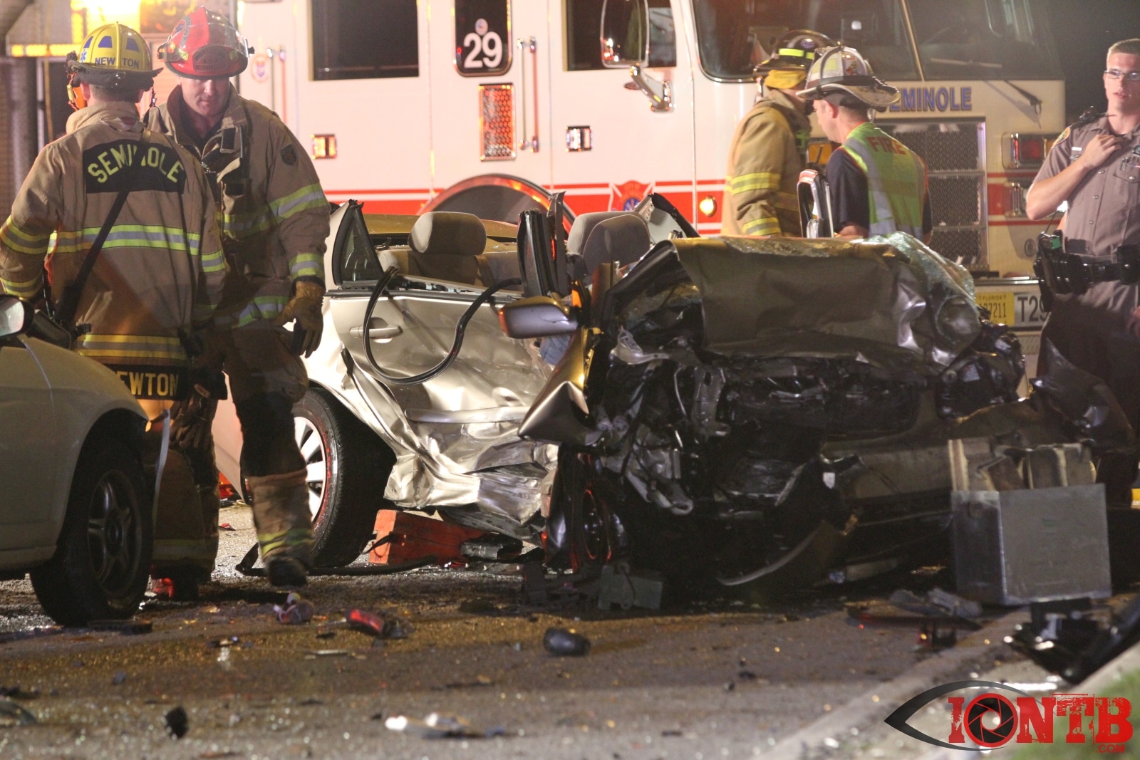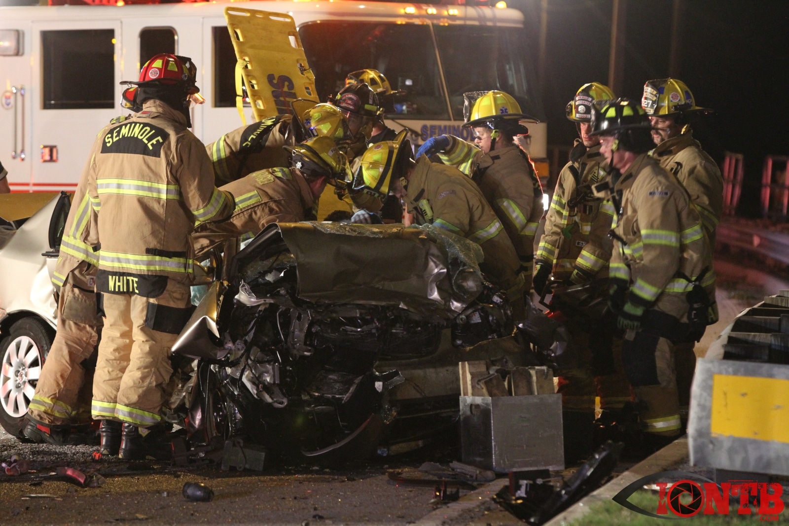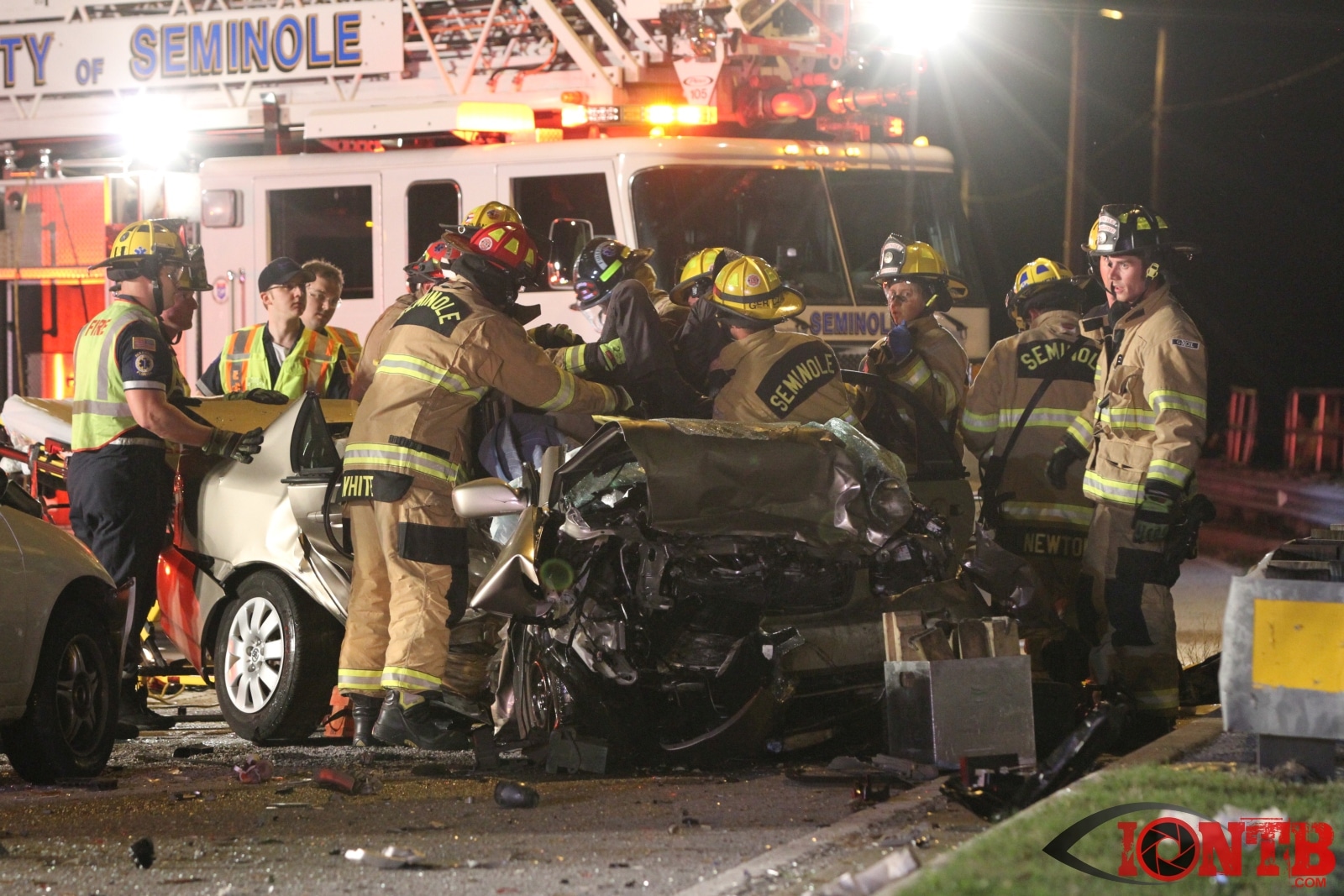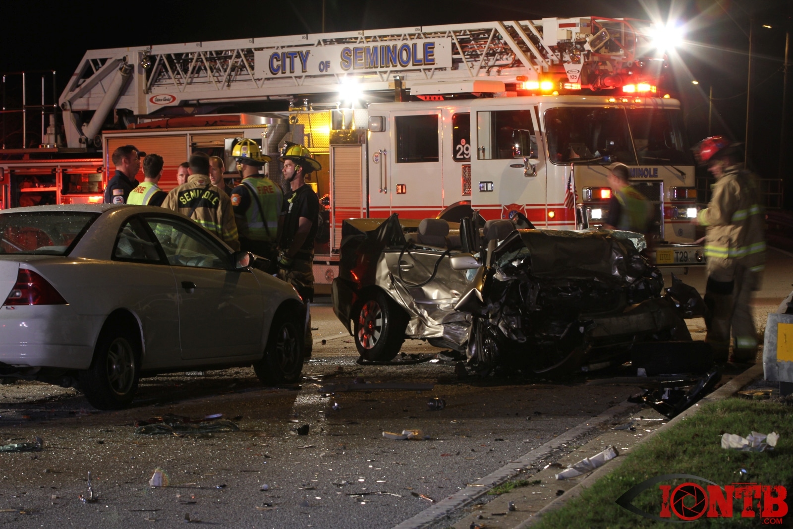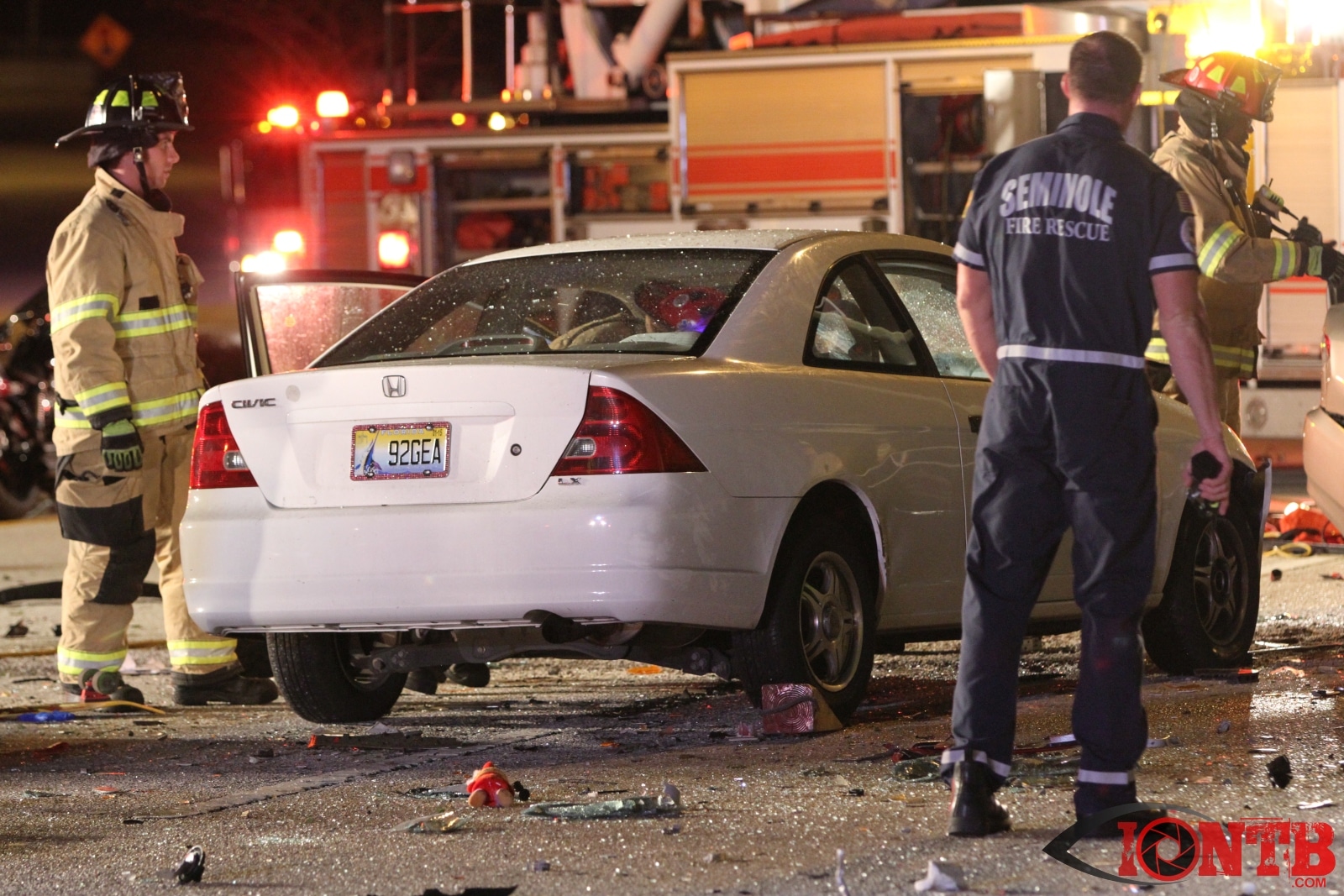 Multiple 911 calls were received following a traffic crash that occurred about 10:08 PM on Thursday, December 4, 2014.  Due to the information being provided by callers, additional units were dispatched. In the end, Seminole Fire Rescue, Largo Fire Rescue, Lealman Special Fire Control District, Florida Highway Patrol, Sunstar Paramedics, and Pinellas County Sheriff’s Office all arrived on-scene to assist. The amount of resources were needed due to the amount of hazards in the roadway, number of patient and the extent of their injuries.