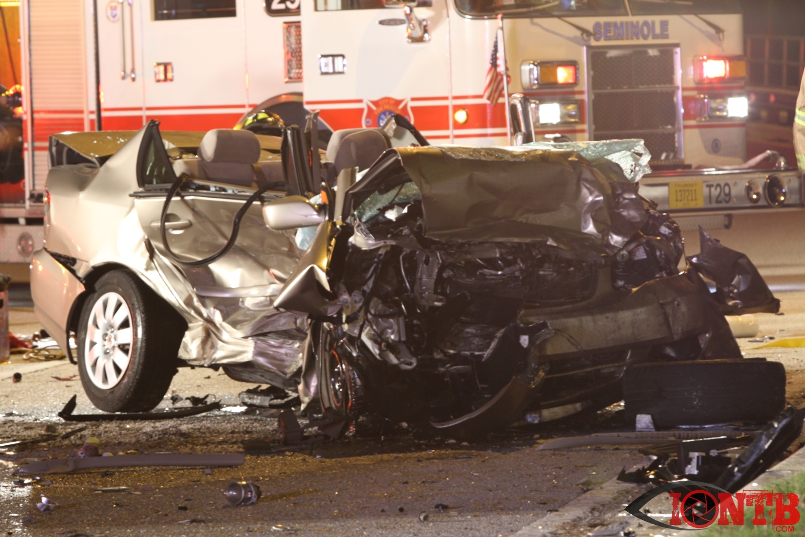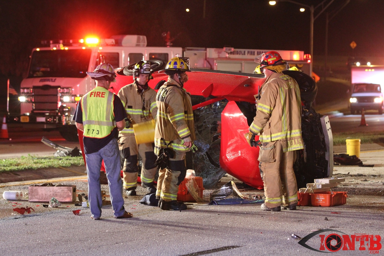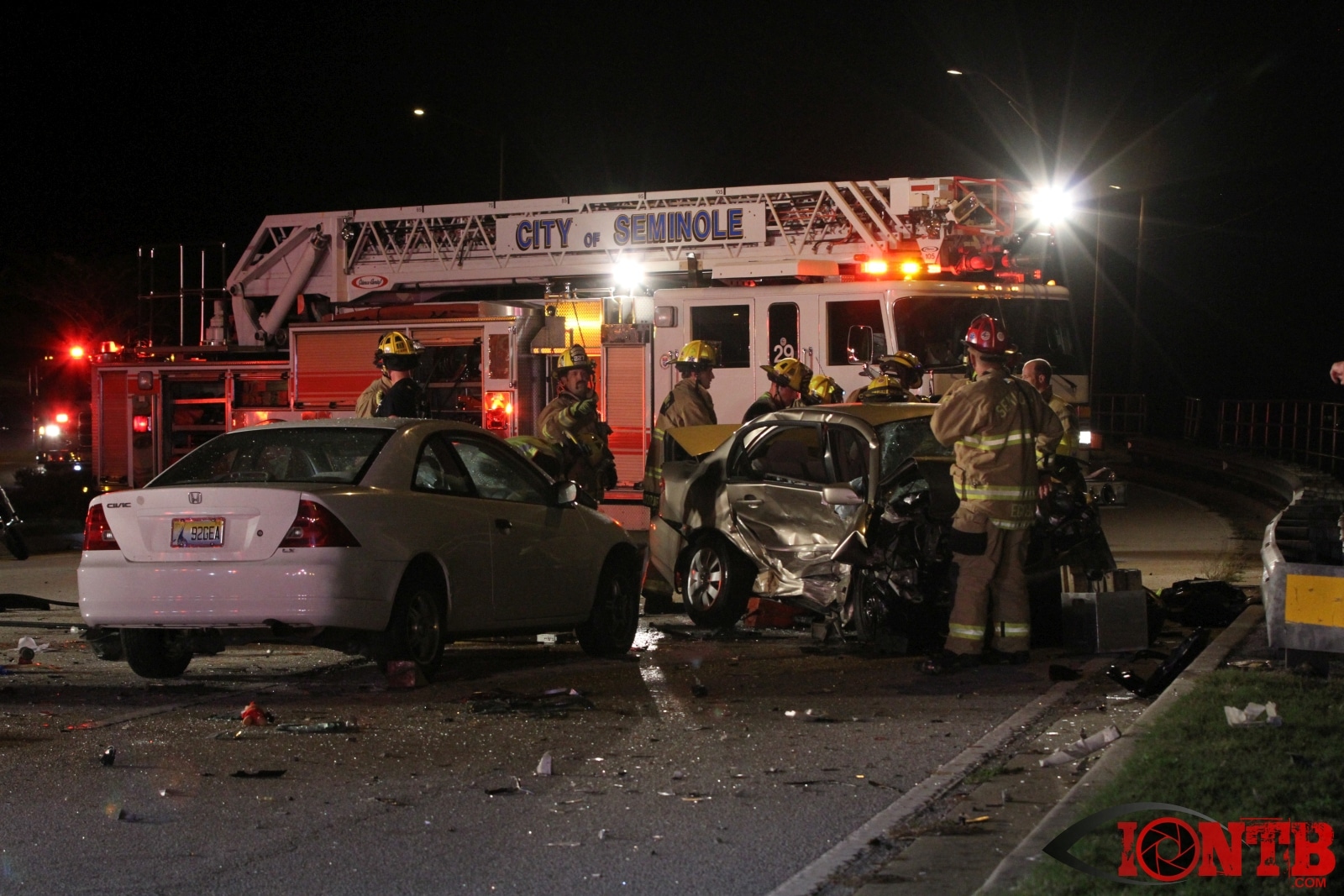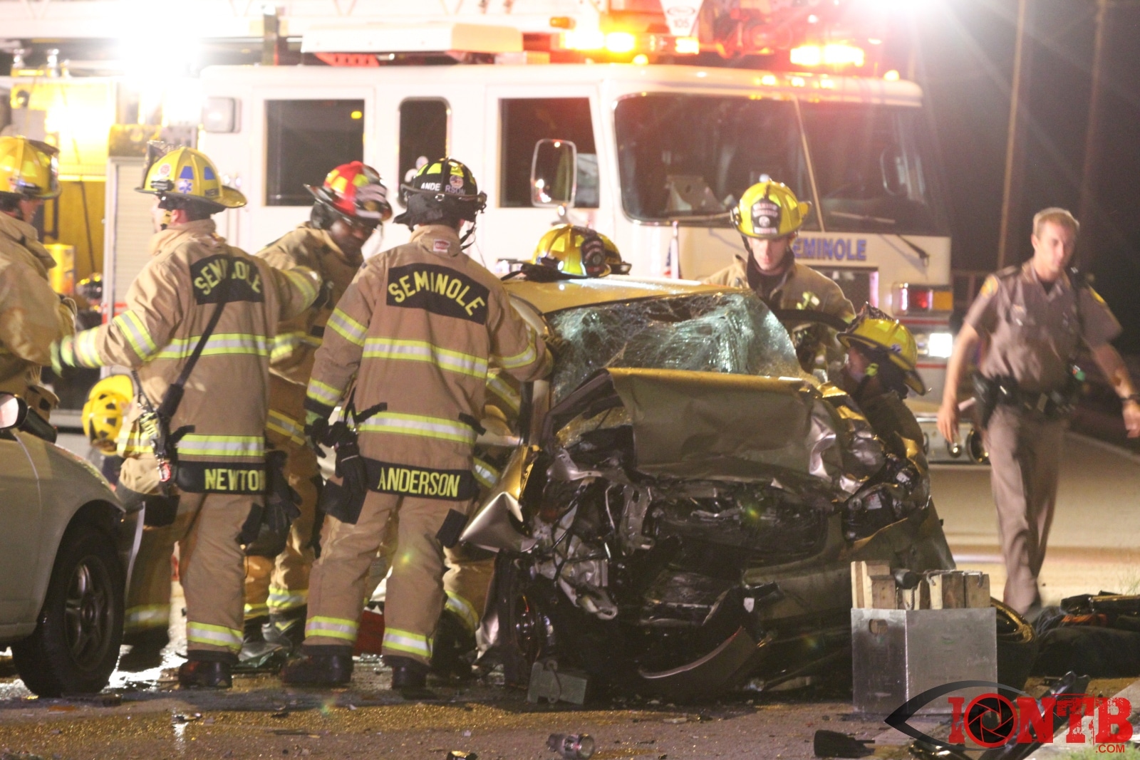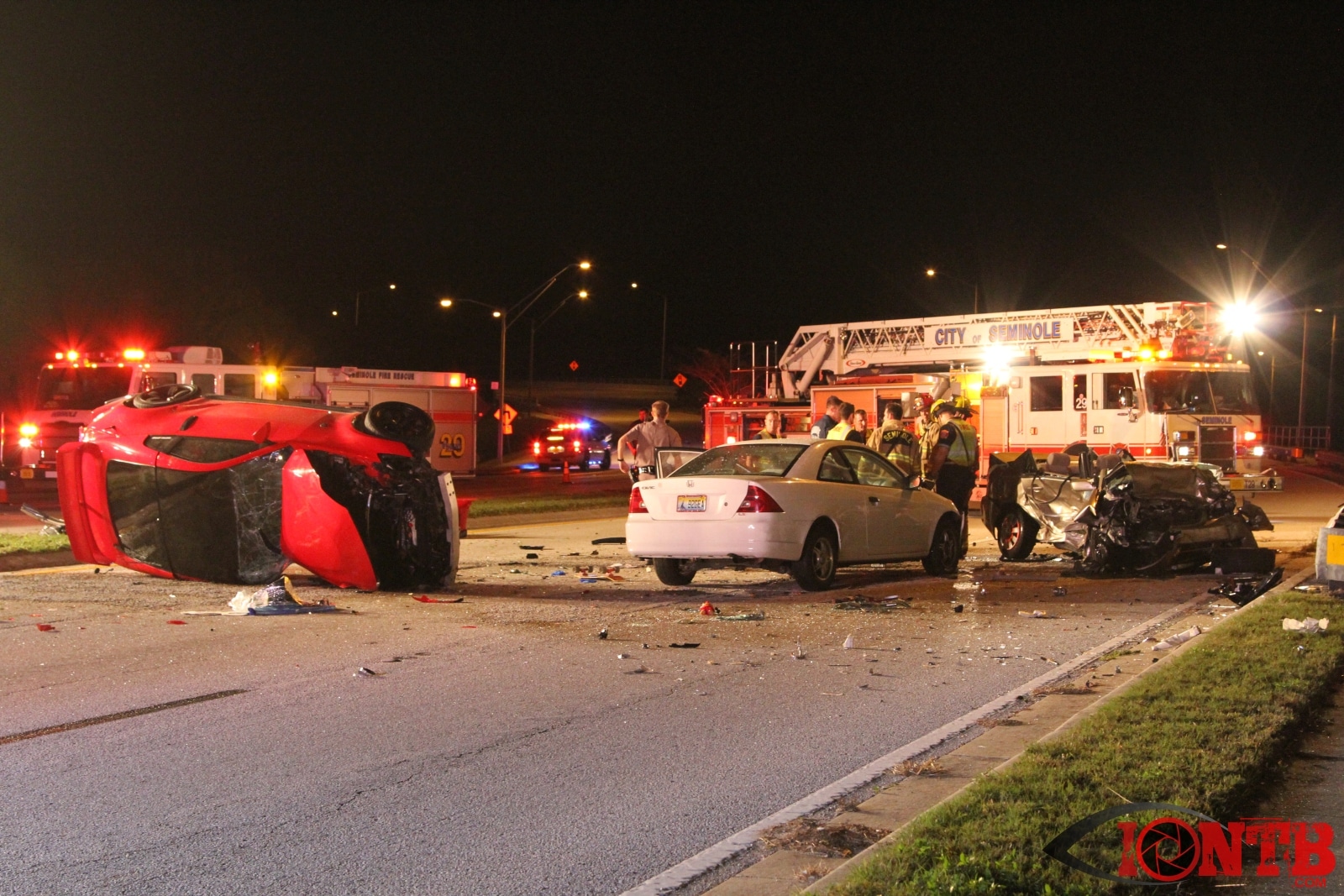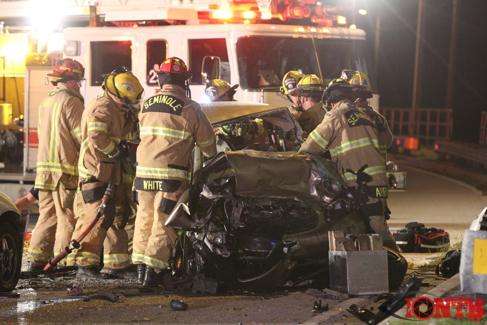 Multiple 911 calls were received following a traffic crash that occurred about 10:08 PM on Thursday, December 4, 2014.  Due to the information being provided by callers, additional units were dispatched. In the end, Seminole Fire Rescue, Largo Fire Rescue, Lealman Special Fire Control District, Florida Highway Patrol, Sunstar Paramedics, and Pinellas County Sheriff’s Office all arrived on-scene to assist. The amount of resources were needed due to the amount of hazards in the roadway, number of patient and the extent of their injuries.