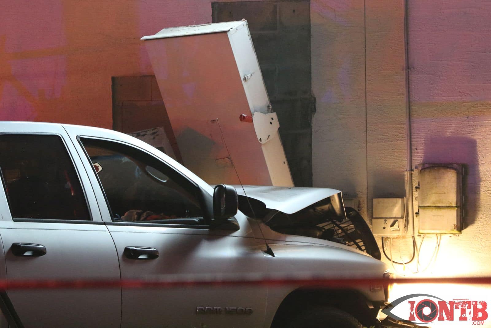 The truck damaged the exterior of the building including a large electrical panel mounted on the wall. Duke Energy arrived to deenergize the box so crews could safely operate around the vehicle.