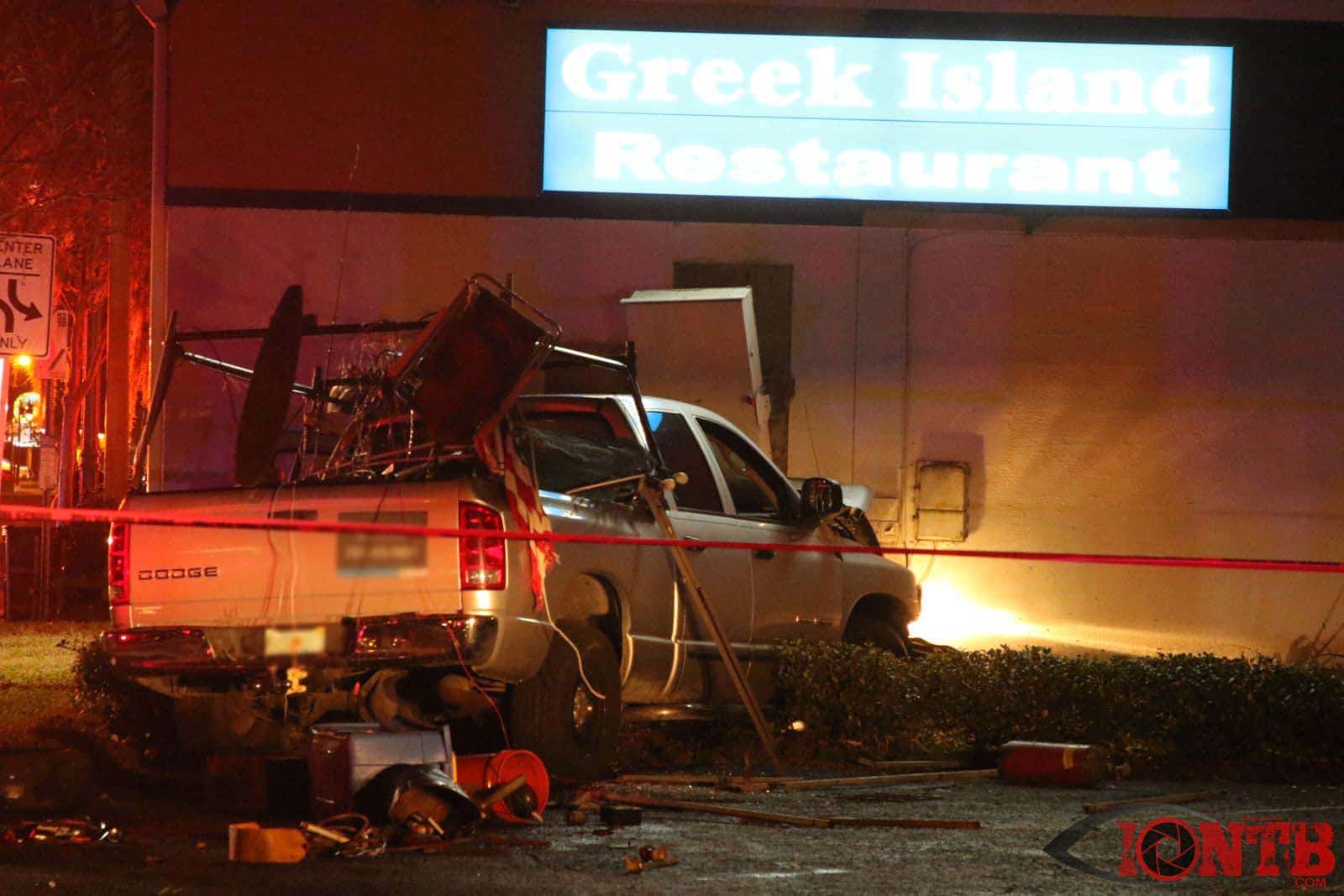 The male driver of a pickup truck lost control of his vehicle which impacted the north side of the Greek Island Restaurant. The driver was transported by ambulance to a local hospital with non life-threatening injuries.