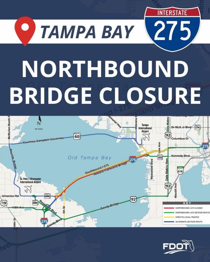 Drivers are advised to allow additional travel time, as congestion and delays are possible along detour roadways. Southbound I-275 travel lanes, from Tampa to St. Petersburg, will remain open and are not affected.