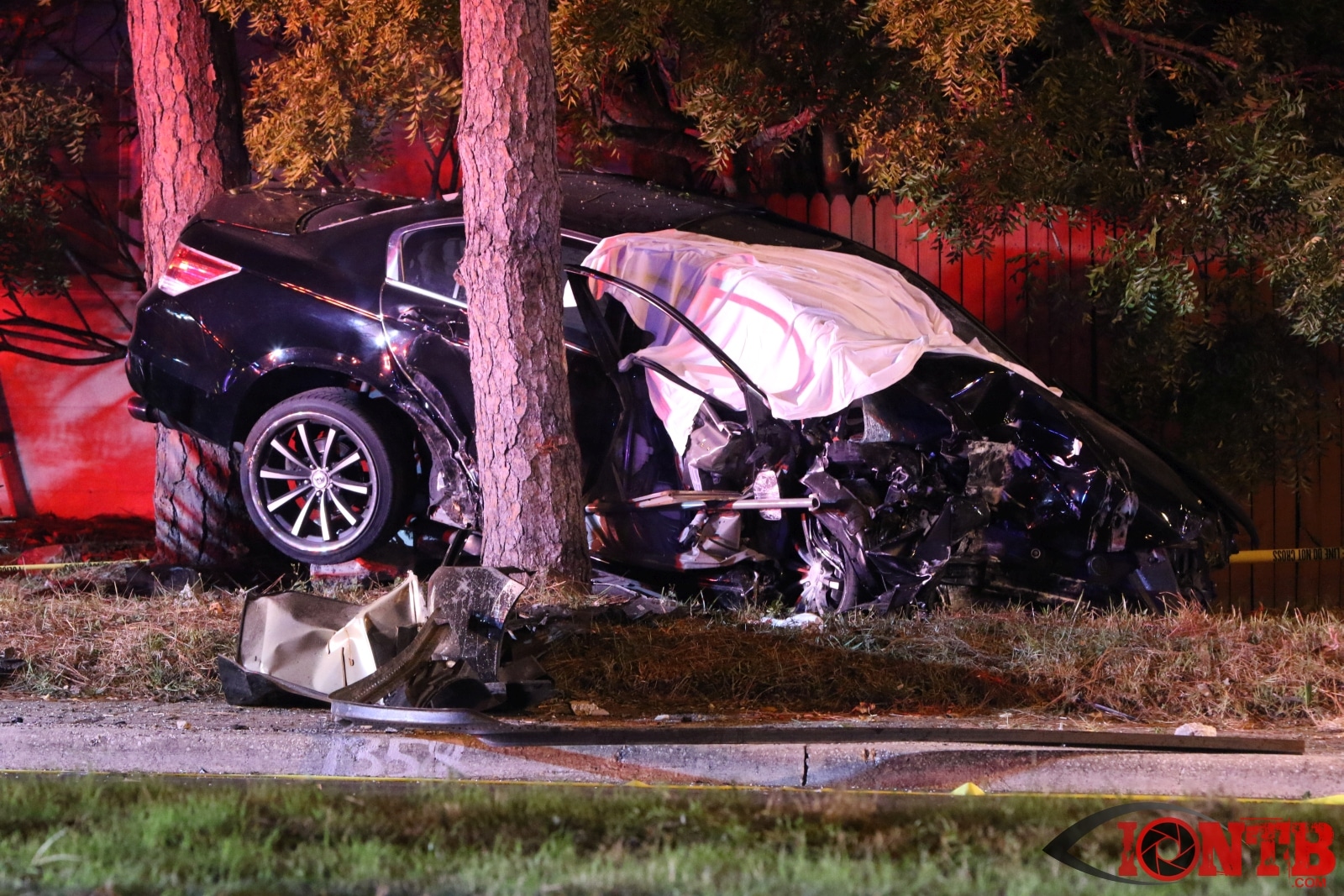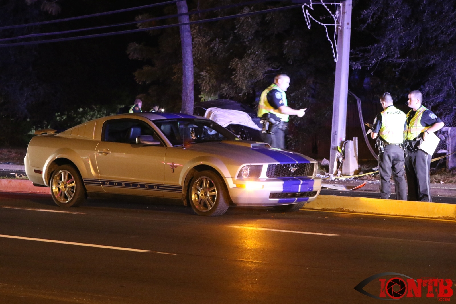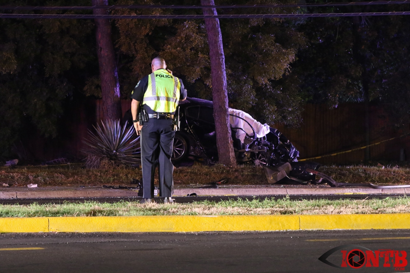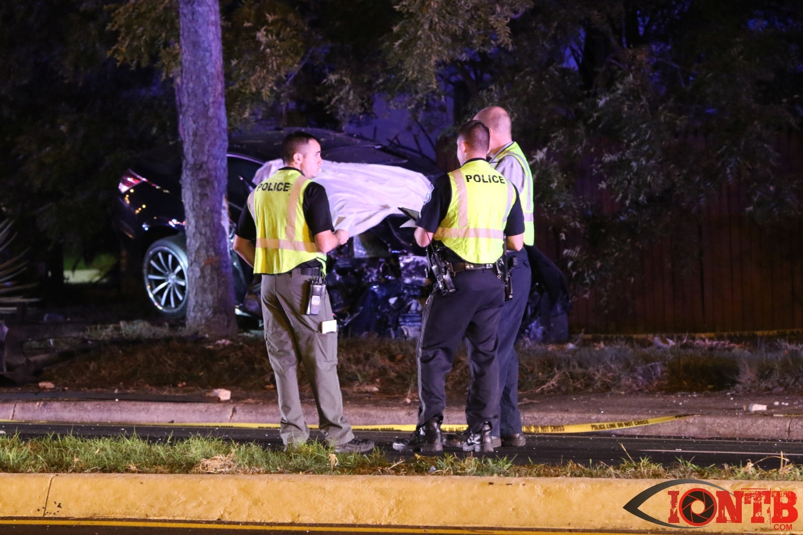 The crash occurred in the southbound lanes of 66th Street just south of 102nd Avenue N.  The vehicle crash was proceeded with a report from a Pinellas County Sheriff’s Deputy of, “2 cars doing over 100 mph southbound on 66th street blowing red lights, I am not in pursuit.”  Shortly thereafter, one of the cars crashed into a utility pole and tree.  The deputy reported that the vehicle was full of smoke and that there was entrapment.  Flames were also seen but were put out by a fire extinguisher prior to arrival by the fire department.