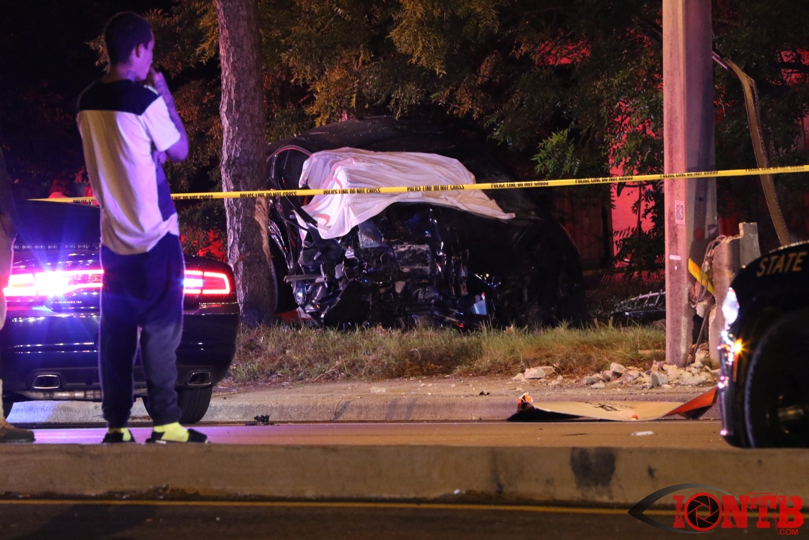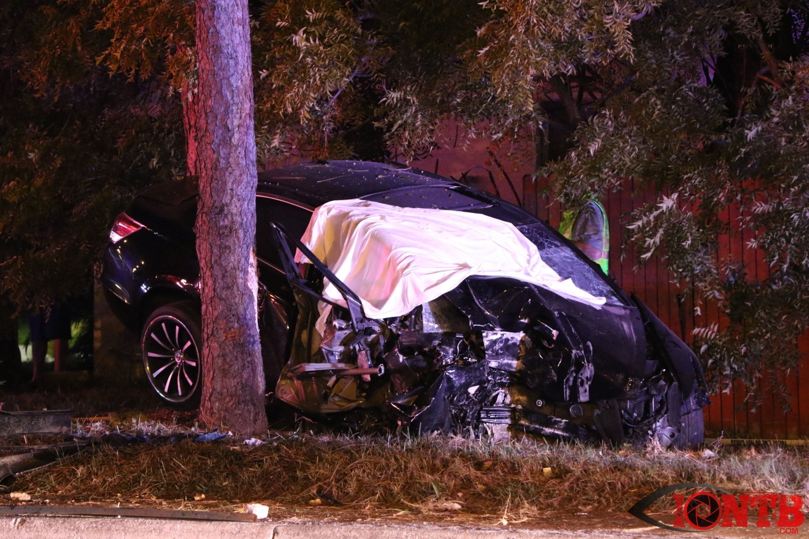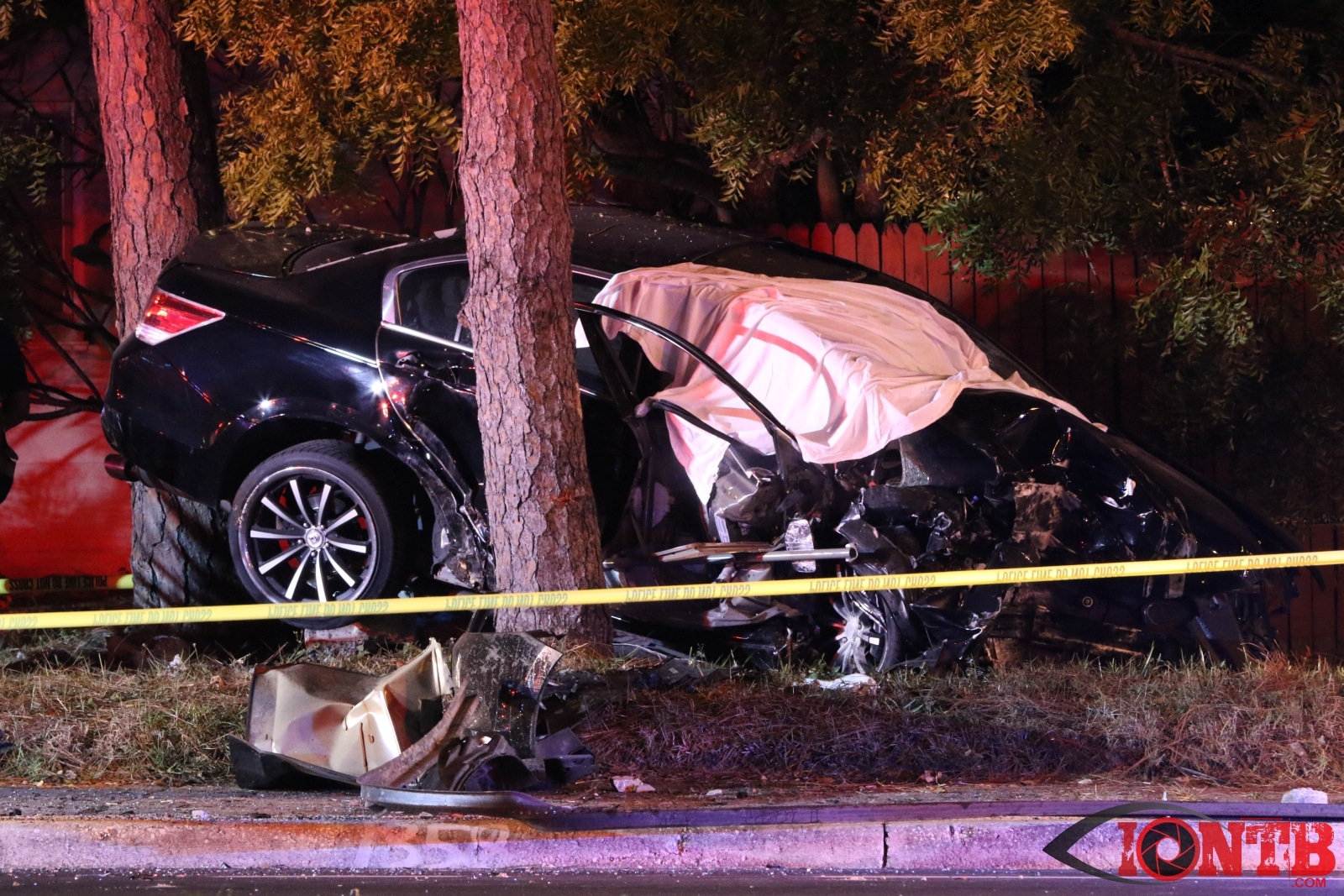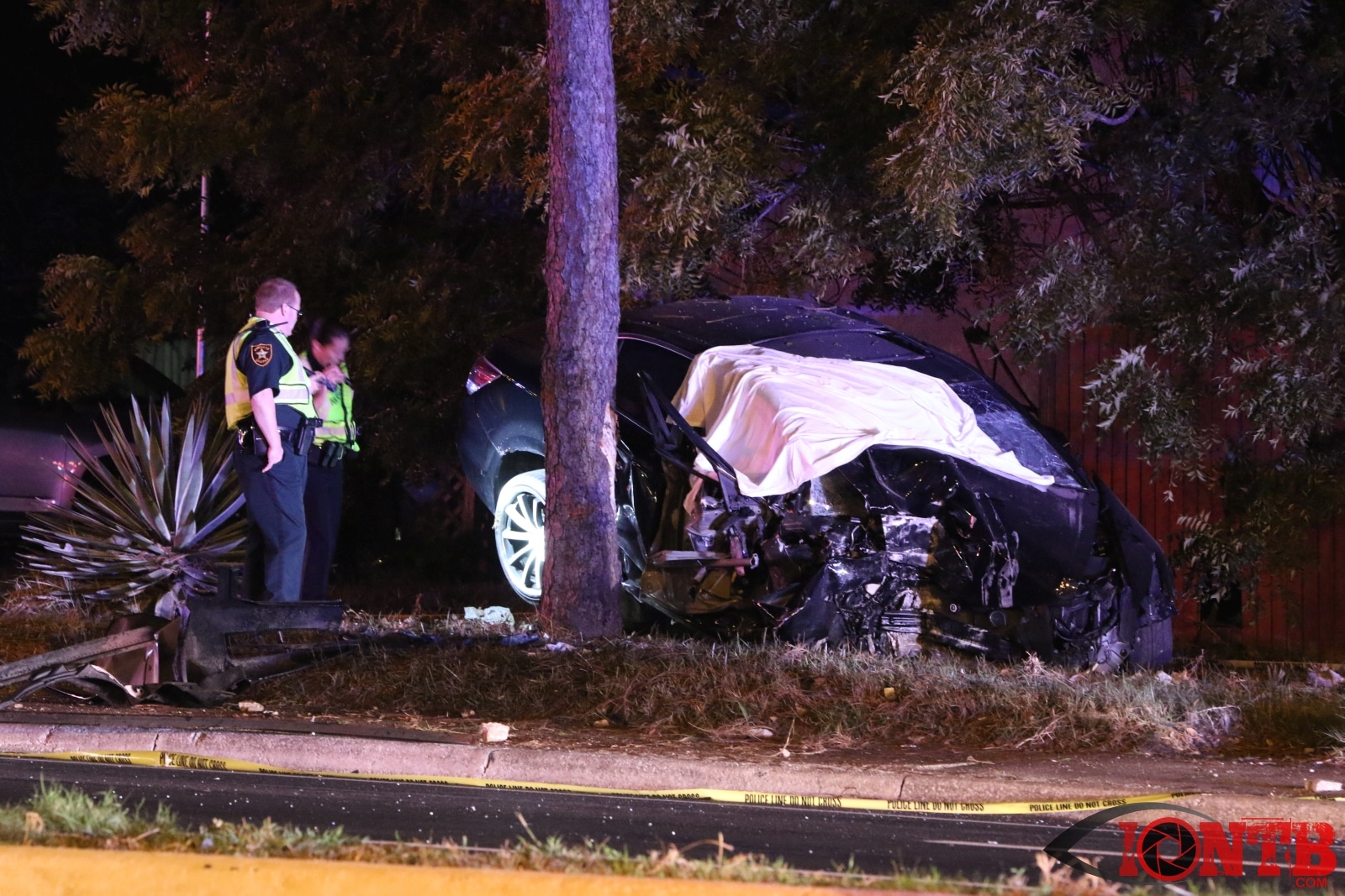 The crash occurred in the southbound lanes of 66th Street just south of 102nd Avenue N.  The vehicle crash was proceeded with a report from a Pinellas County Sheriff’s Deputy of, “2 cars doing over 100 mph southbound on 66th street blowing red lights, I am not in pursuit.”  Shortly thereafter, one of the cars crashed into a utility pole and tree.  The deputy reported that the vehicle was full of smoke and that there was entrapment.  Flames were also seen but were put out by a fire extinguisher prior to arrival by the fire department.