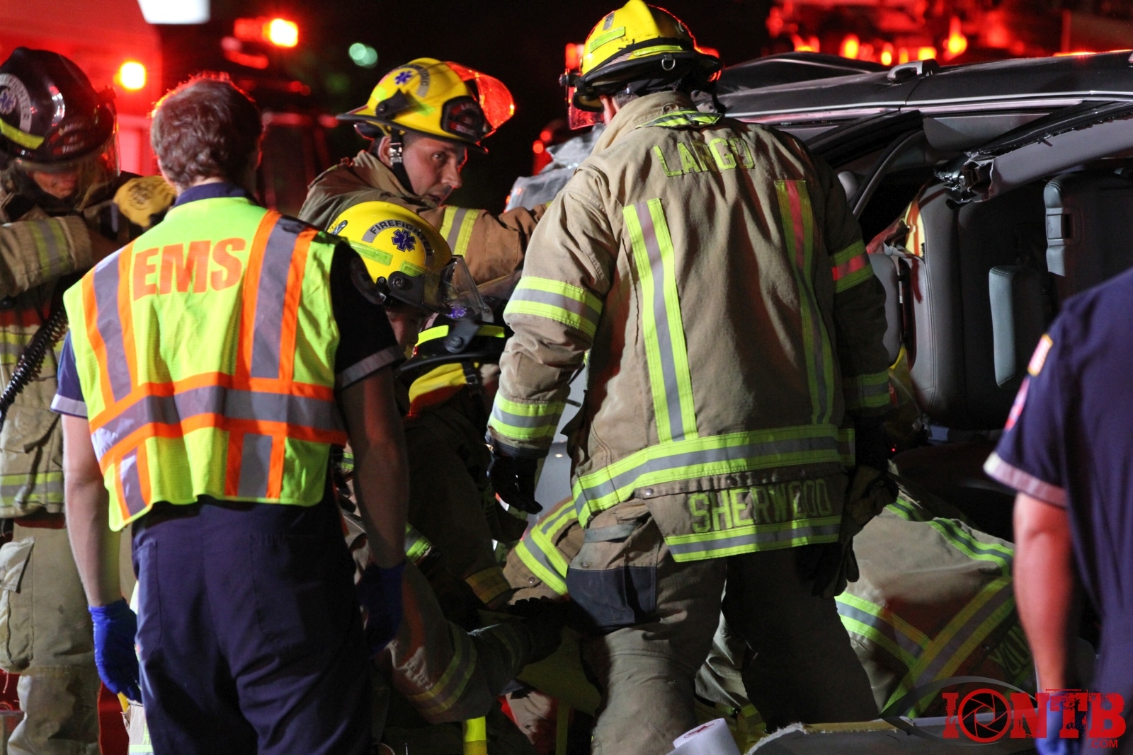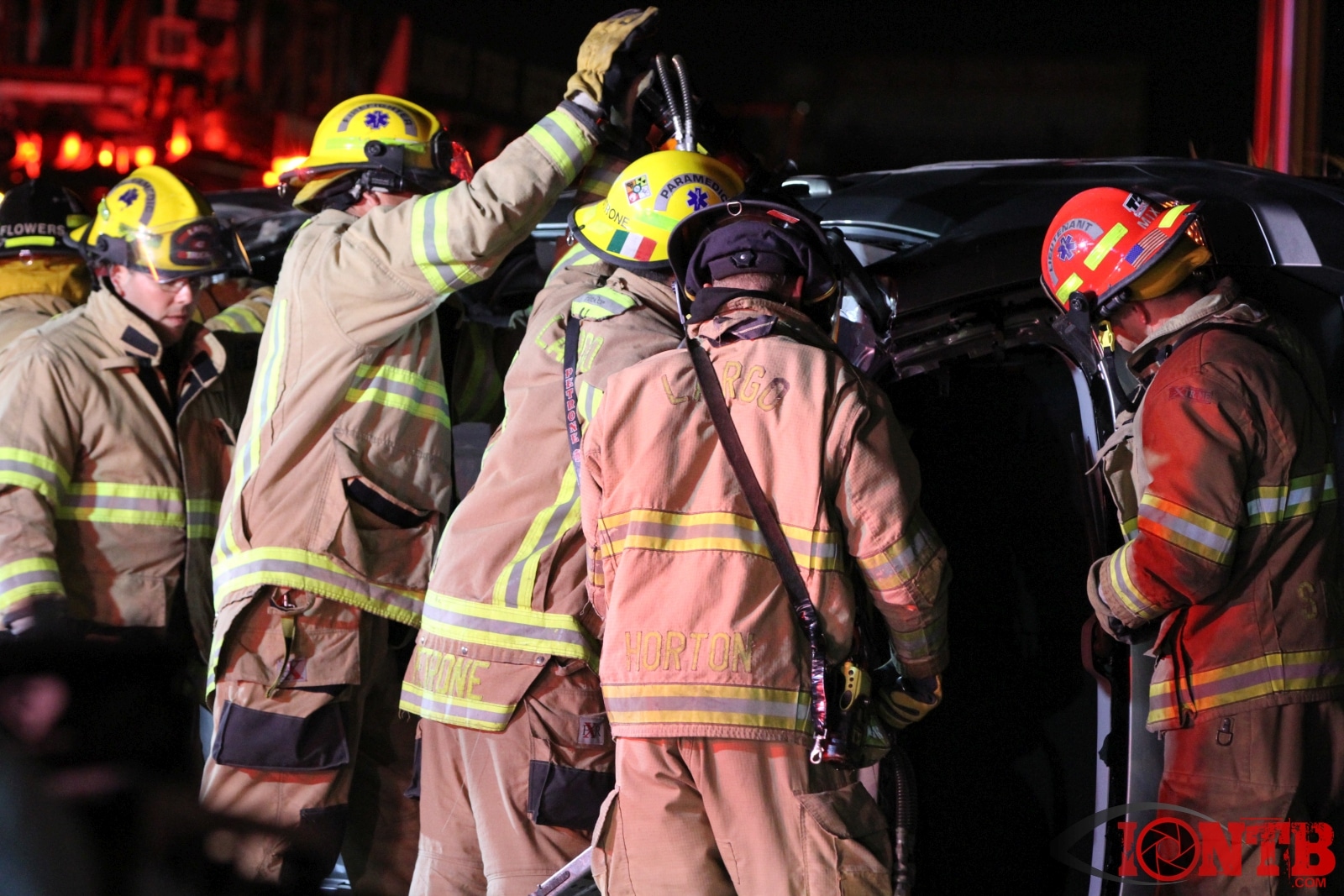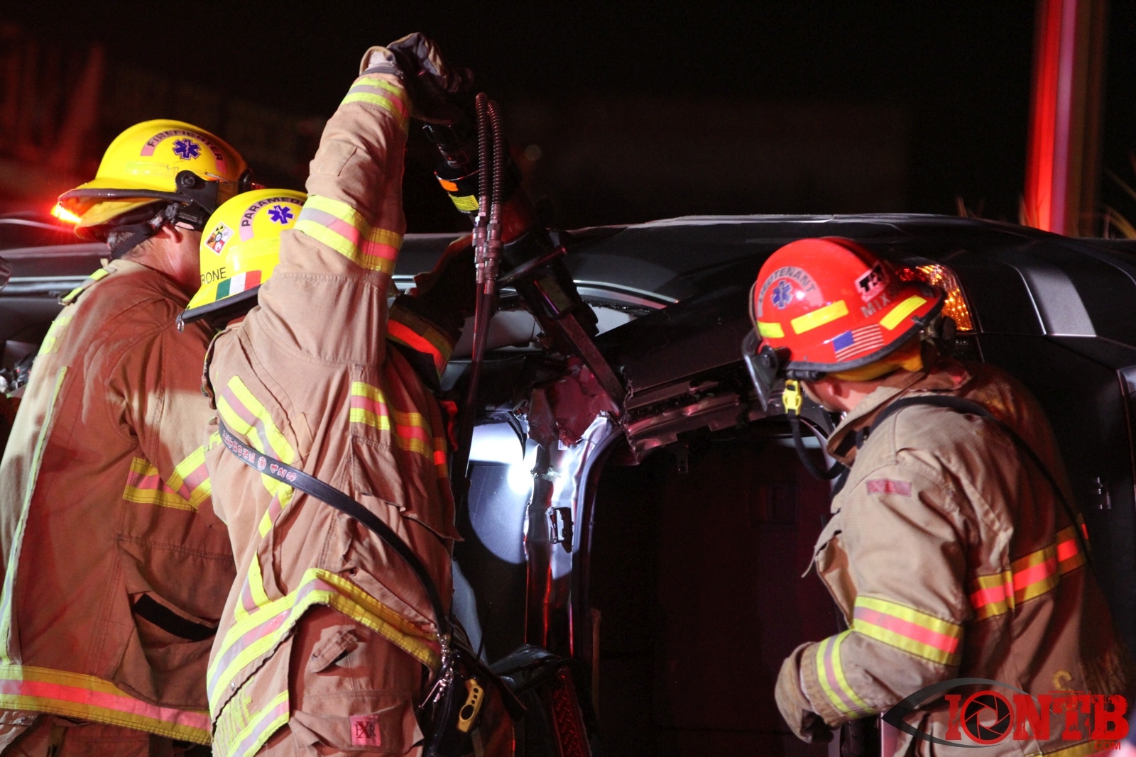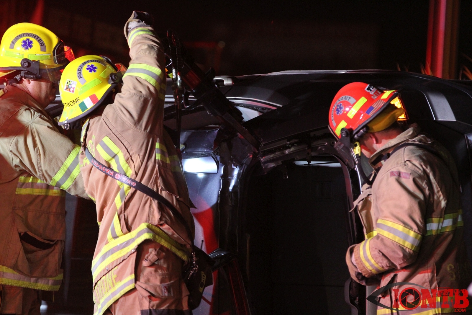 Arriving crews requested additional assistance since the driver of the vehicle was entrapped in the vehicle. An extrication operation began and continued while multiple firefighters removed the top of the vehicle.