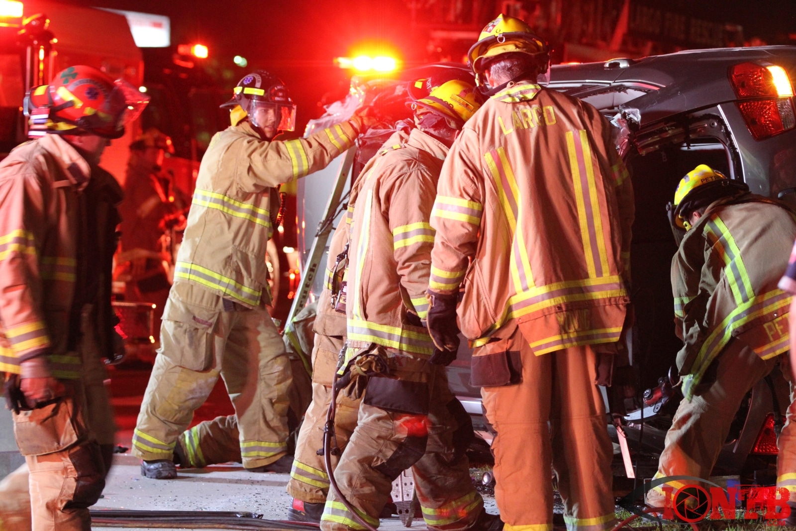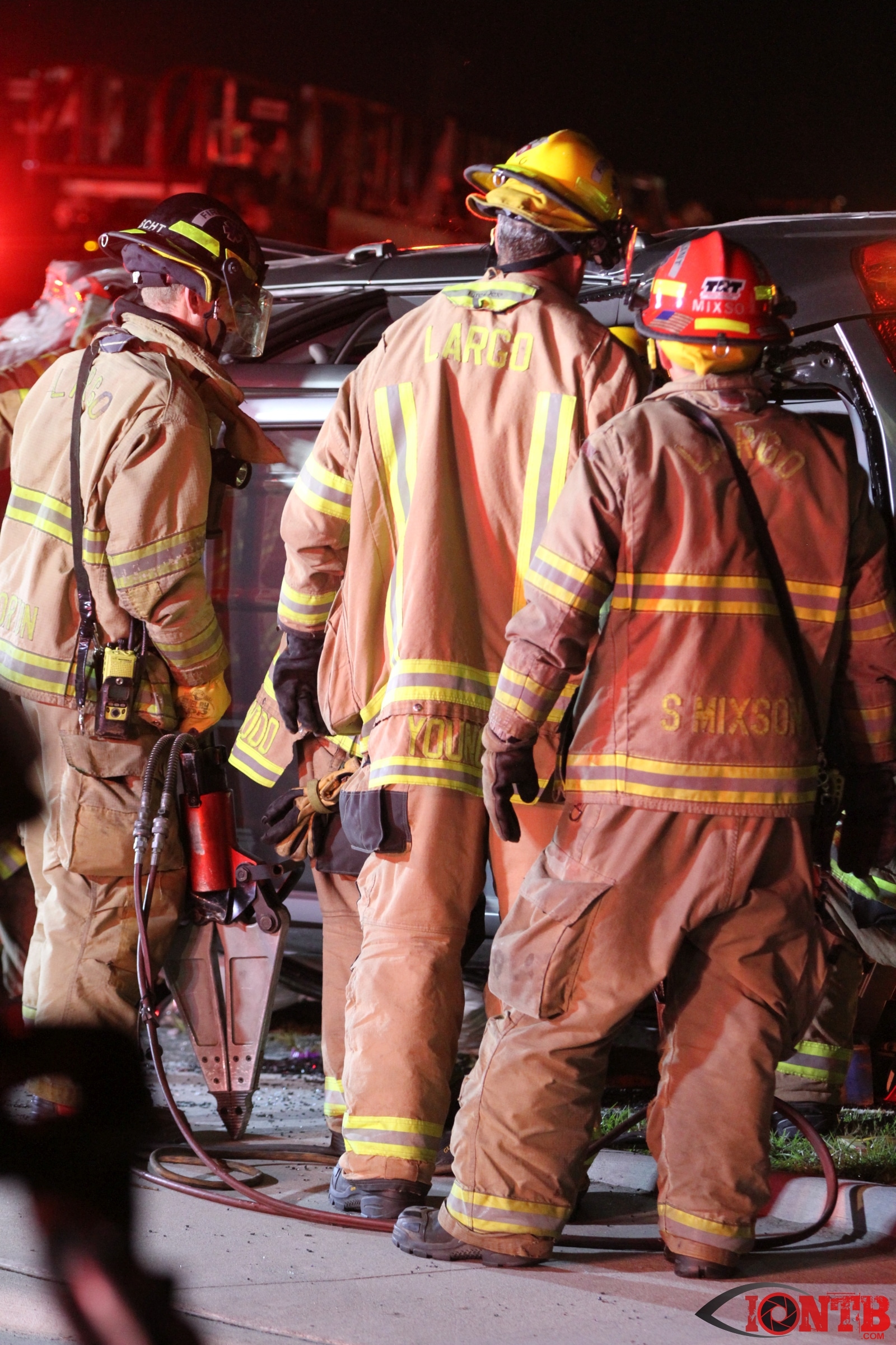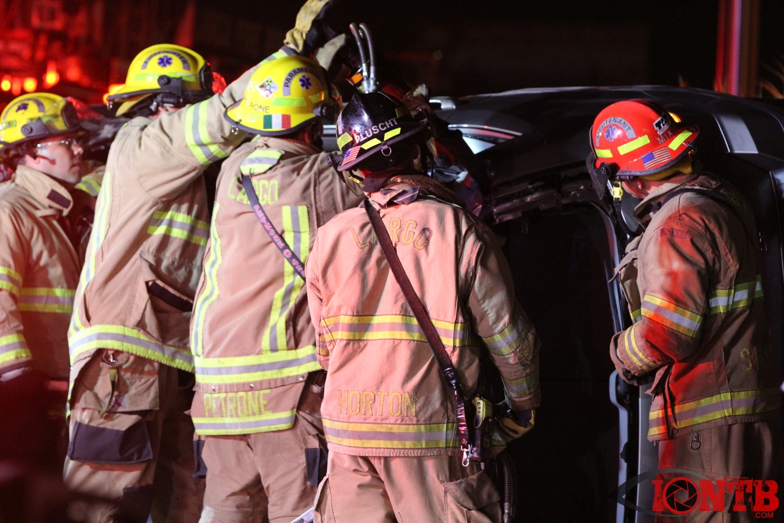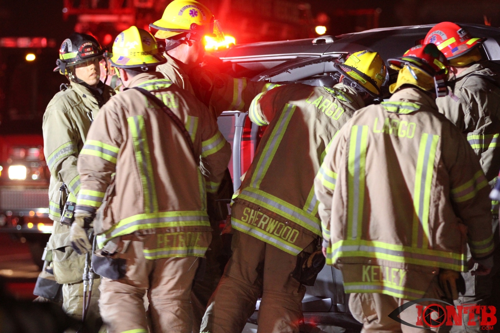 Arriving crews requested additional assistance since the driver of the vehicle was entrapped in the vehicle. An extrication operation began and continued while multiple firefighters removed the top of the vehicle.