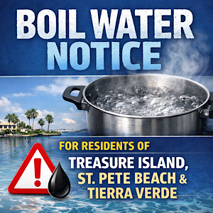 Pinellas County Utilities has issued a boil water notice as of Feb. 11, at 10 p.m., for all customers on Treasure Island, St. Pete Beach and Tierra Verde, after crews restored water service from a blown transformer near the Isle of Capri pump station.