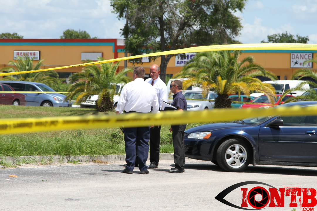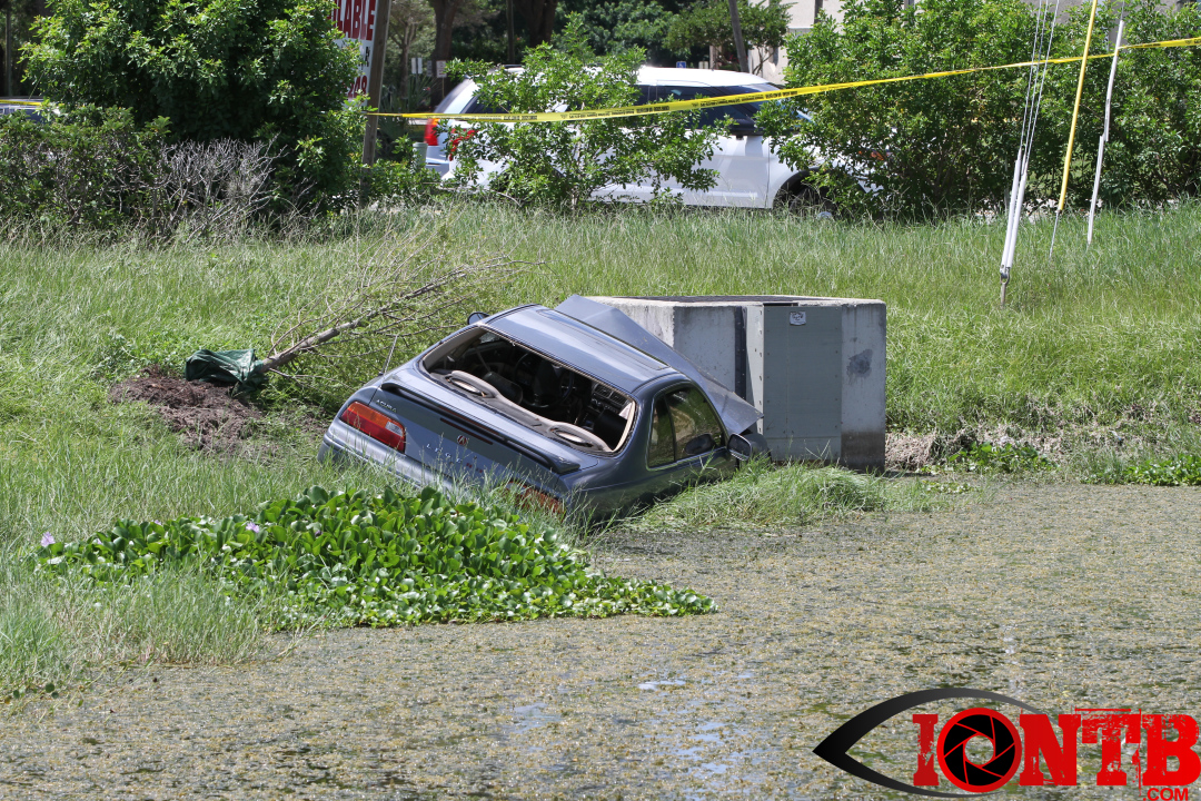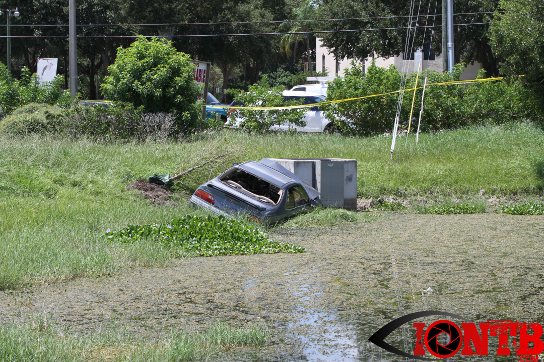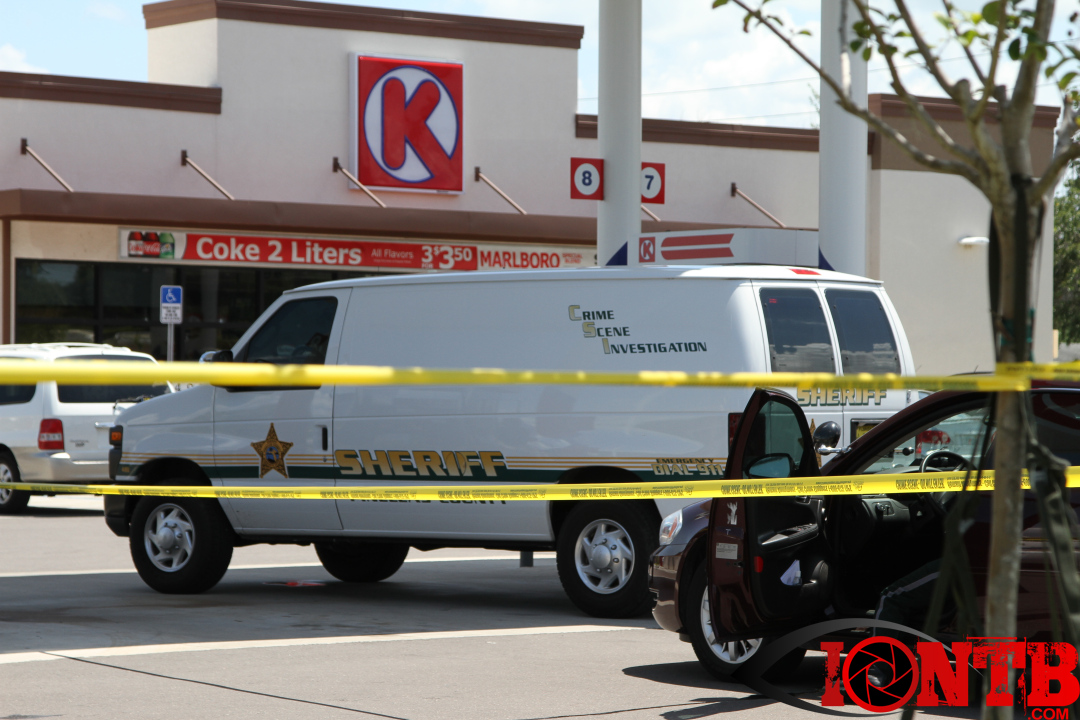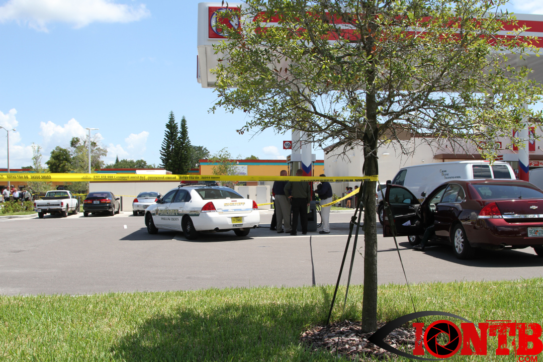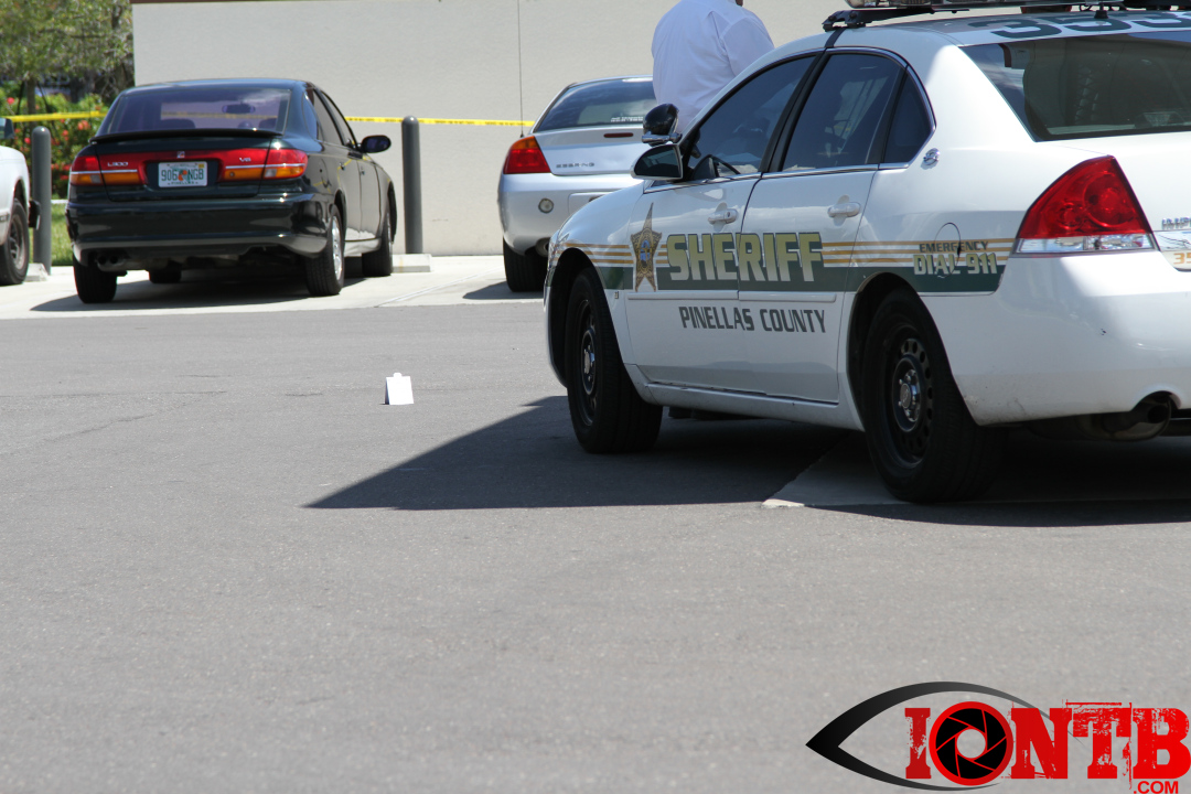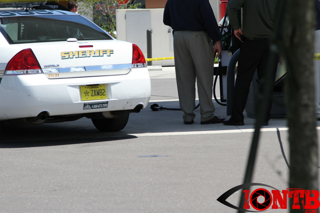 The suspect’s vehicle pulled into a gas station located on the corner of 142nd Avenue N. and S. Belcher Road in Largo. The suspect then exited the vehicle, went into the gas station and then returned to his vehicle to pump gas. Deputy Taylor and Deputy Lorie Fagan both entered the gas station parking lot and began to approach the suspect near the gas pumps. The suspect noticed the deputies approaching him and put his vehicle in reverse. He then accelerated the gas, causing his vehicle to hit the unmarked car driven by Deputy Fagan. The suspect then put the car in drive and attempted to exit the parking lot. Out of concern for officer safety and the safety of those in the area, Deputy Taylor began to fire shots at the suspect’s vehicle. The suspect’s vehicle then hit the curb and drove into the retention pond where it came to a stop.