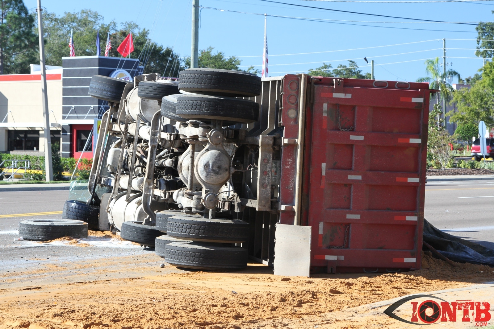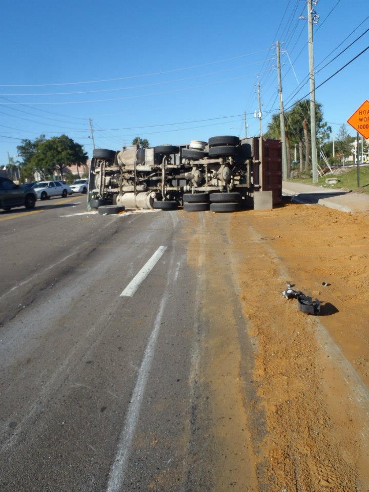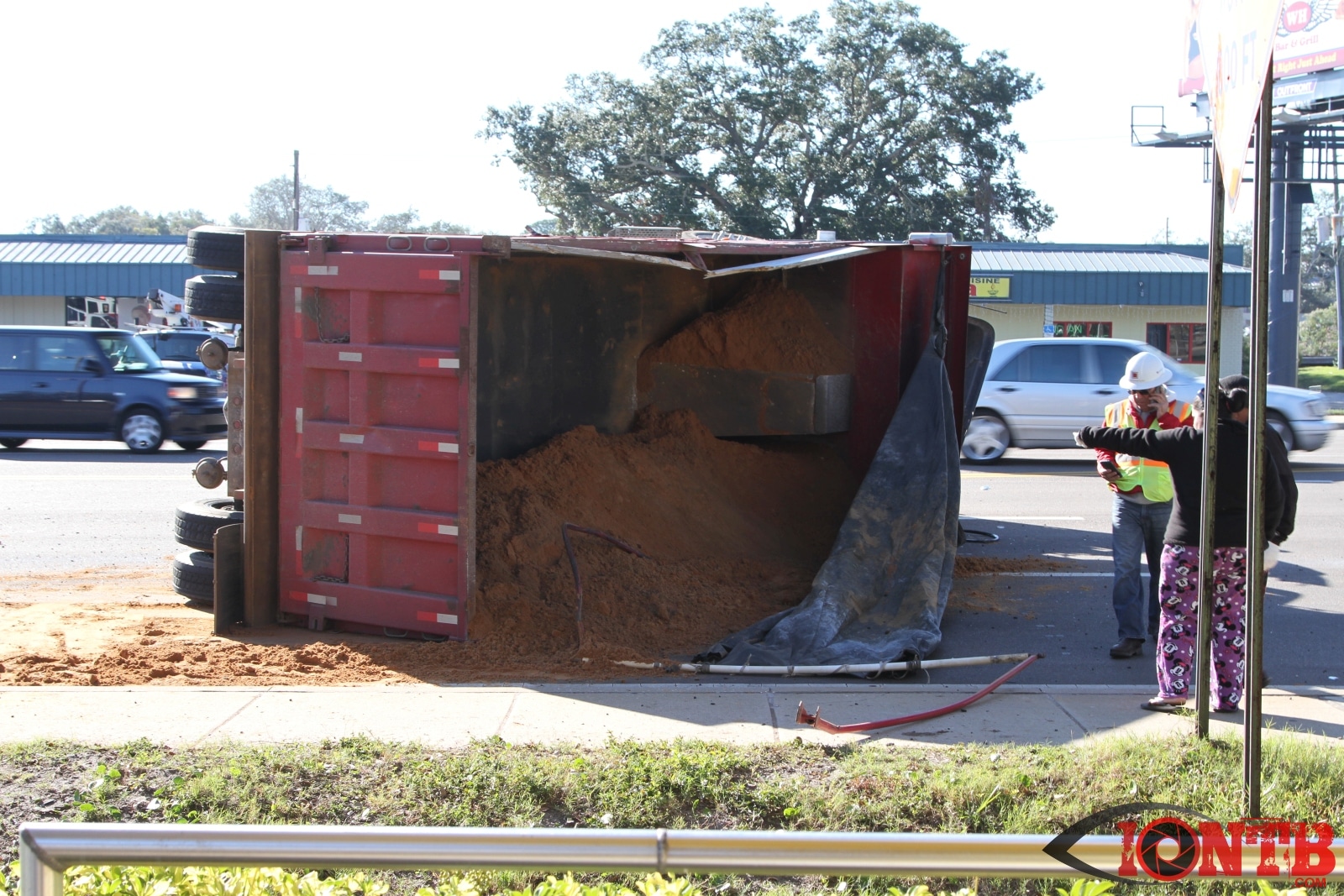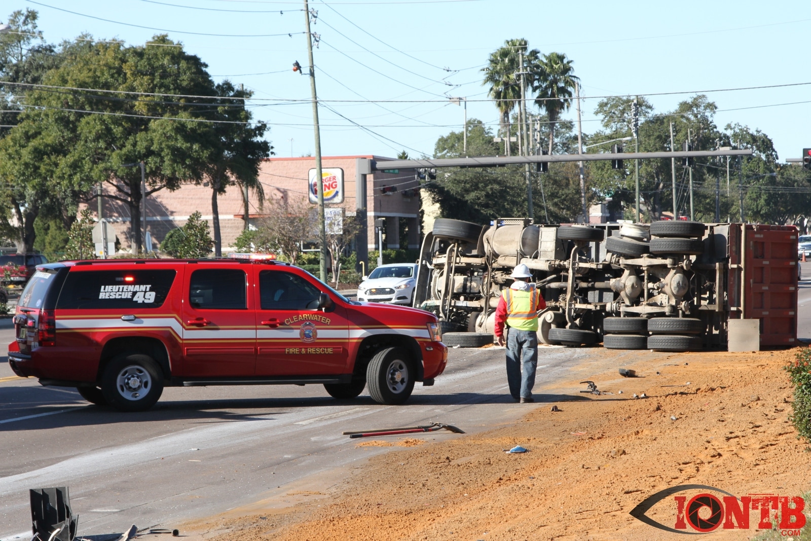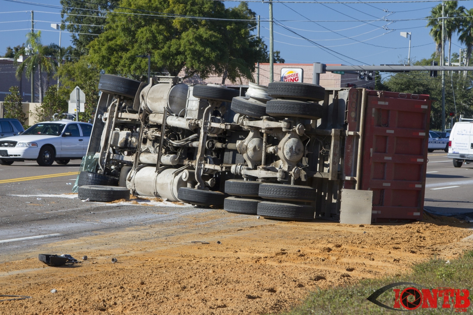 According to Clearwater Police Department, the dump truck was traveling westbound on Gulf to Bay and ran the red light. The PSTA bus was travelling eastbound and trying to make a left turn onto Hampton Road. Â The dump truck, which was hauling a load of dirt, overturned after the collision and slid about 250 ft on its side. Â The dirt and spills of oil and antifreeze had to be cleaned from the roadway, which closed most lanes for more than three hours.