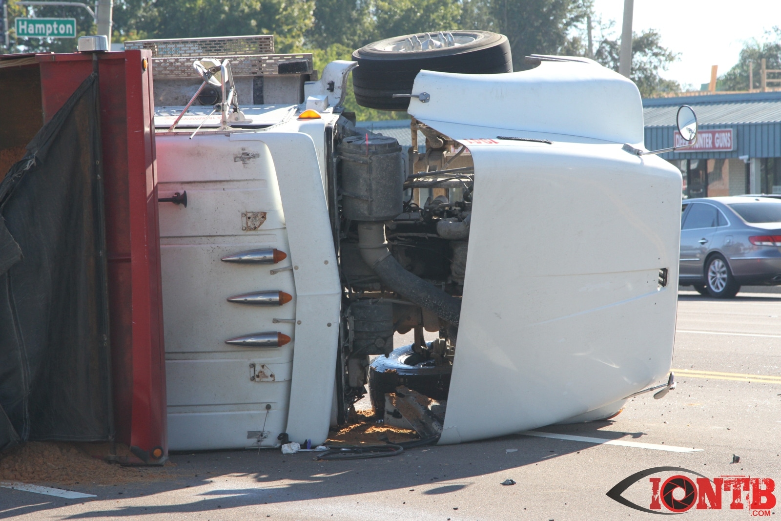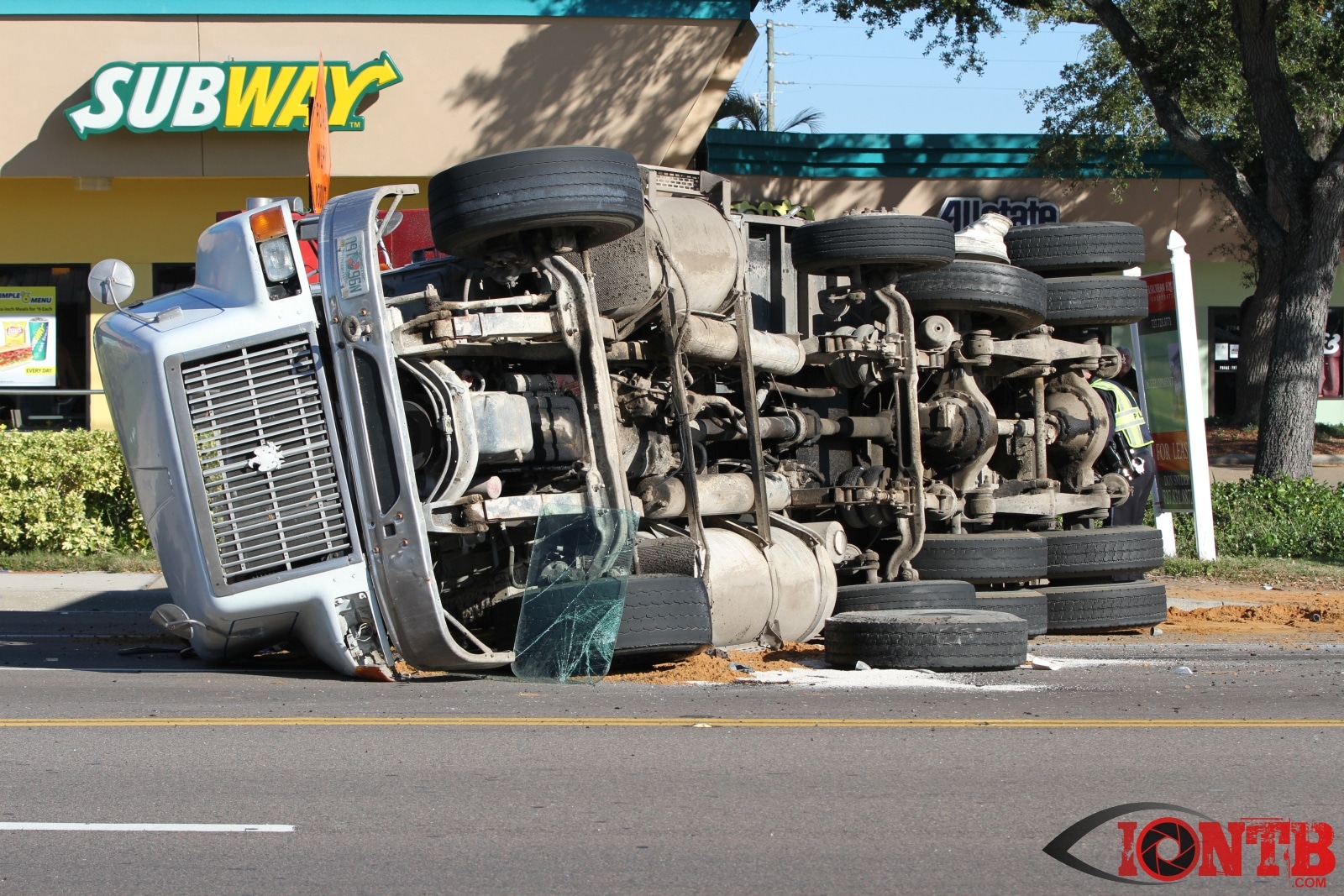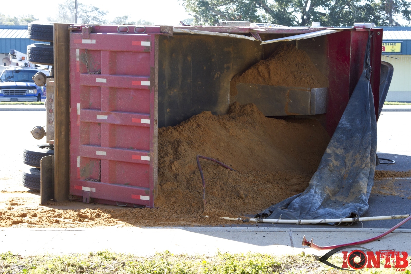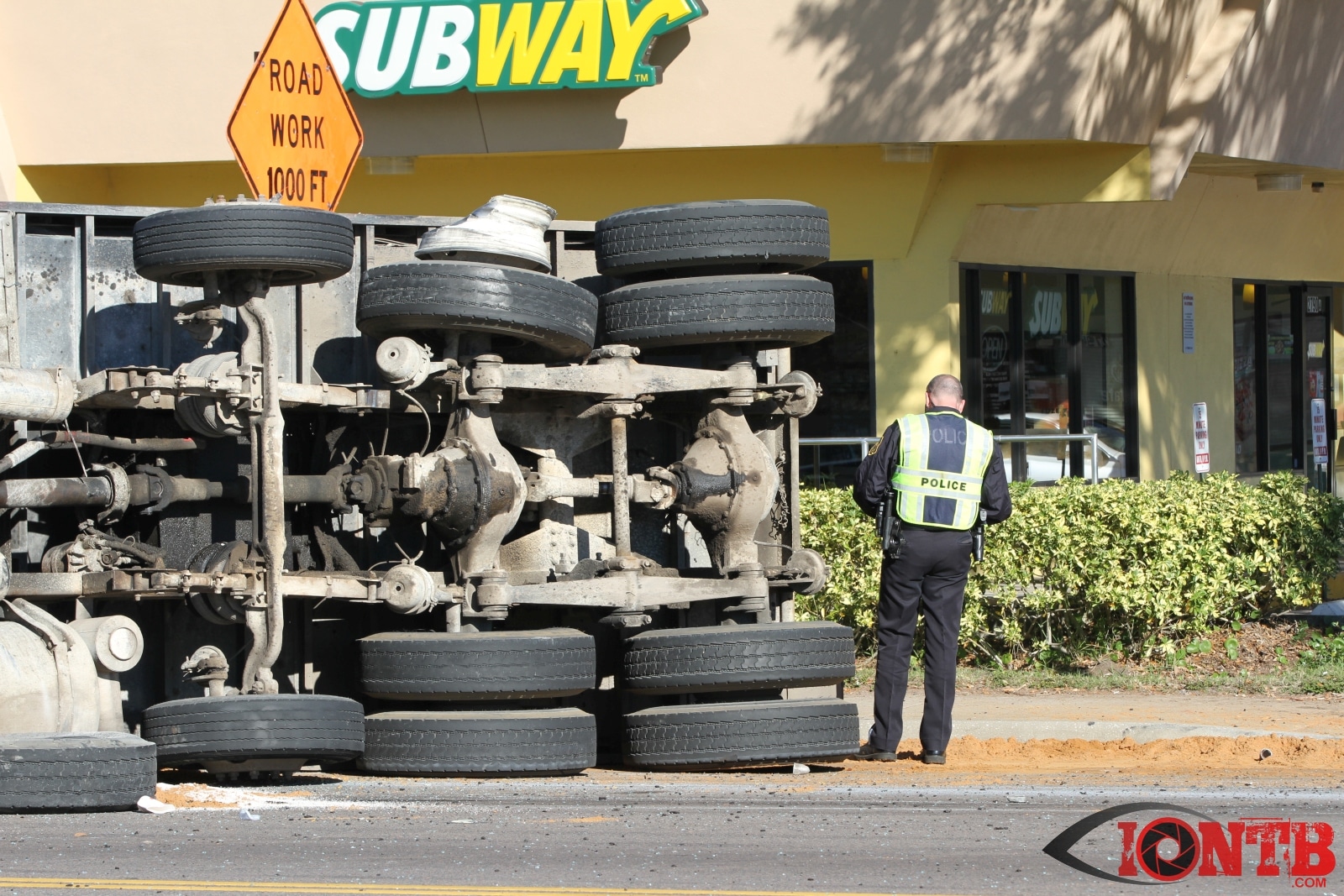 According to Clearwater Police Department, the dump truck was traveling westbound on Gulf to Bay and ran the red light. The PSTA bus was travelling eastbound and trying to make a left turn onto Hampton Road. Â The dump truck, which was hauling a load of dirt, overturned after the collision and slid about 250 ft on its side. Â The dirt and spills of oil and antifreeze had to be cleaned from the roadway, which closed most lanes for more than three hours.