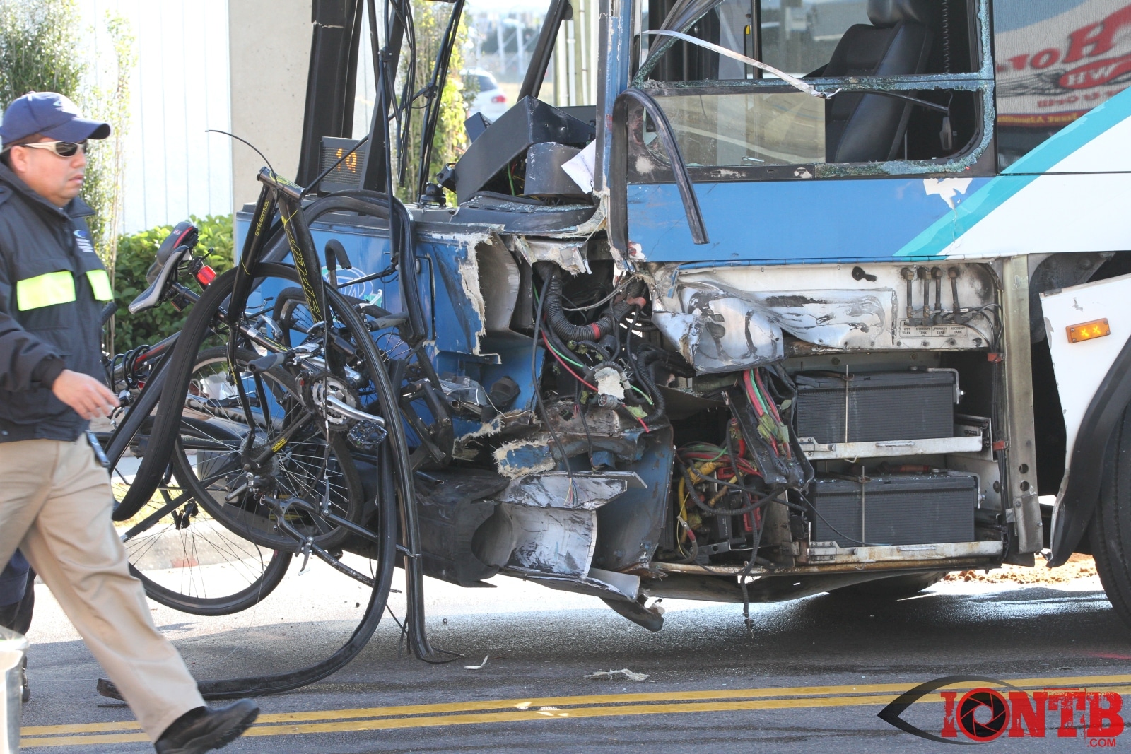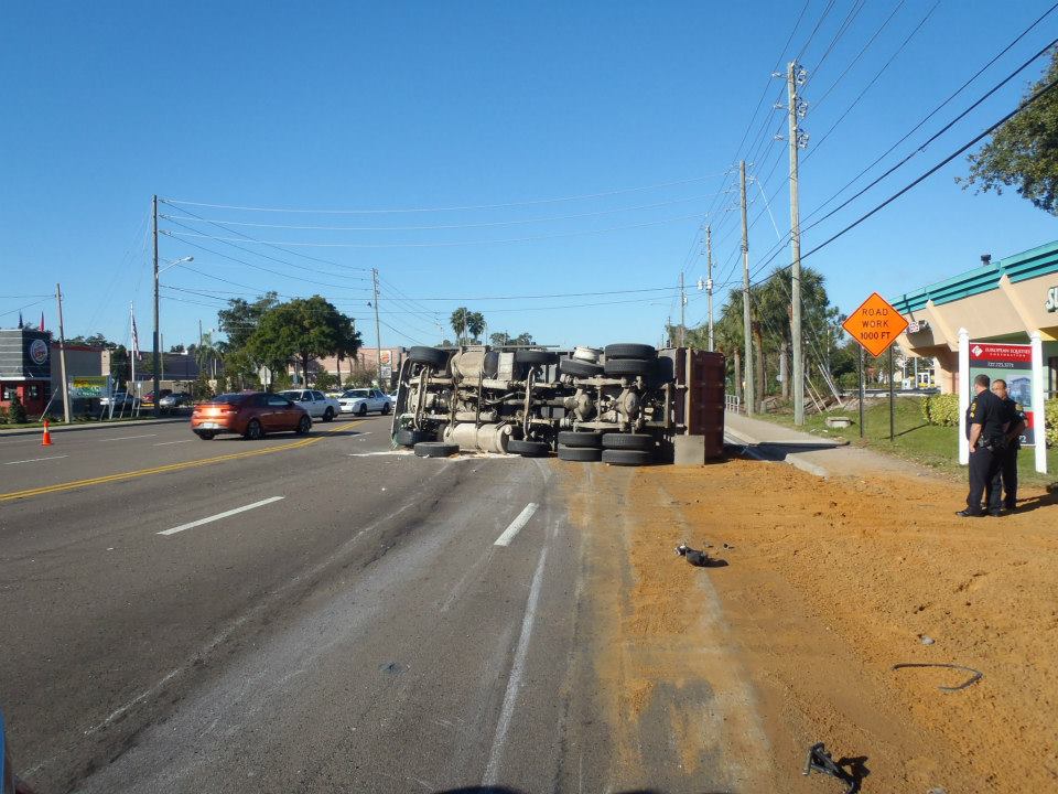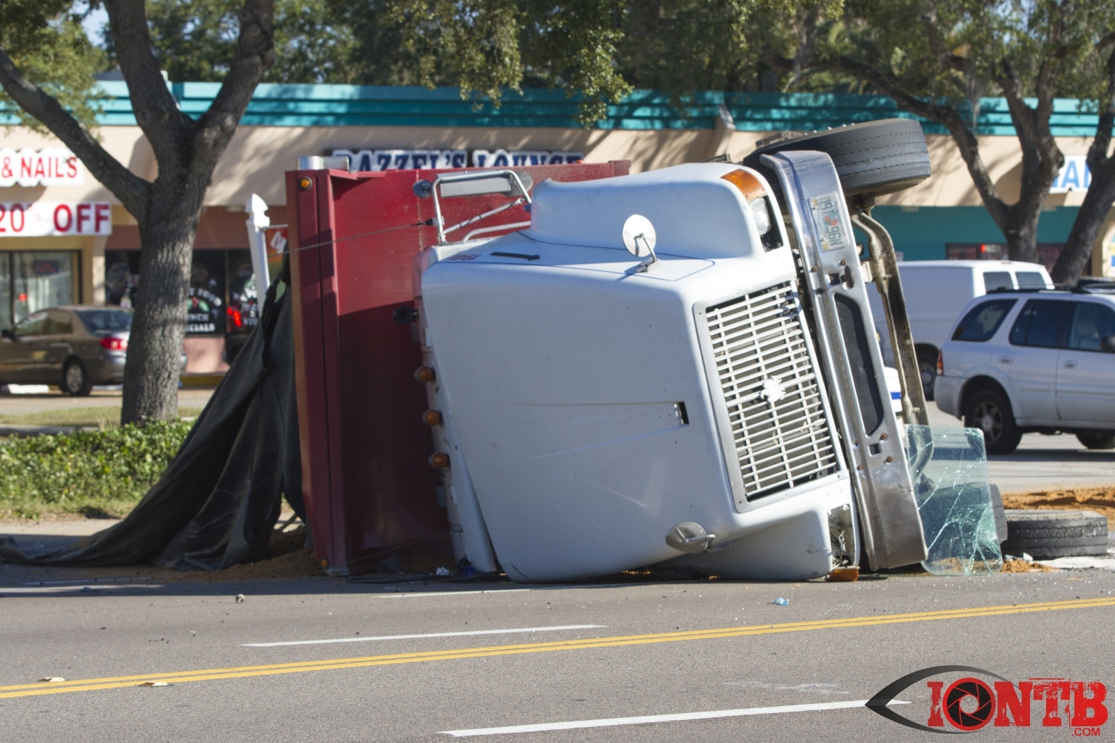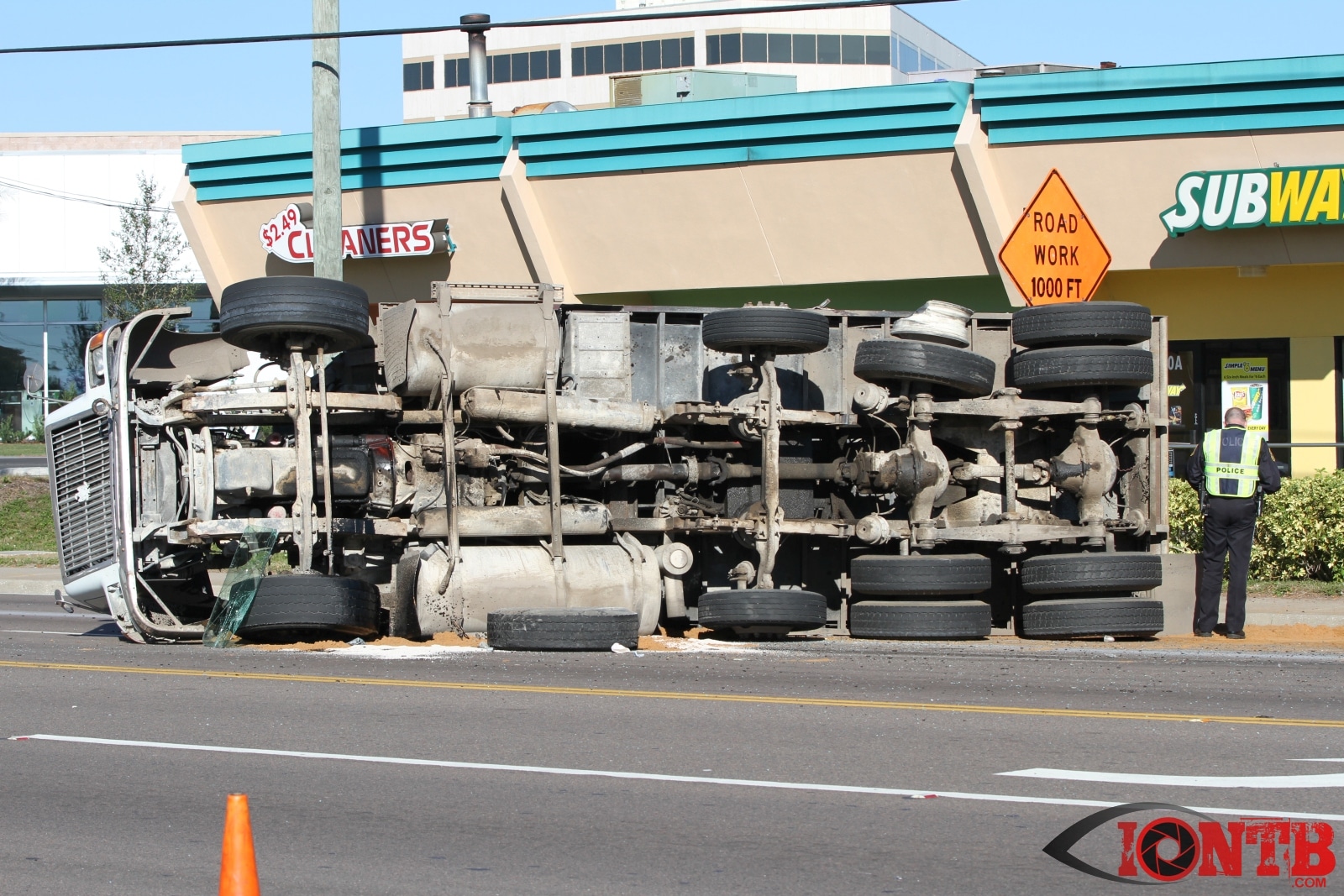 According to Clearwater Police Department, the dump truck was traveling westbound on Gulf to Bay and ran the red light. The PSTA bus was travelling eastbound and trying to make a left turn onto Hampton Road. Â The dump truck, which was hauling a load of dirt, overturned after the collision and slid about 250 ft on its side. Â The dirt and spills of oil and antifreeze had to be cleaned from the roadway, which closed most lanes for more than three hours.