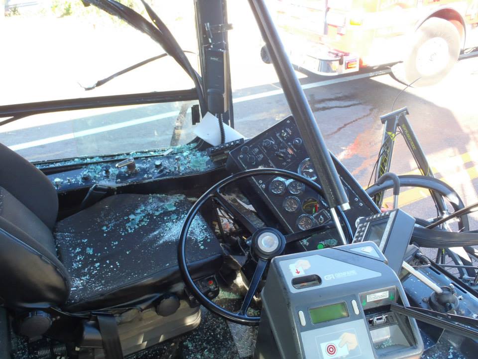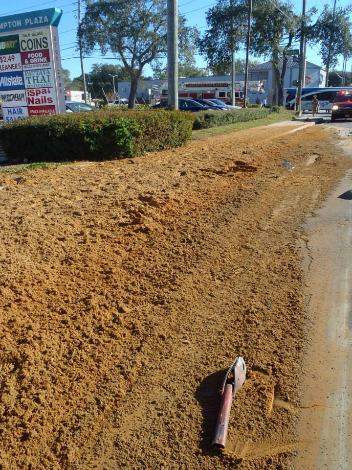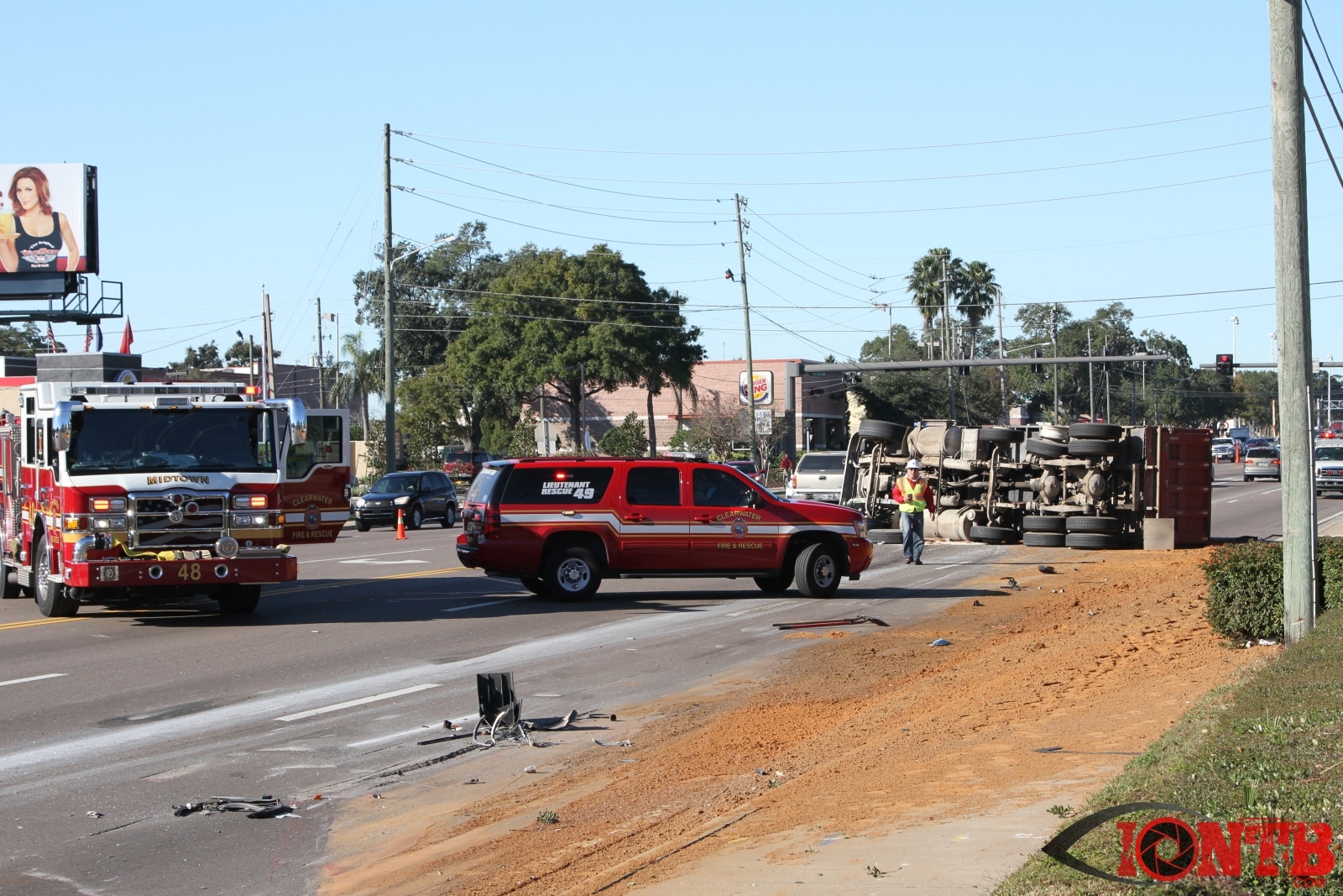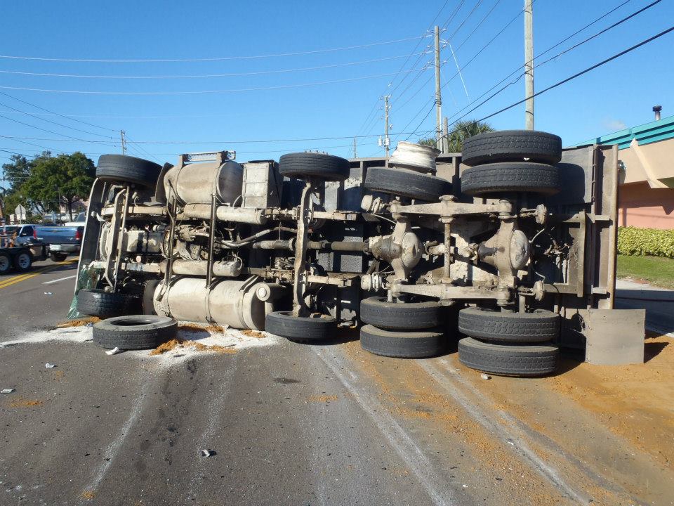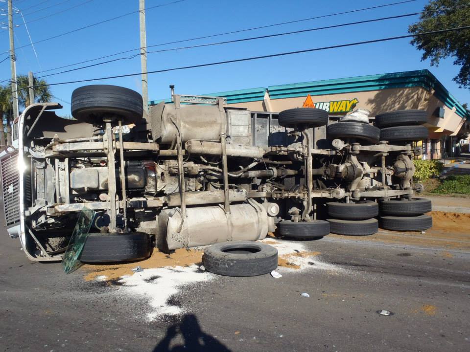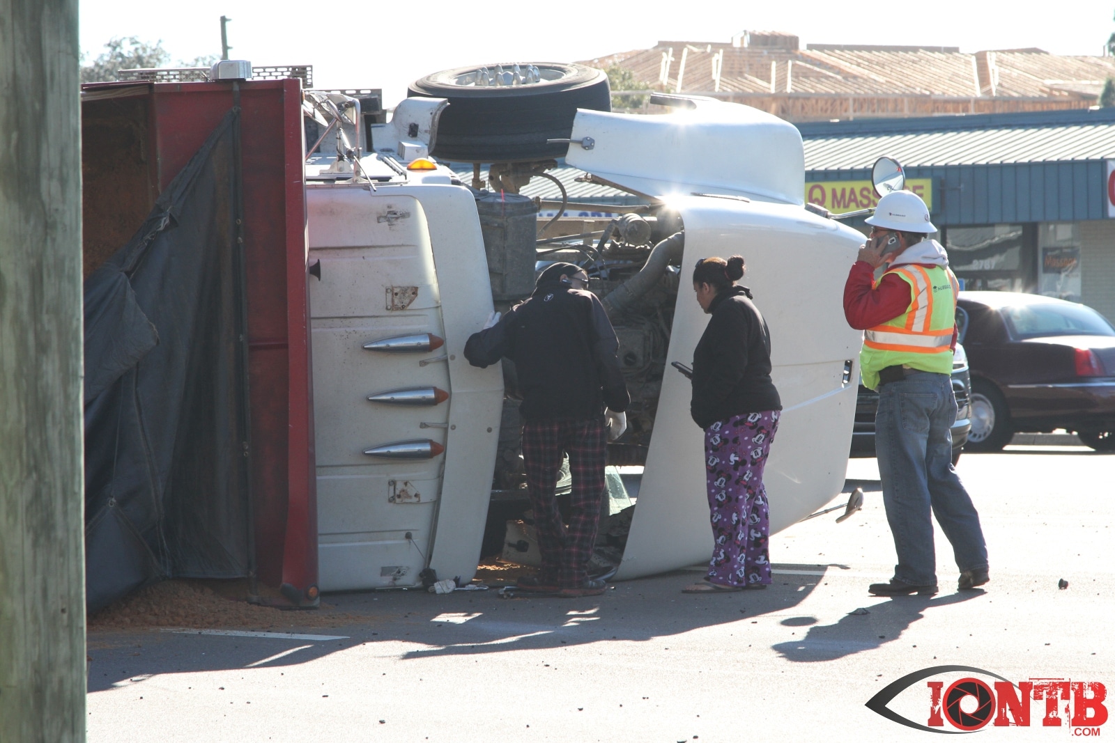According to Clearwater Police Department, the dump truck was traveling westbound on Gulf to Bay and ran the red light. The PSTA bus was travelling eastbound and trying to make a left turn onto Hampton Road. Â The dump truck, which was hauling a load of dirt, overturned after the collision and slid about 250 ft on its side. Â The dirt and spills of oil and antifreeze had to be cleaned from the roadway, which closed most lanes for more than three hours.