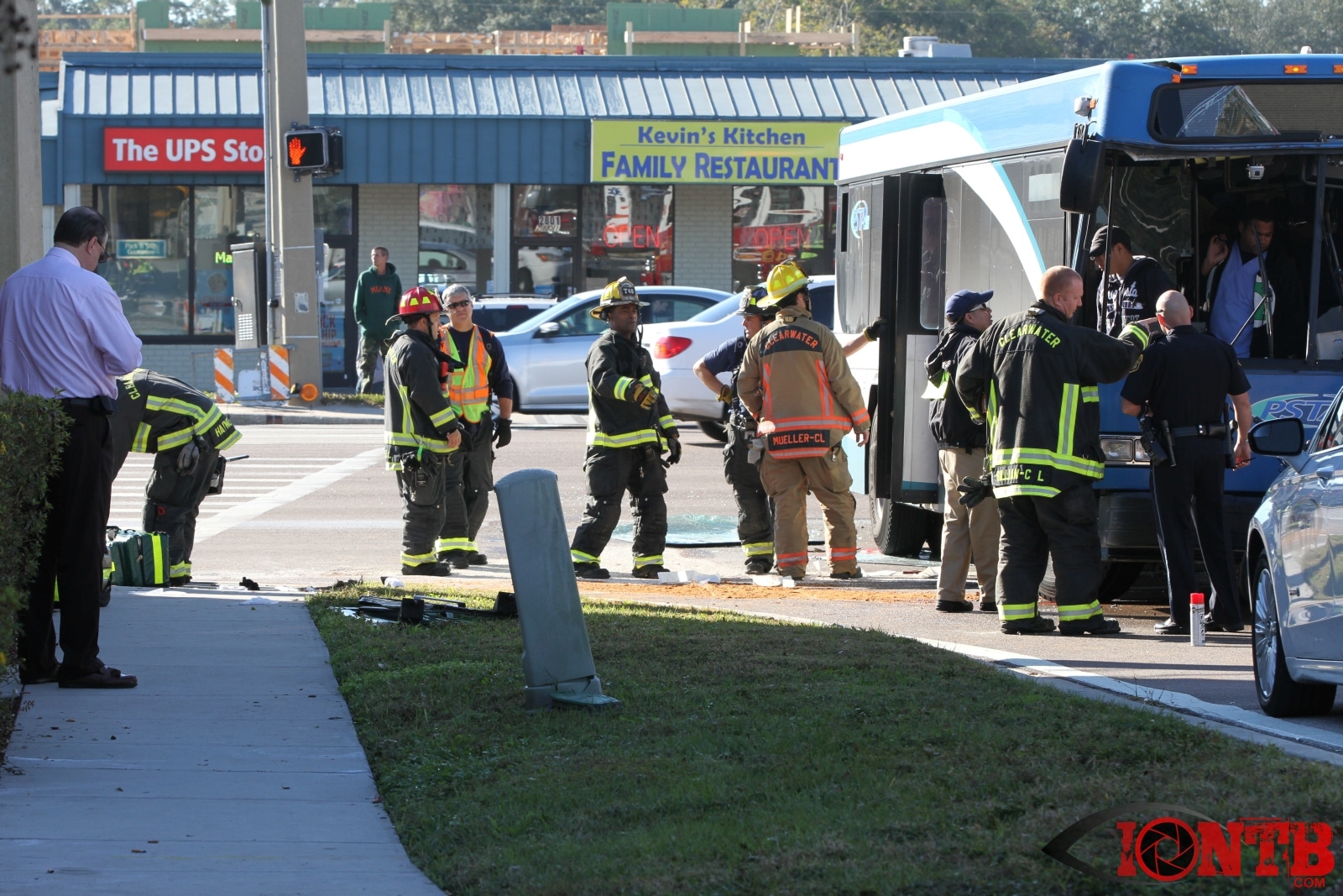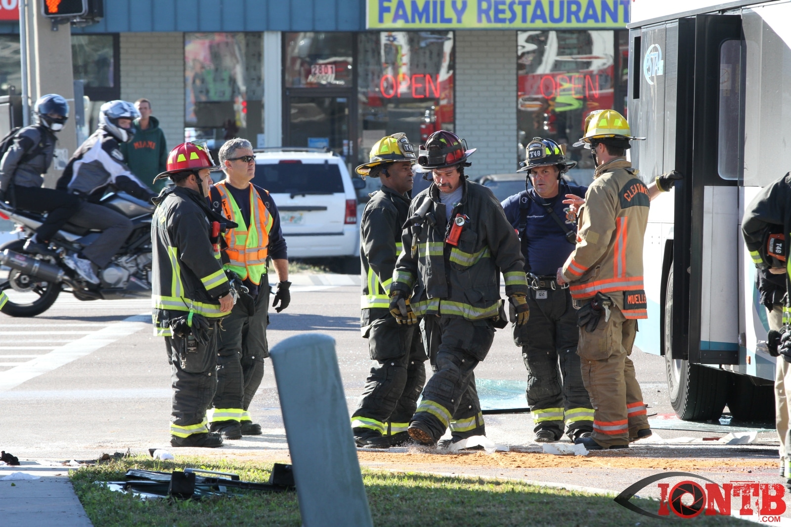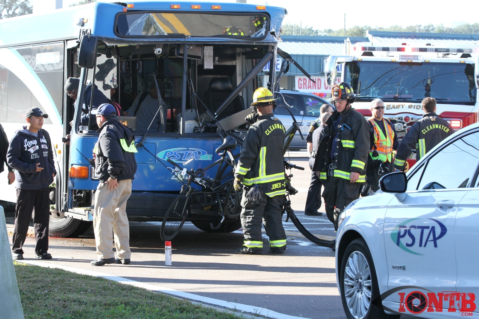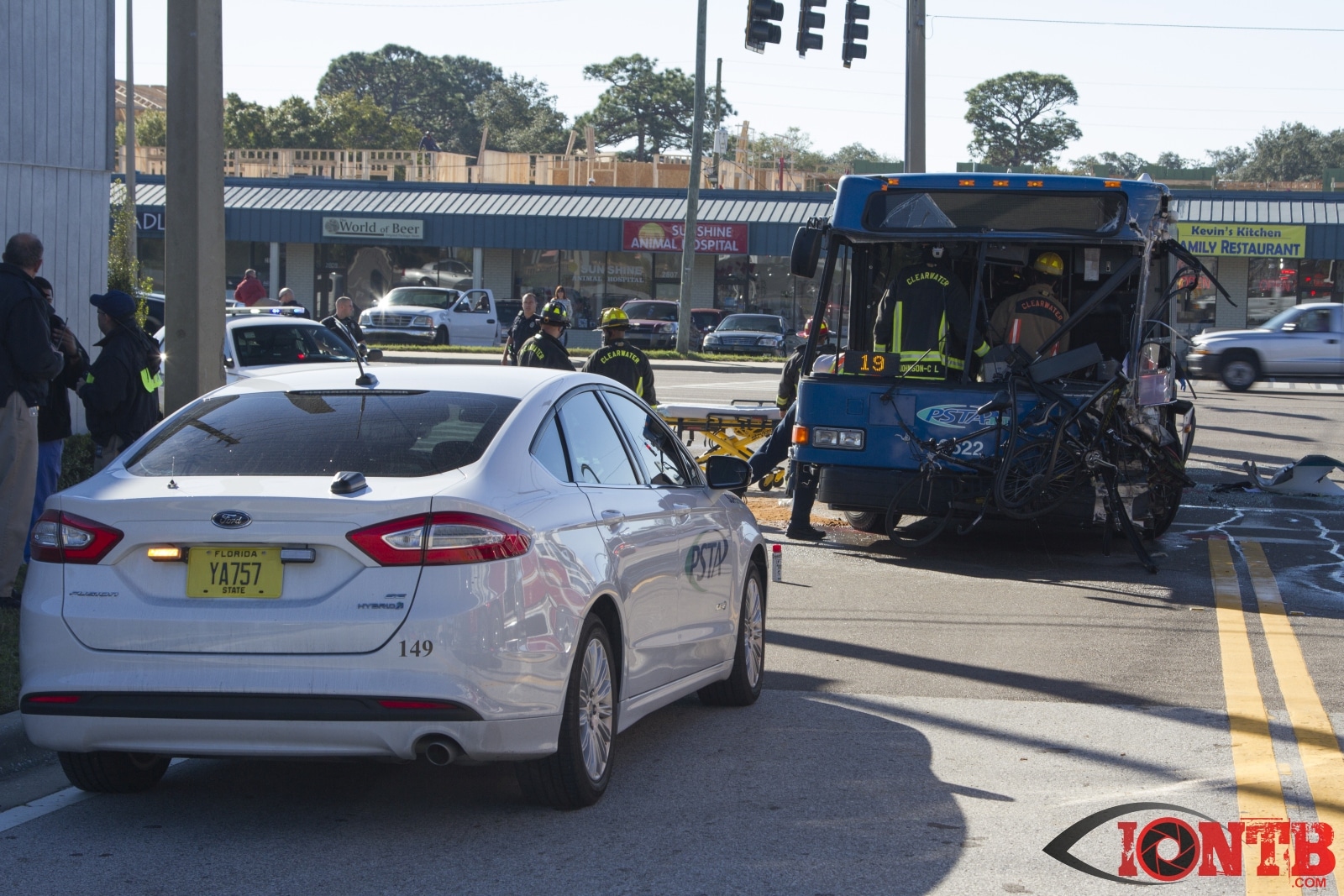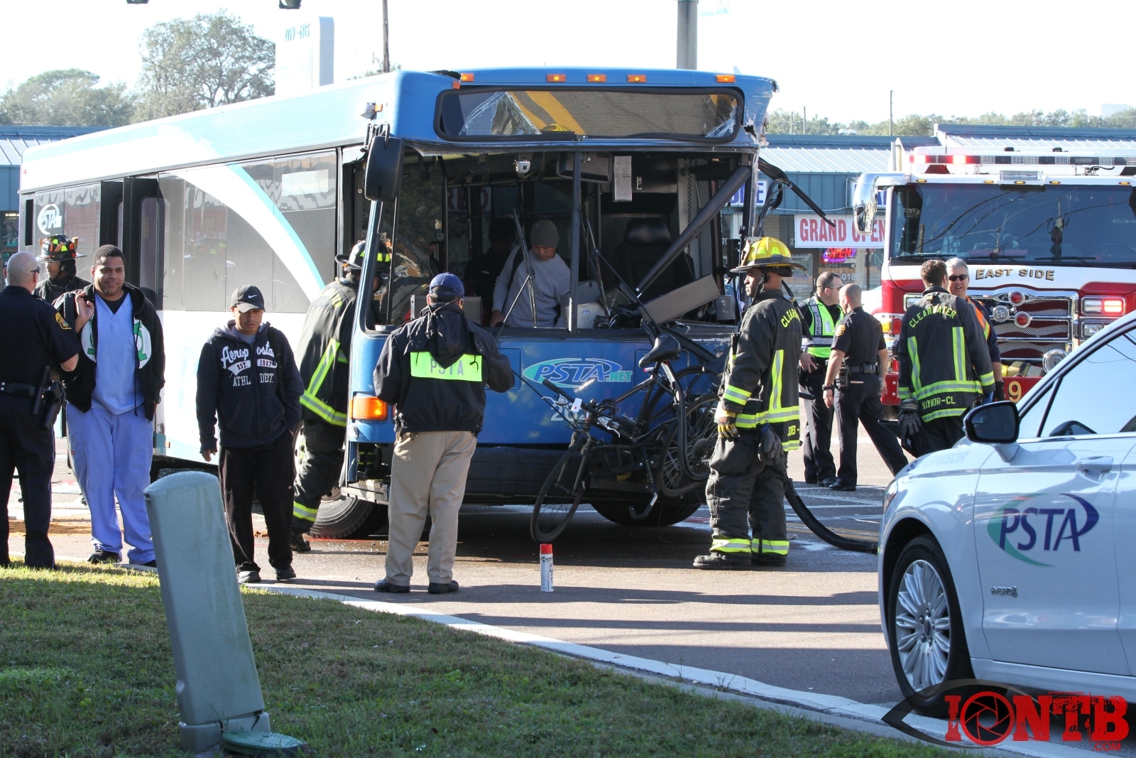 On Saturday, December 13, 2014 at approximately 8:55 AM, crews from Clearwater Fire & Rescue, Sunstar Paramedics and Clearwater Police Department responded to Gulf to Bay Blvd and Hampton Road for reports of a vehicle crash involving a dump truck and a PSTA bus.