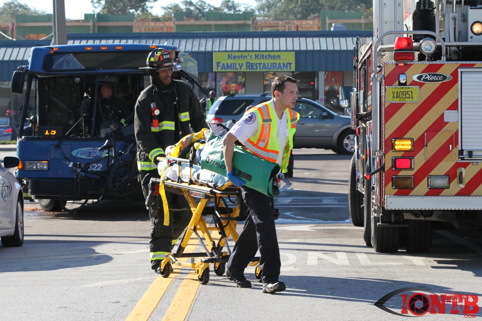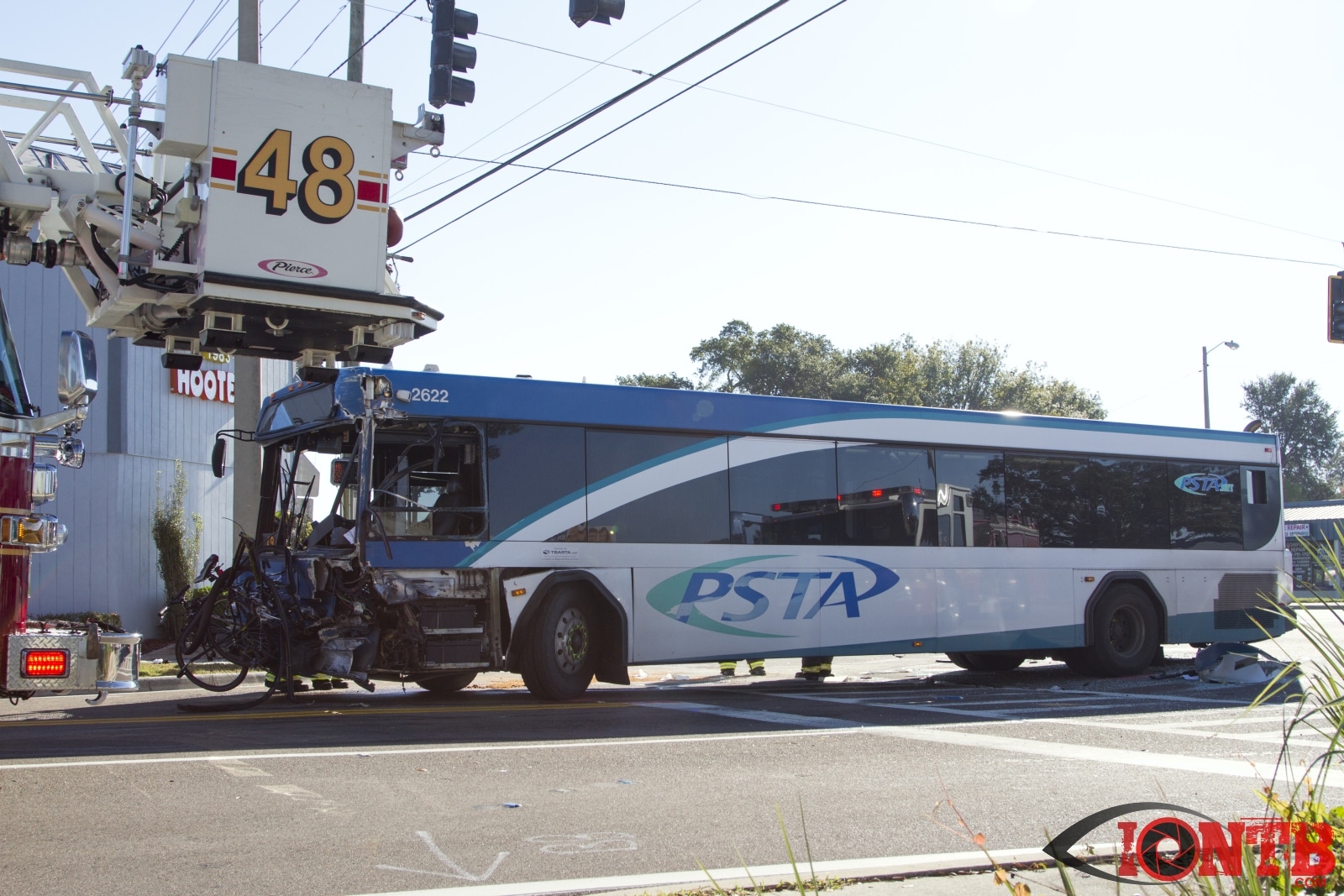 Lieutenant Rescue 49 was on-scene almost immediately still as the call was being dispatched and reported that the dump truck was on its side. The PSTA bus driver’s foot was pinned since the bus experienced heavy damage due to impact with the dump truck. Â Additional crews arrived to assist in freeing the driver from the bus.