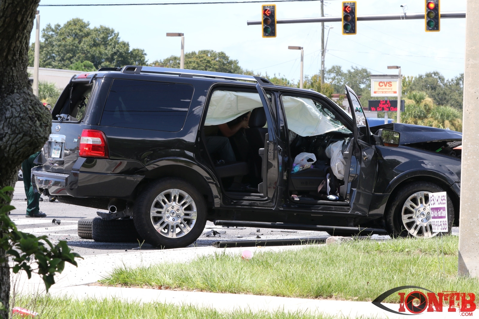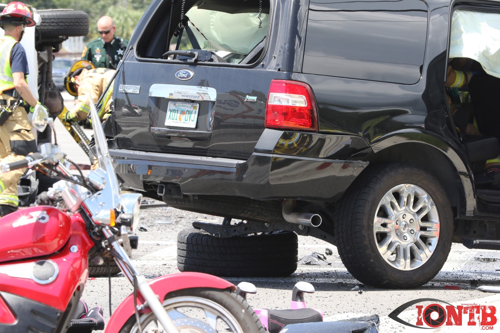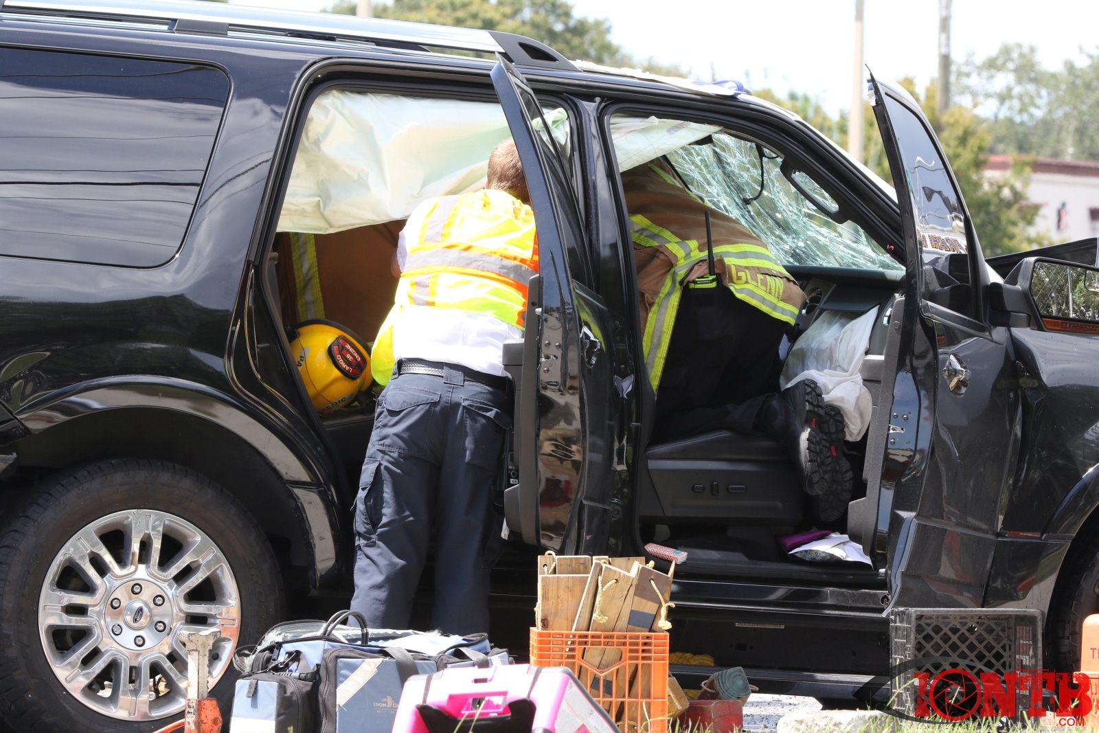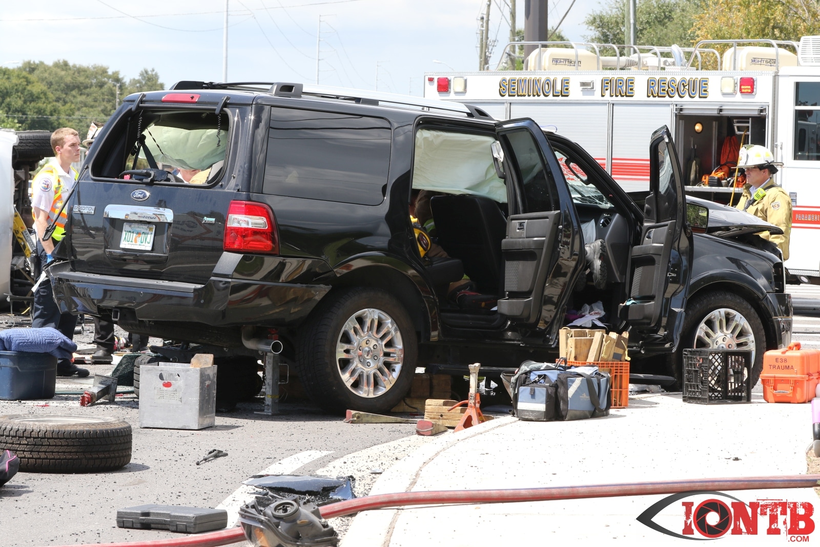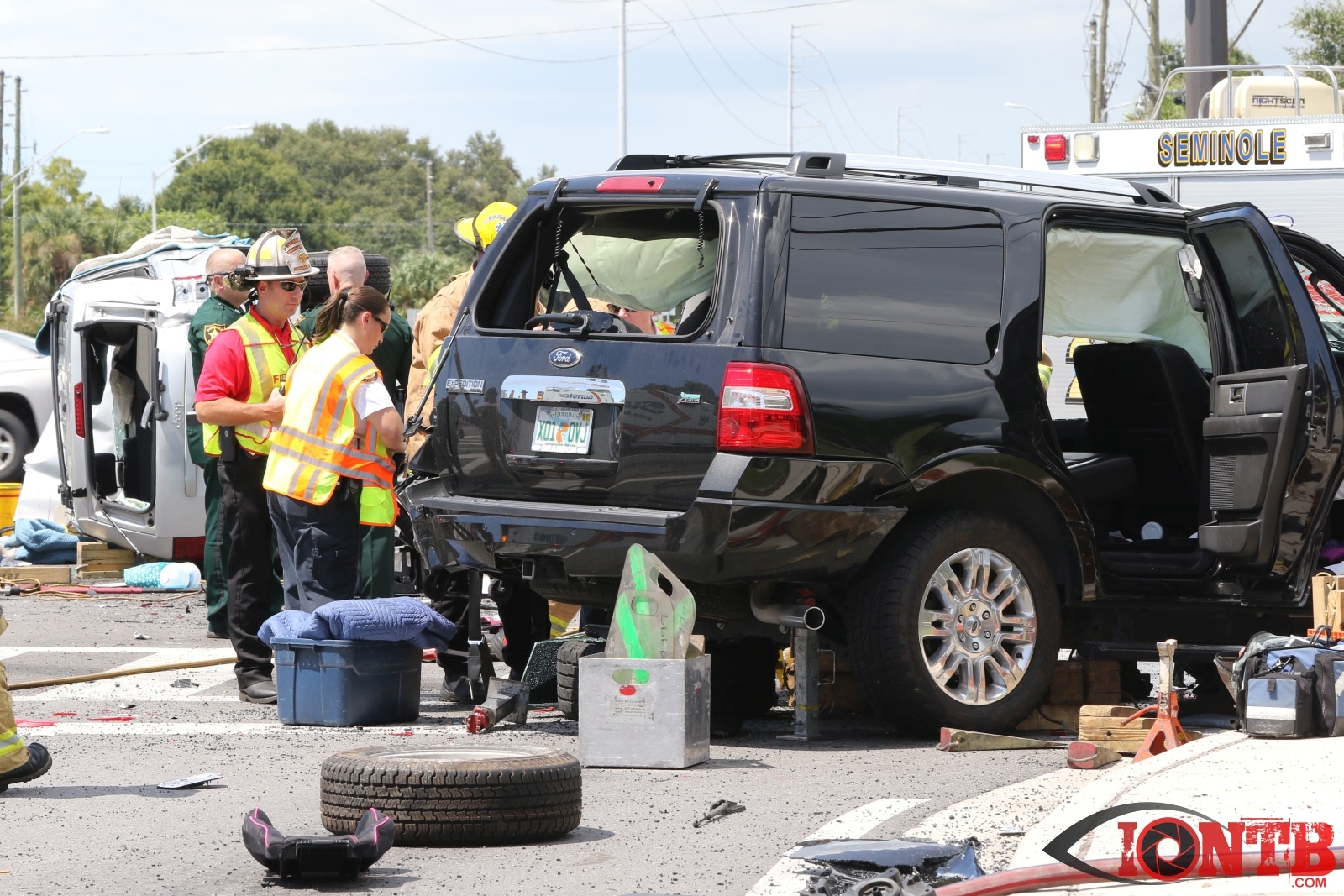 The crash involved at least three vehicles, a Ford Expedition, Jeep Cherokee, and a Chevy Equinox. The Jeep came to rest on its side with the Ford nearby heavily damaged. The Chevy also showed signs of heavy front end damage and came to rest slightly east of the intersection.