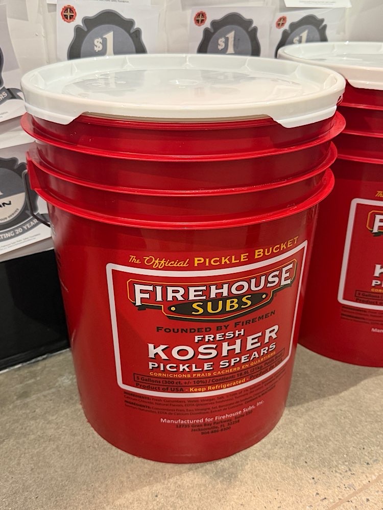 Image of the Original Pickle Bucket, with sales supporting the Safety Foundation. any Firehouse Subs restaurant, purchasing a pickle bucket for a $3 donation, contributing spare change to the in-store canister, rounding up purchases to the nearest dollar, or donating $1, $5, or $25 during October’s First Responders Month.