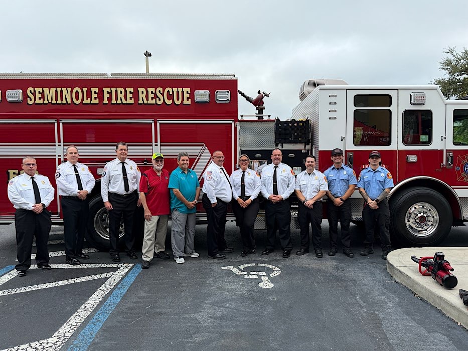Members of the Seminole Fire Rescue and City Council are standing in front of their fire engine.