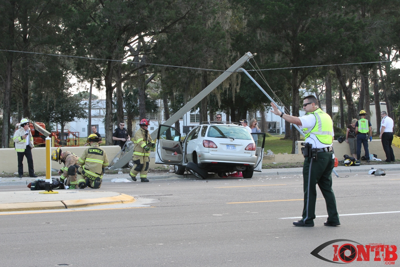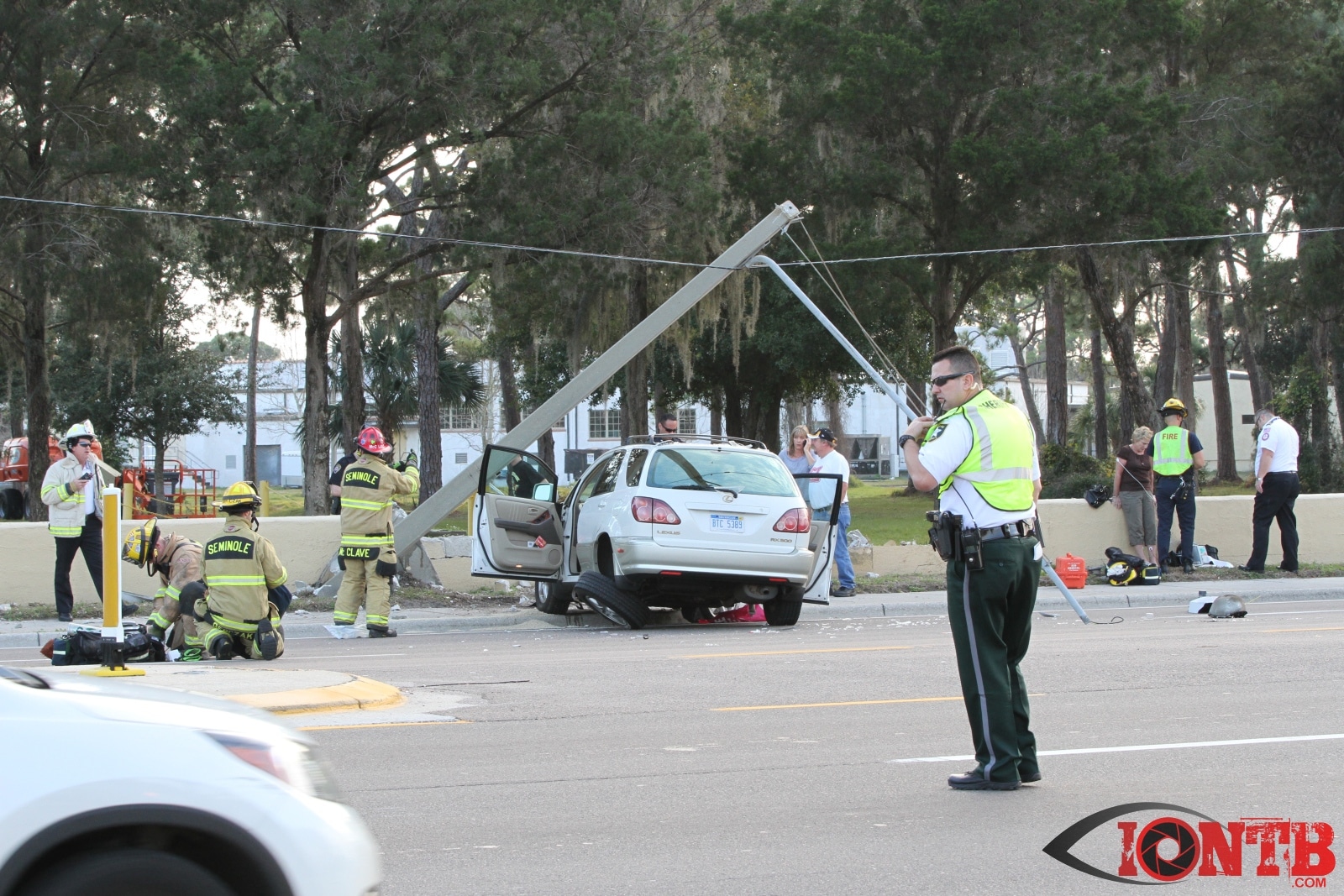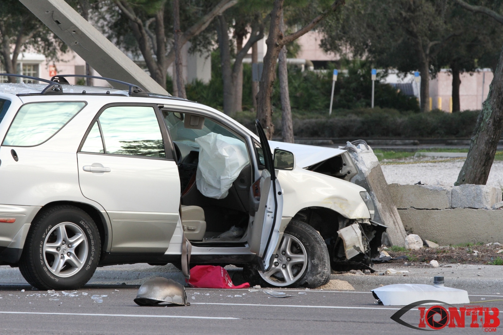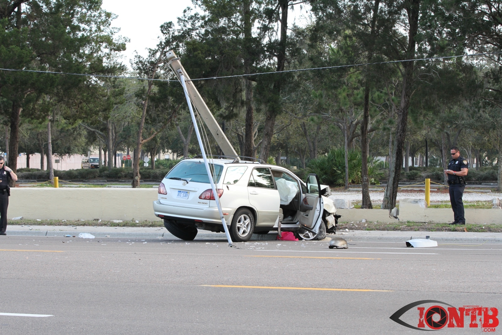 baypineslight005Single vehicle crash in front of the Bay Pines VA Medical Center injures two