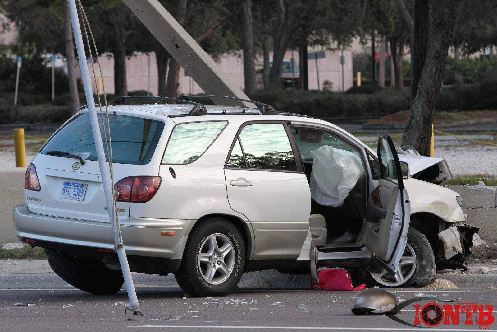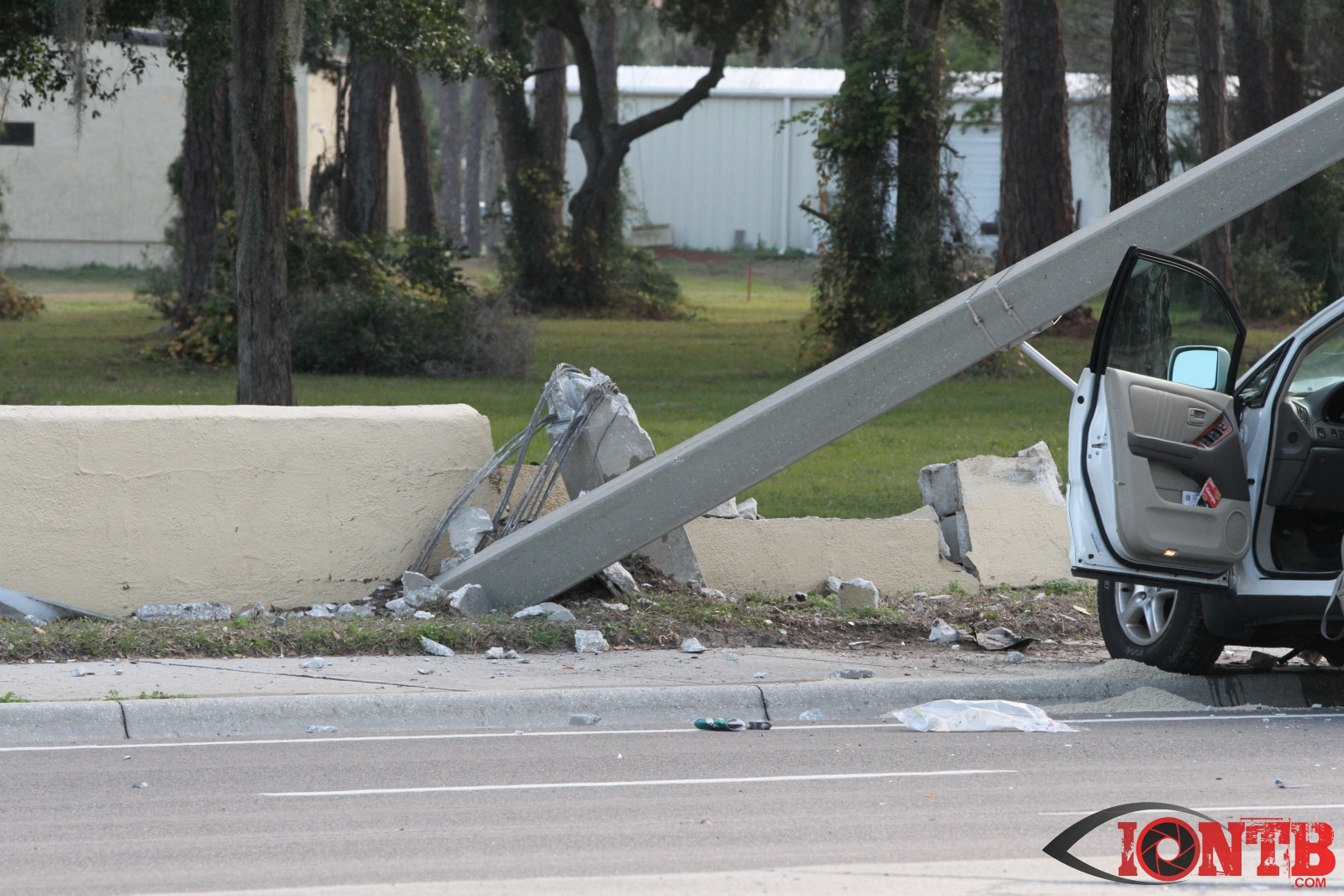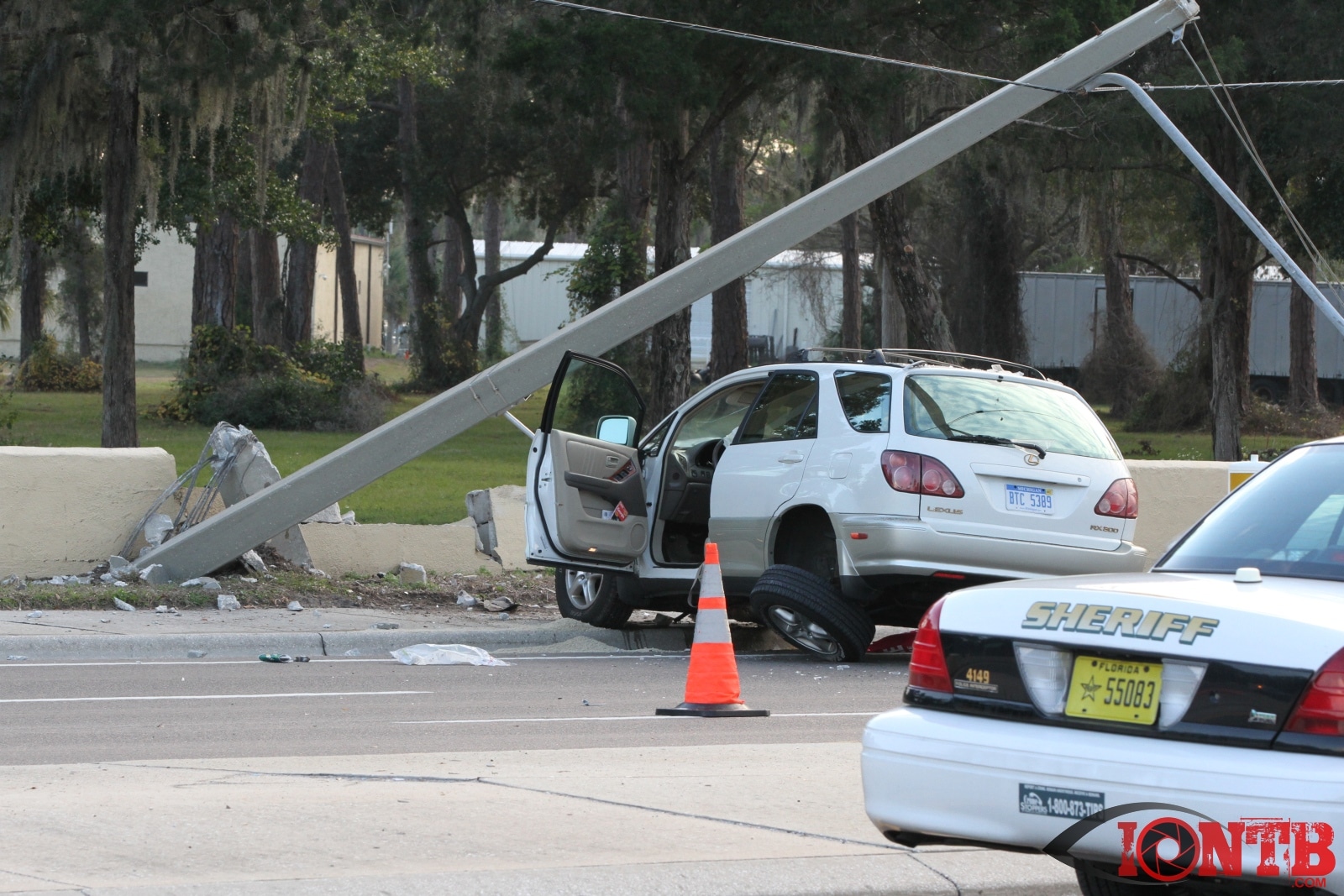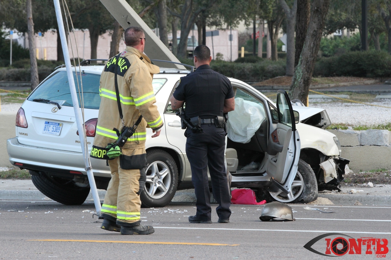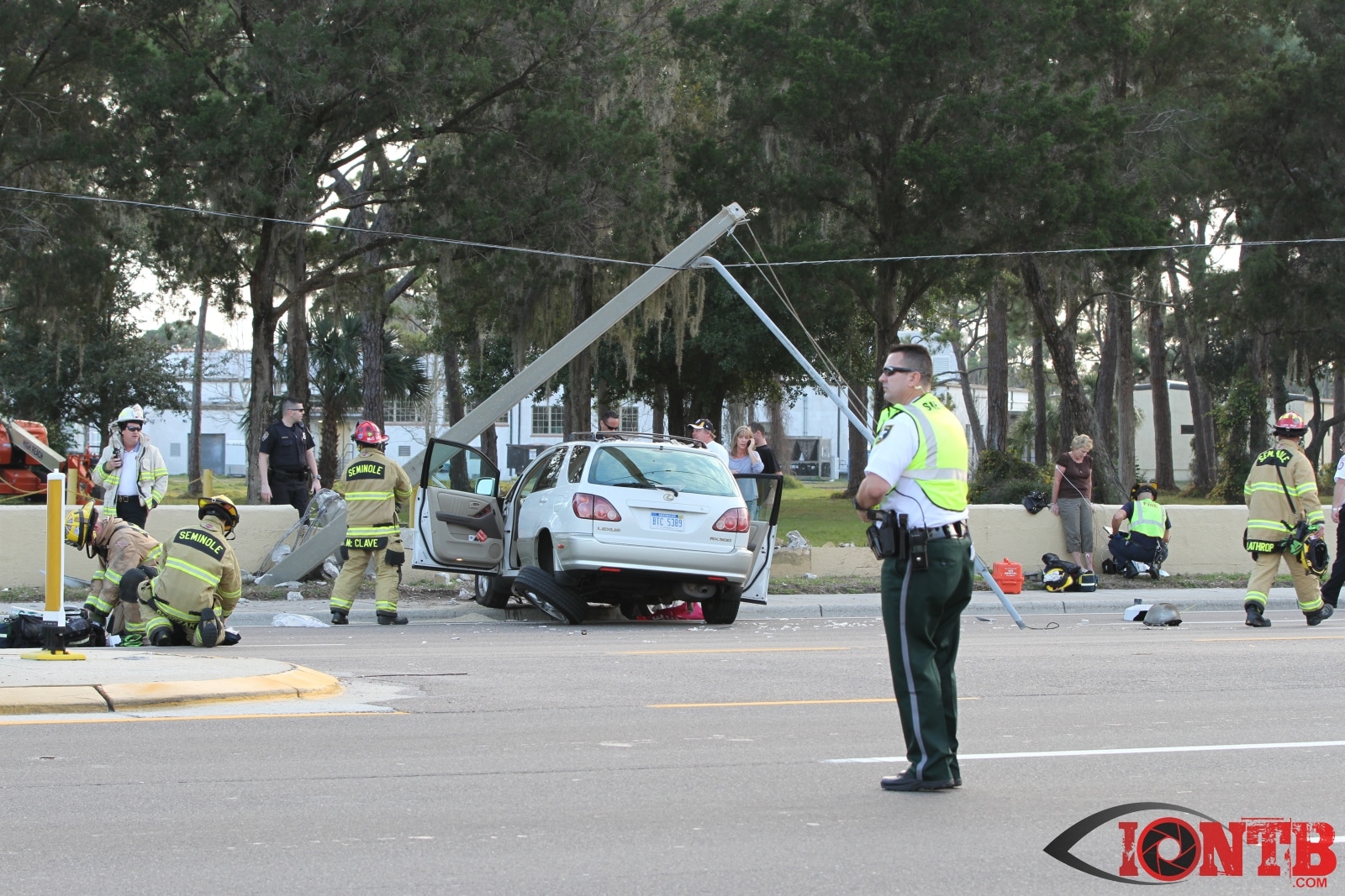 baypineslight005Single vehicle crash in front of the Bay Pines VA Medical Center injures two
