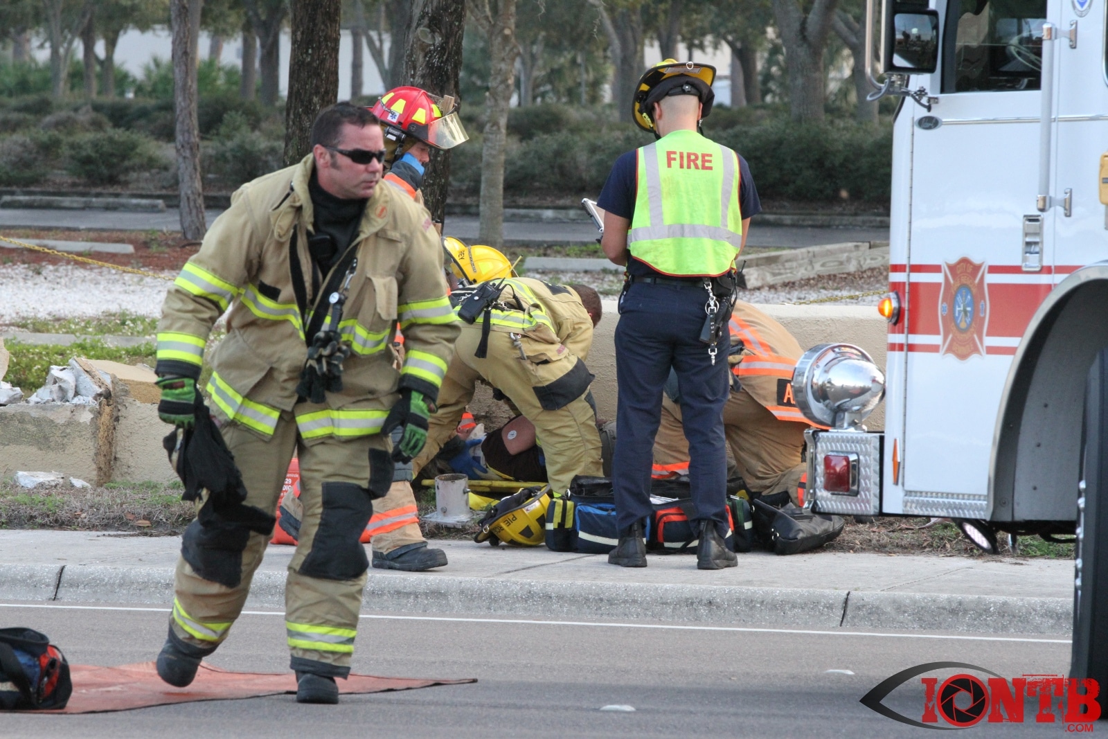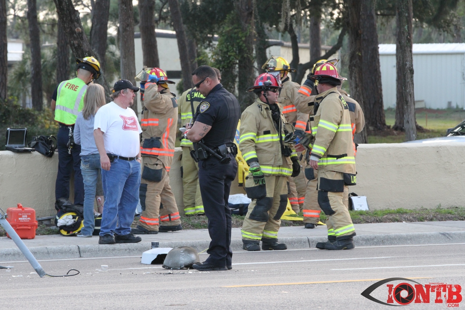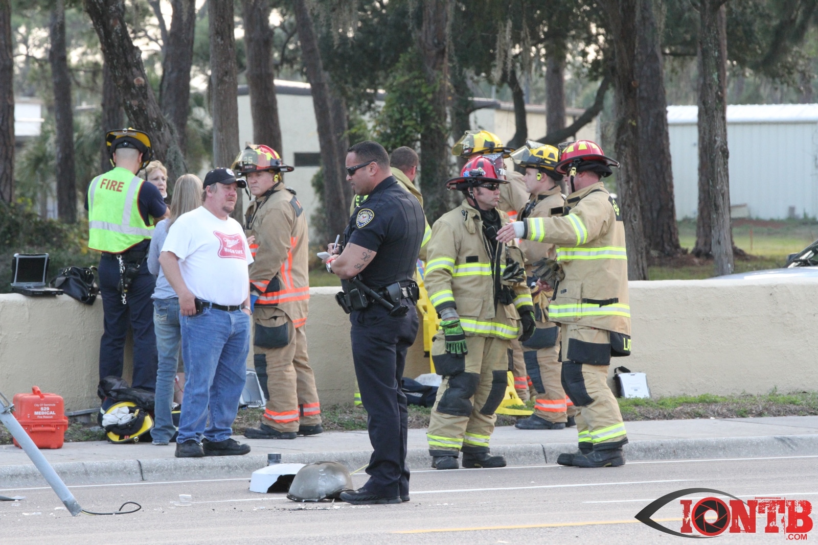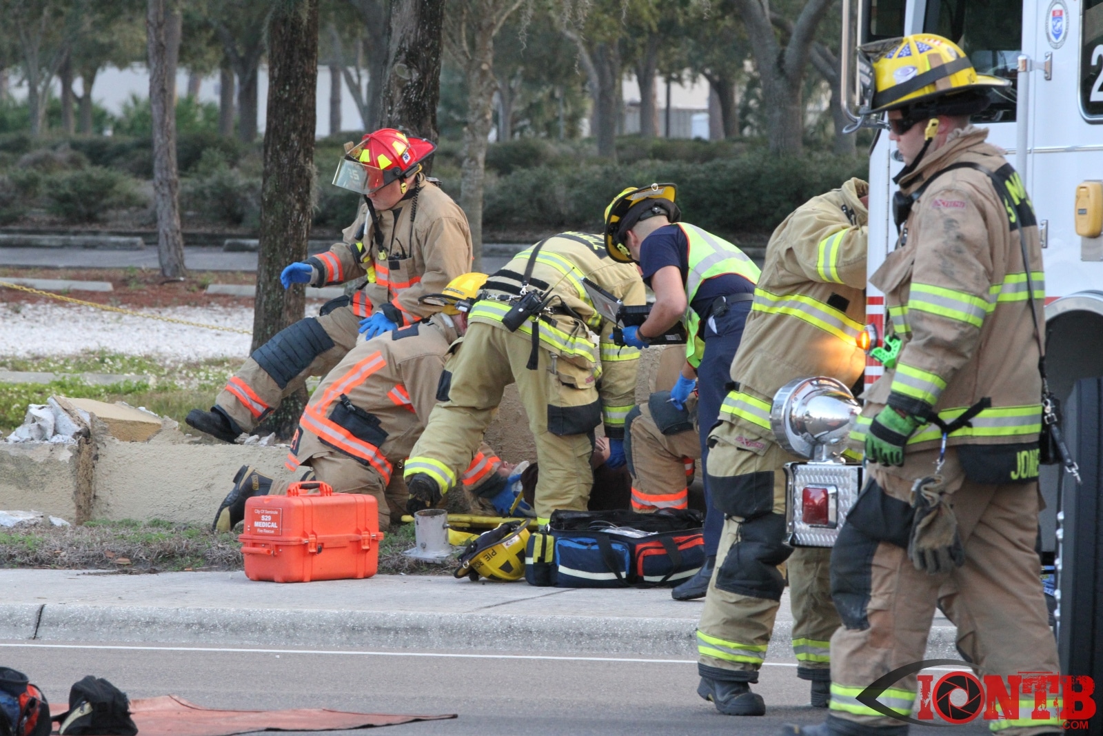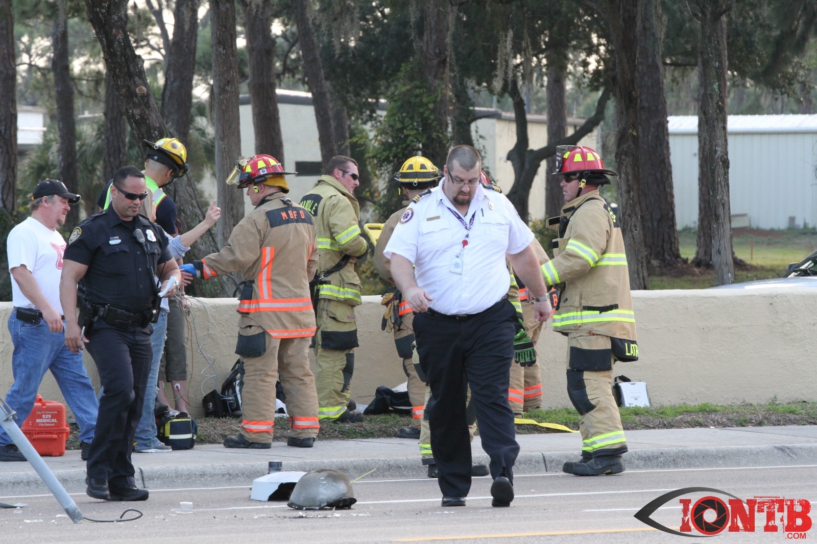 First arriving units reported heavy damage with one vehicle into a concrete wall and light pole.  A request was made for both Duke Energy and the Pinellas County Sheriff’s Office to expedite their response to assist at the scene.  Additional units from Sunstar Paramedics were also requested.