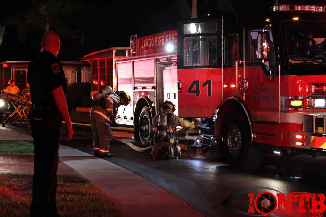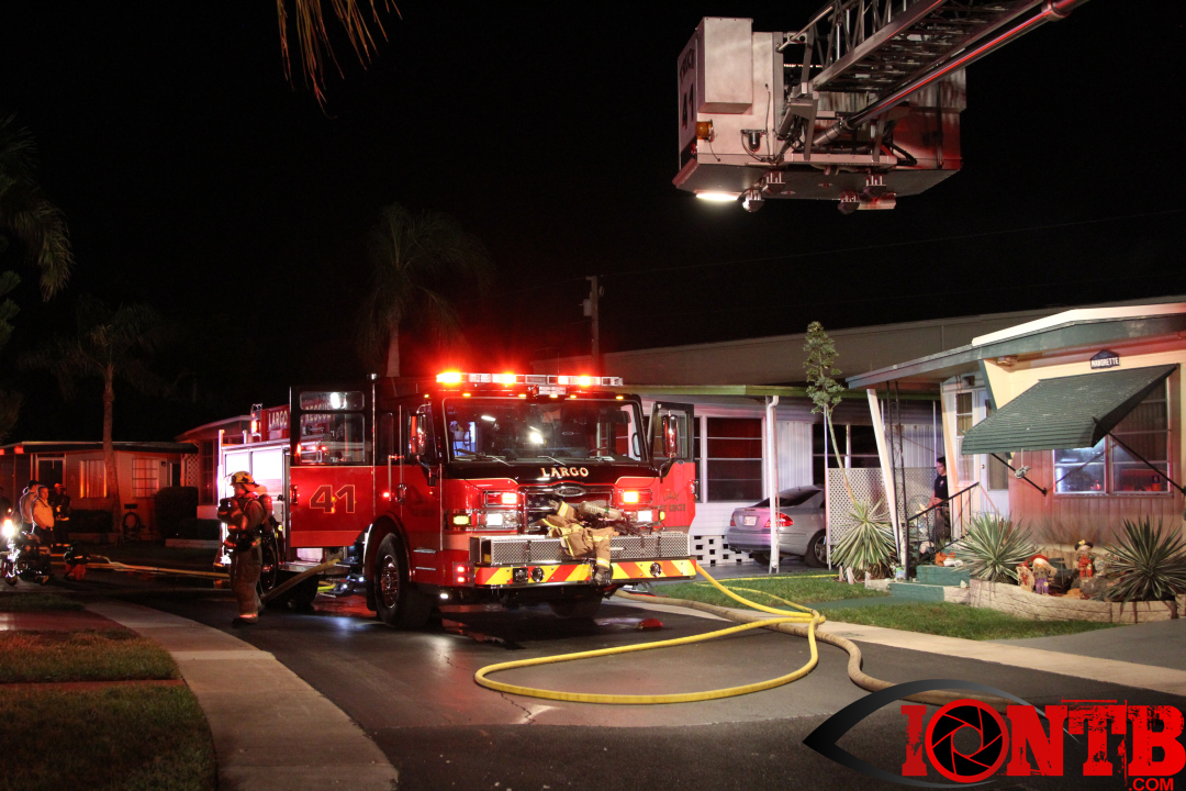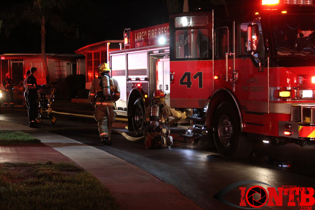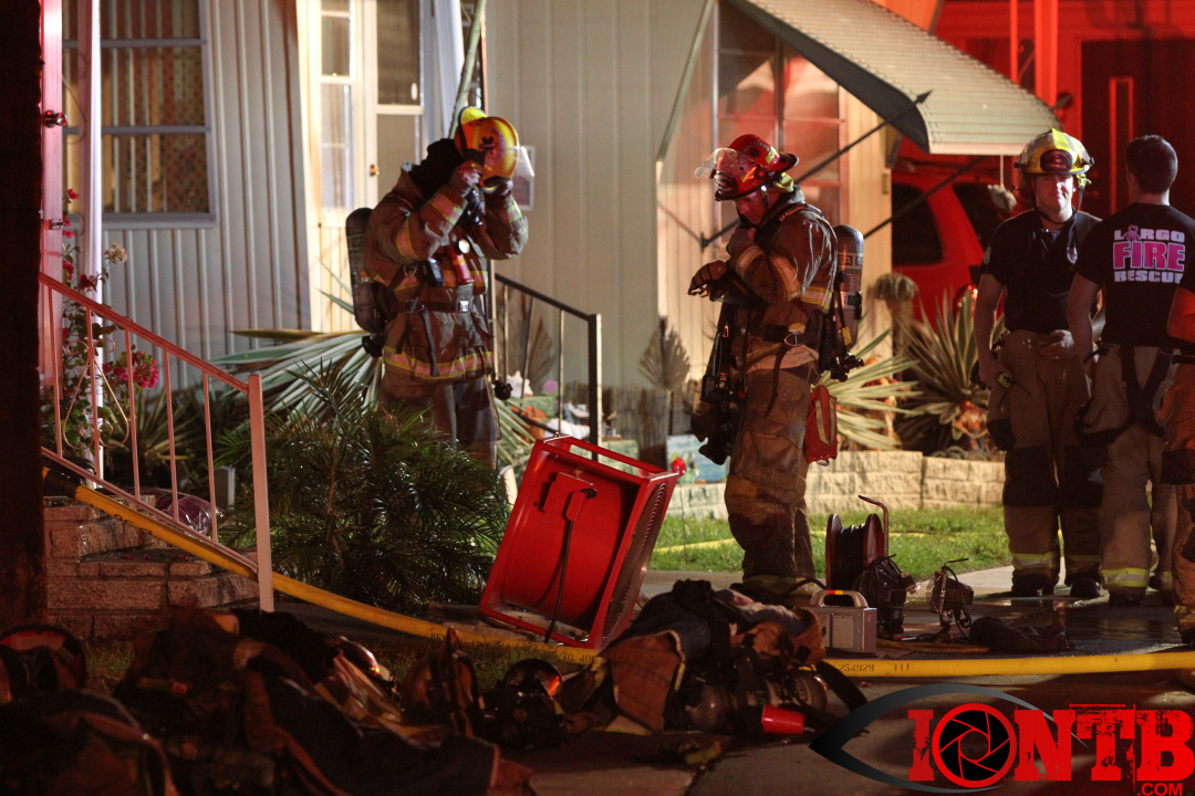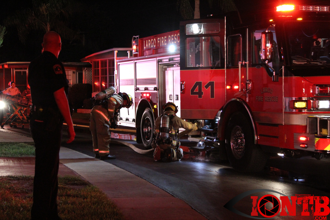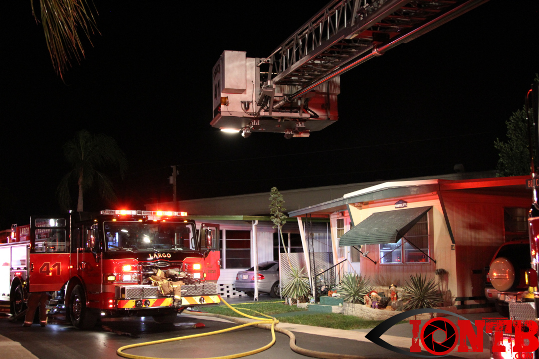 Units from Largo Fire Rescue and Clearwater Fire & Rescue were dispatched to reports of a structure fire this evening about 8:10pm. Callers to 911 initially reported that the fire was involving a vehicle next to the mobile home. Arriving units reported heavy smoke and flames involving the rear part of the structure.