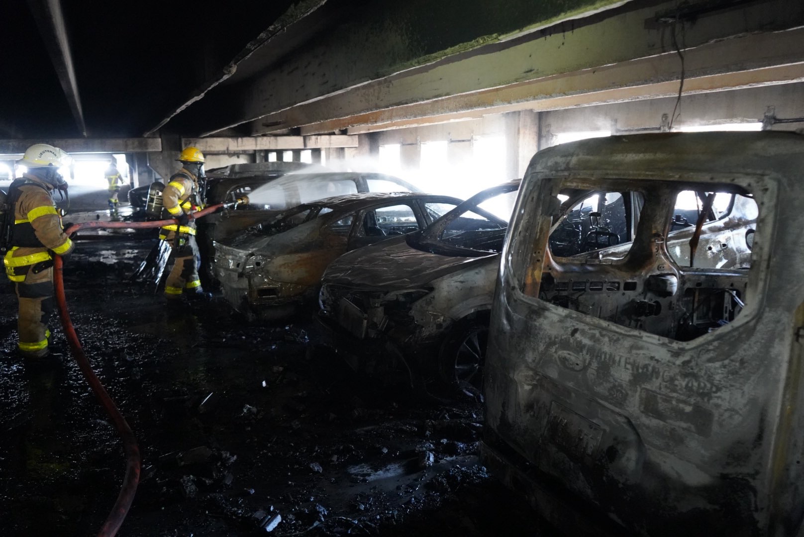 Preliminary reports indicate approximately 10 vehicles sustained significant damage. There were no reported injuries to firefighters or civilians. Traffic in the area was rerouted during the incident.