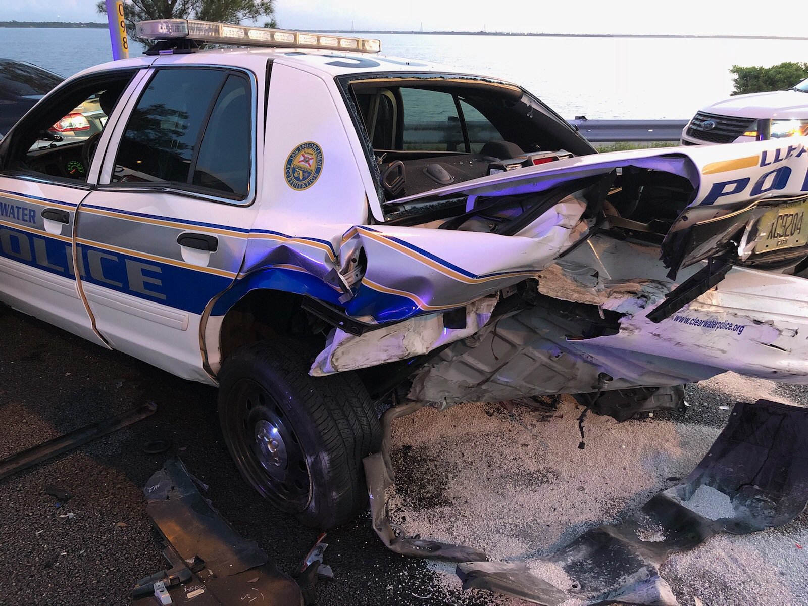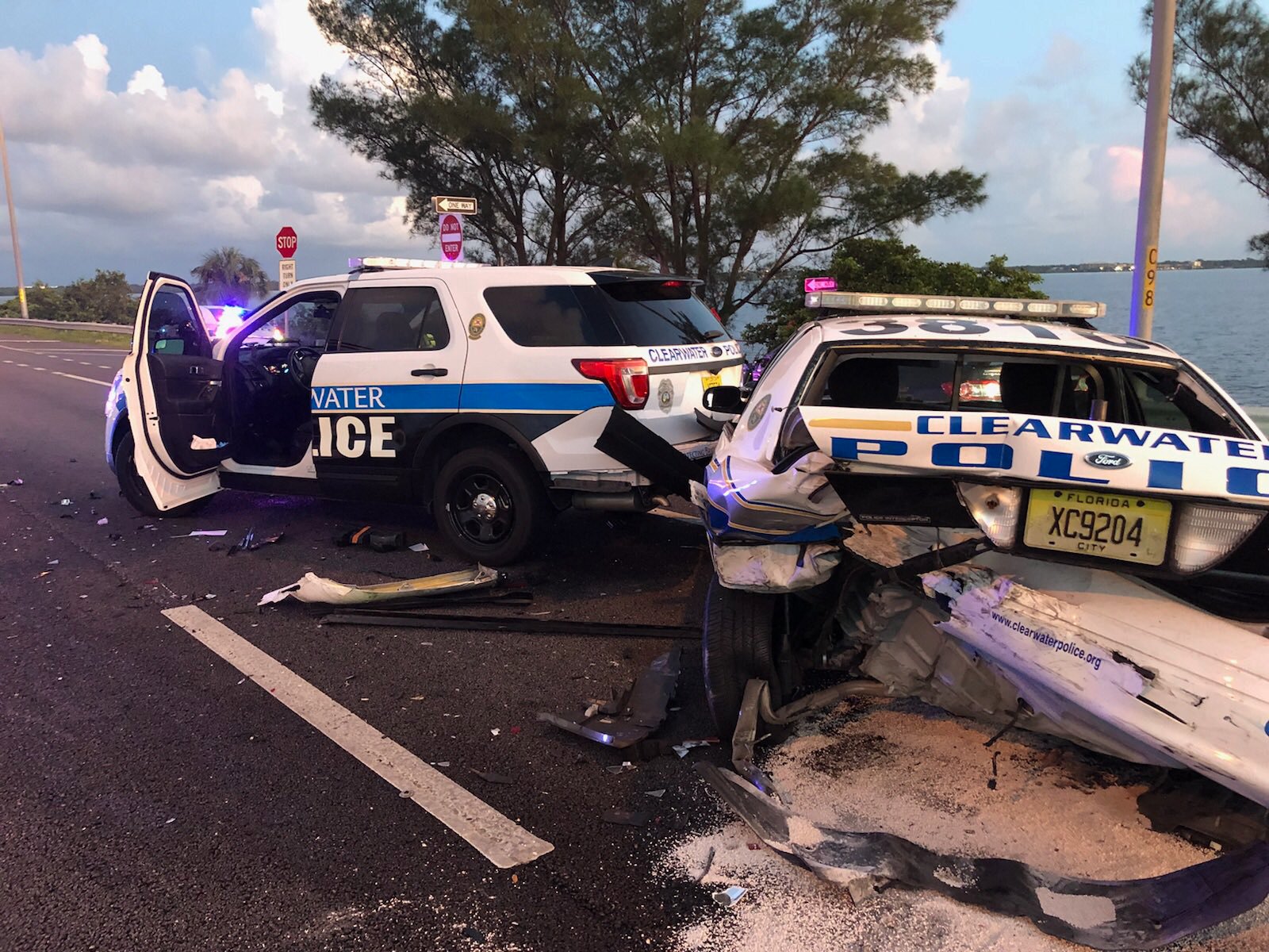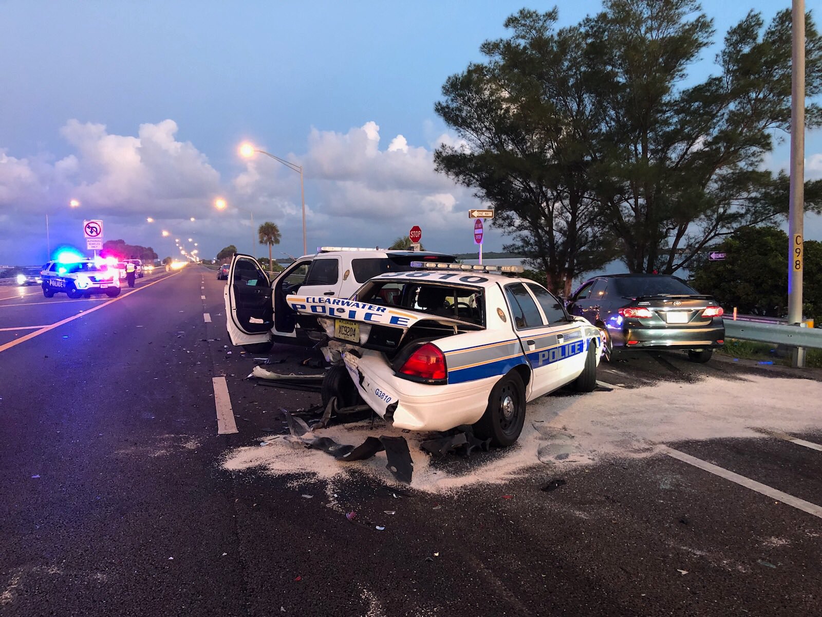 Three Officers Injured After Parked Clearwater Police Cruisers With Their Emergency Lights Flashing Were Struck by Vehicles on the Courtney Campbell in Two Separate Crashes