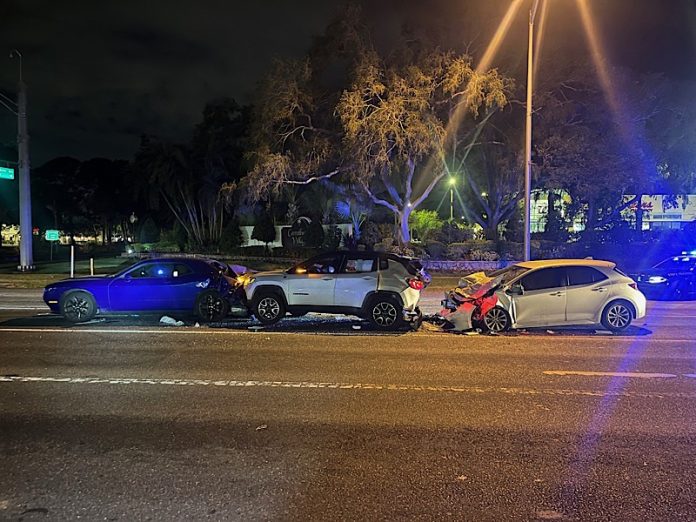 According to investigators, a 31-year-old Tampa woman driving a Toyota Corolla was traveling southbound when she failed to stop and rear-ended a Jeep Compass that was stopped in the center lane. The Jeep, driven by a 32-year-old Orlando woman, was pushed forward by the impact and collided with a Dodge Challenger stopped ahead, operated by a 38-year-old Tampa man.