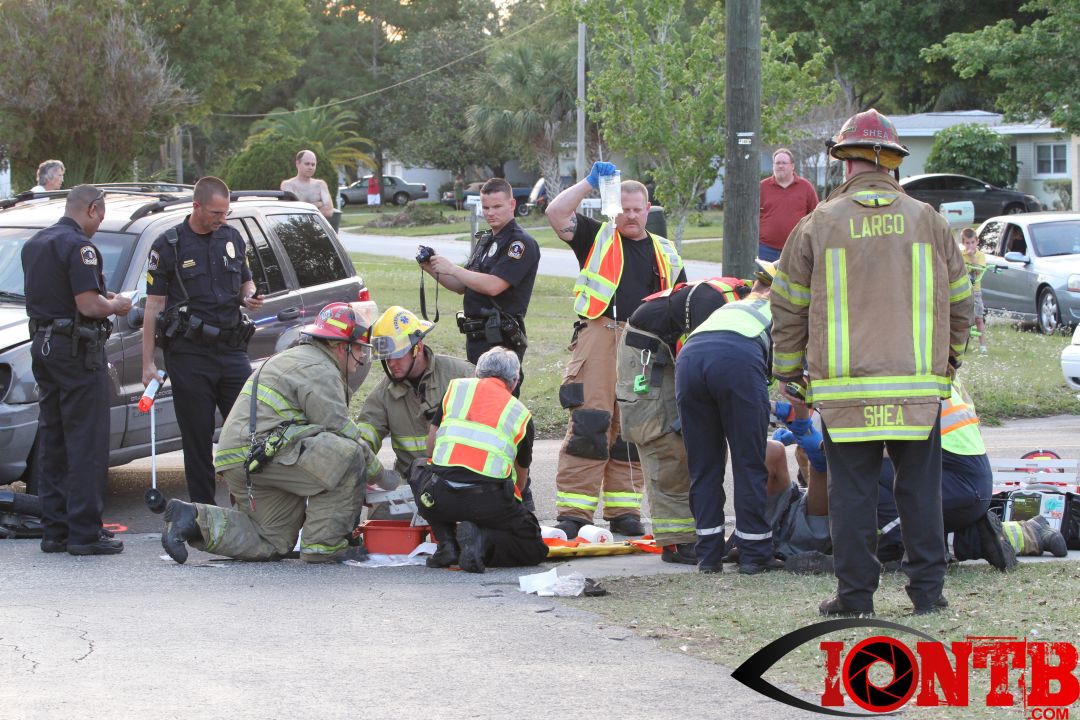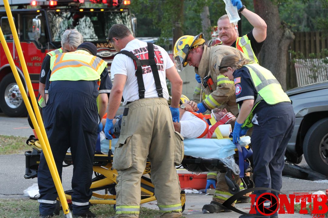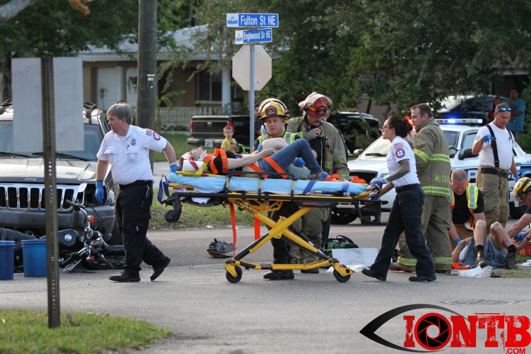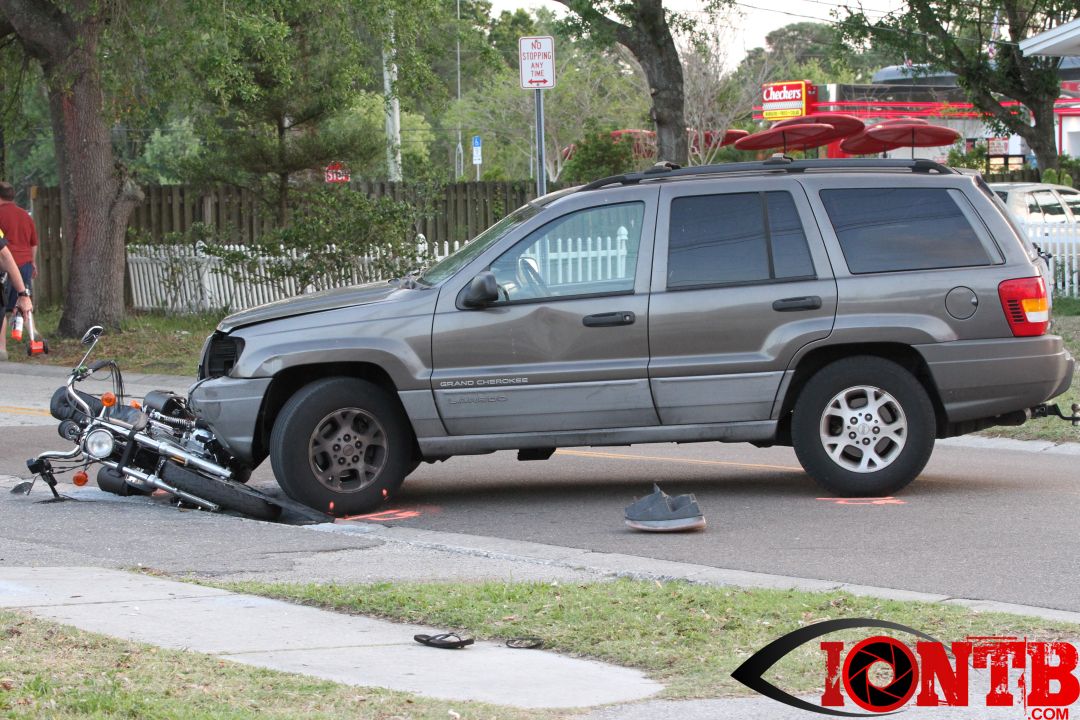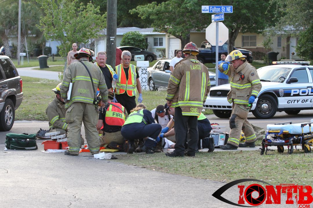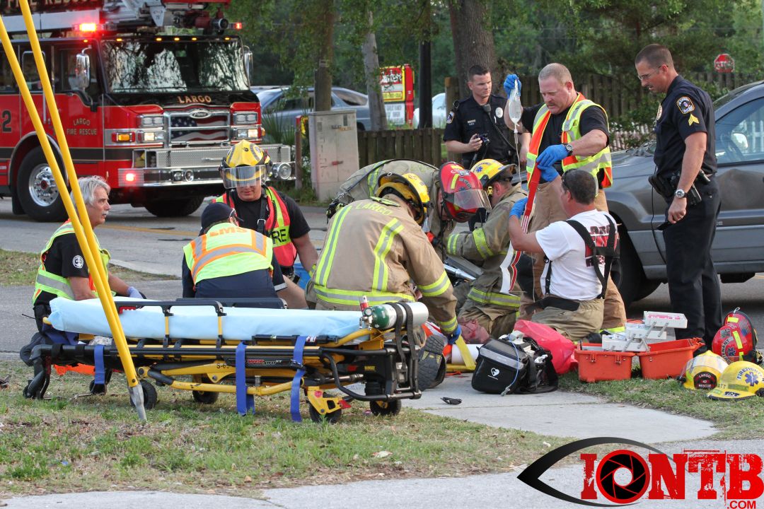 Largo Police and Fire Rescue were dispatched to a traffic incident about 7:20pm near the intersection of Eastbay Drive and Fulton Street. The crash was located just North of the intersection where a motorcycle was wedged under the front of a Jeep Cherokee. Both riders on the motorcycle were in the roadway when rescue workers arrived. The motorcycle was being driven by a male accompanied by a female passenger. The female passenger was declared a Trauma Alert and was transported to Bayfront Medical Center. A second Sunstar Unit responded to also transport the male driver to Bayfront Medical Center. Both individuals suffered obvious injuries to their lower extremities. The driver of the Jeep did not appear to have suffered any injuries in the crash.