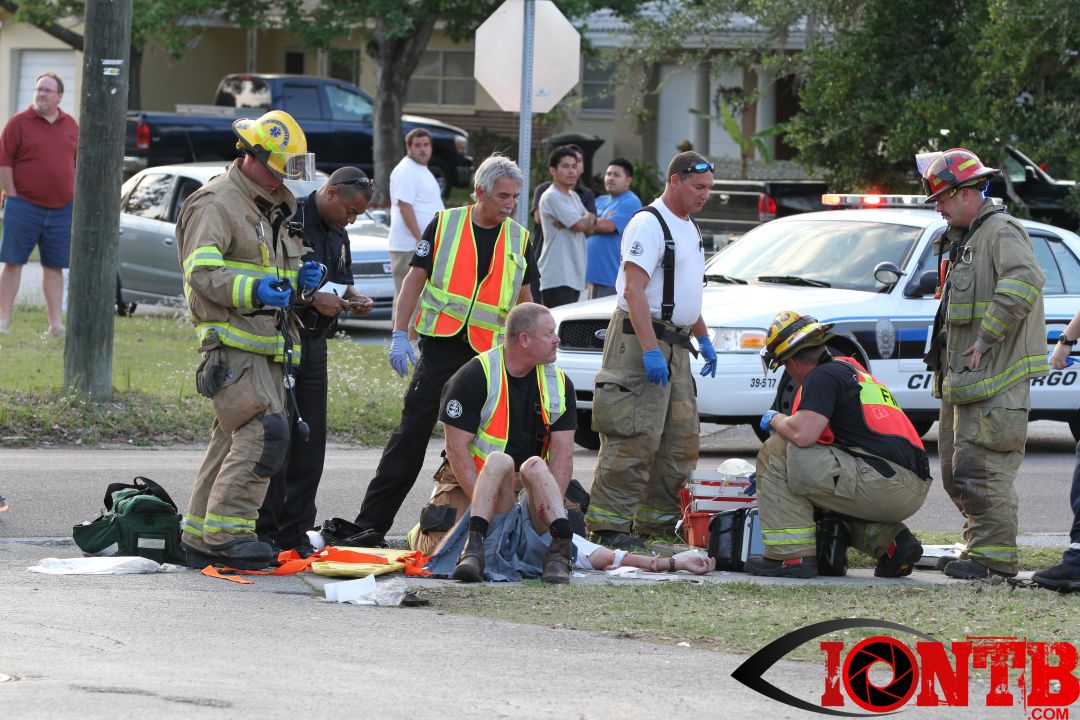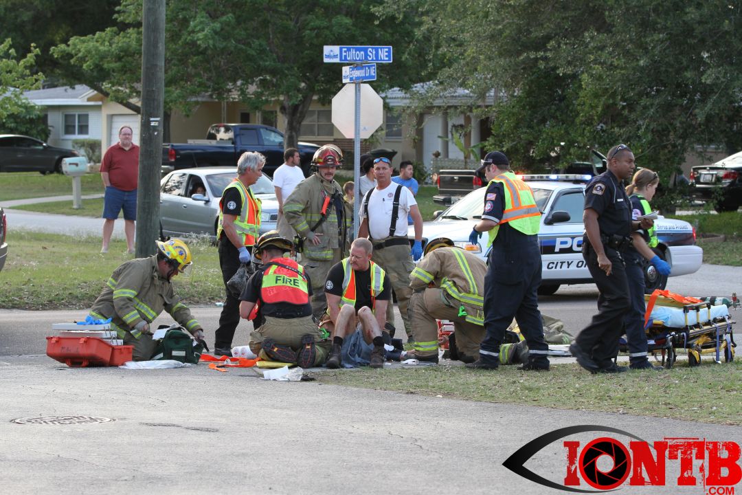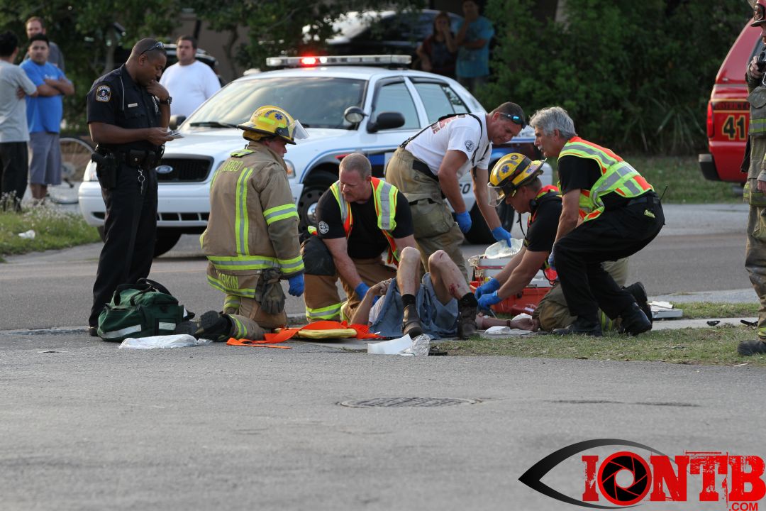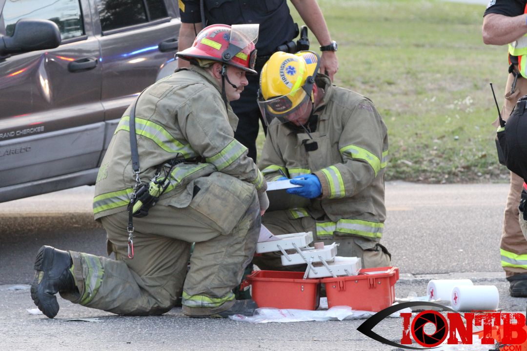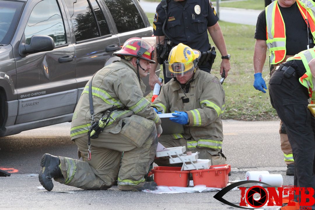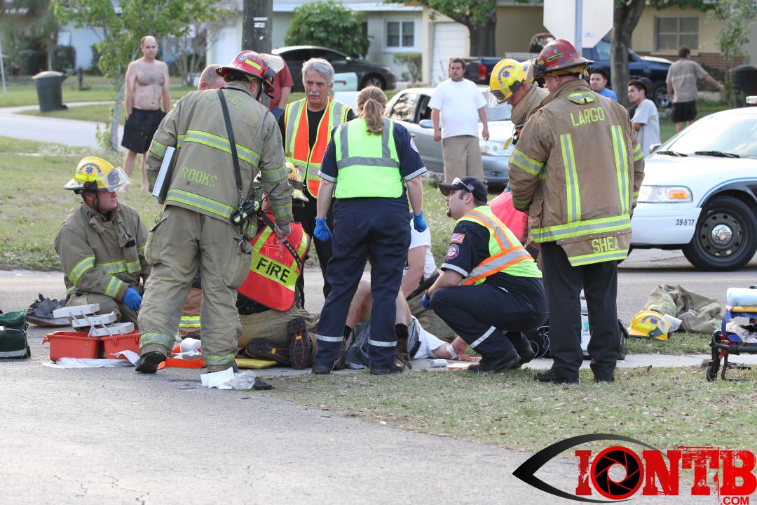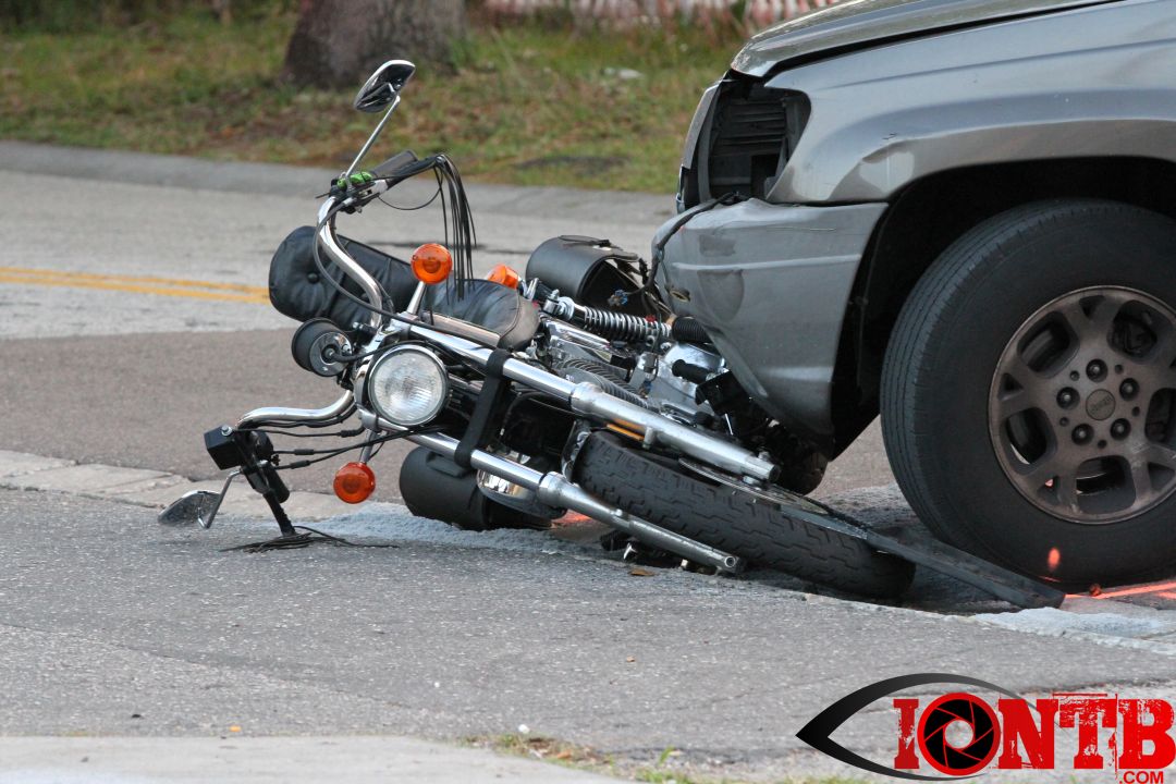 Largo Police and Fire Rescue were dispatched to a traffic incident about 7:20pm near the intersection of Eastbay Drive and Fulton Street. The crash was located just North of the intersection where a motorcycle was wedged under the front of a Jeep Cherokee. Both riders on the motorcycle were in the roadway when rescue workers arrived. The motorcycle was being driven by a male accompanied by a female passenger. The female passenger was declared a Trauma Alert and was transported to Bayfront Medical Center. A second Sunstar Unit responded to also transport the male driver to Bayfront Medical Center. Both individuals suffered obvious injuries to their lower extremities. The driver of the Jeep did not appear to have suffered any injuries in the crash.