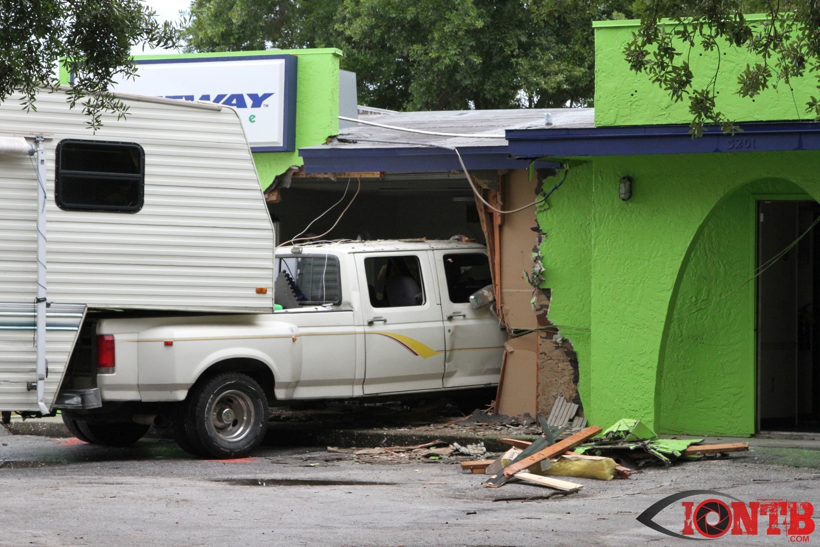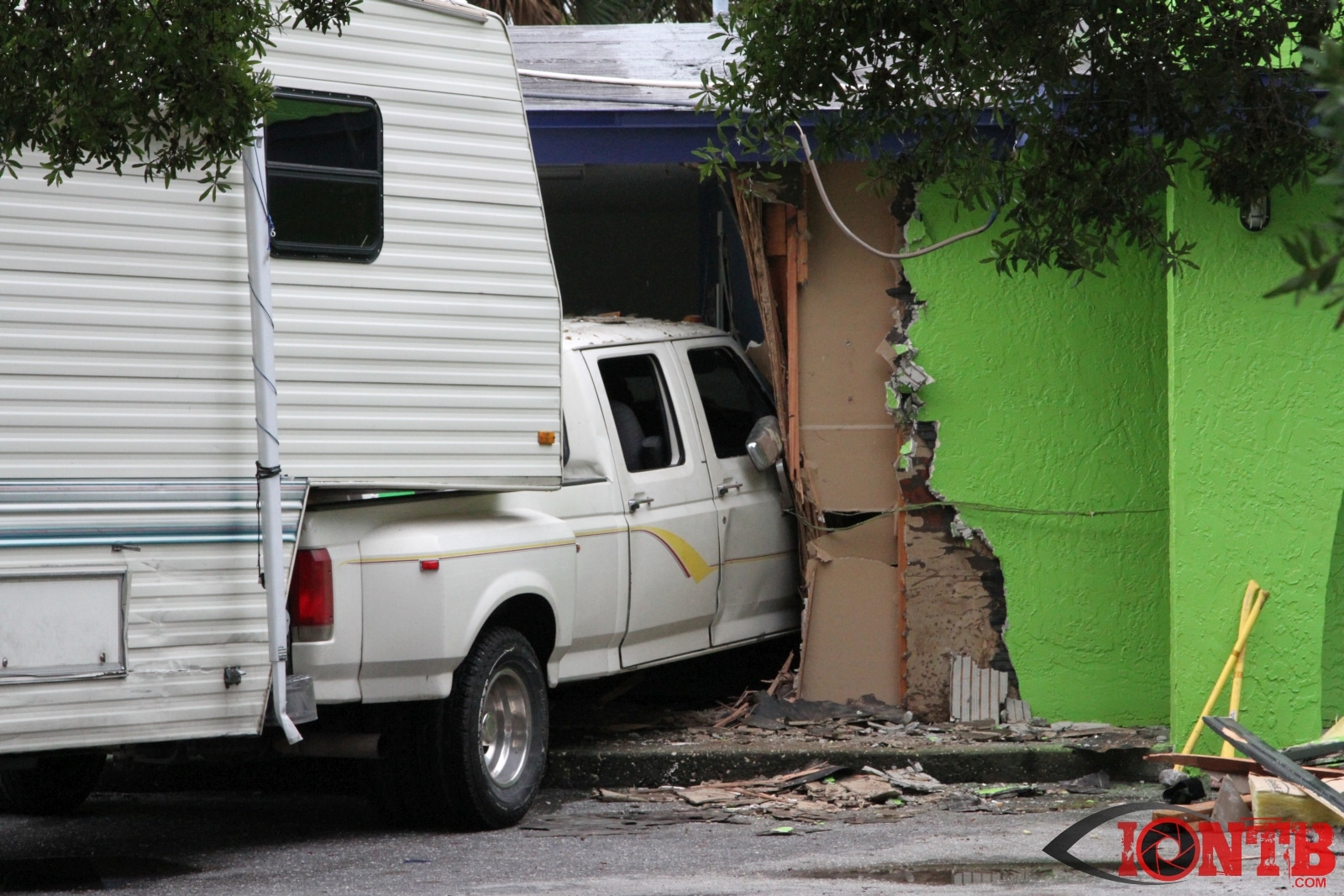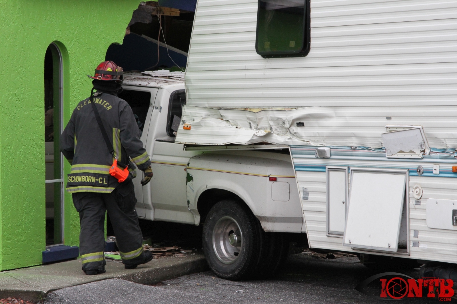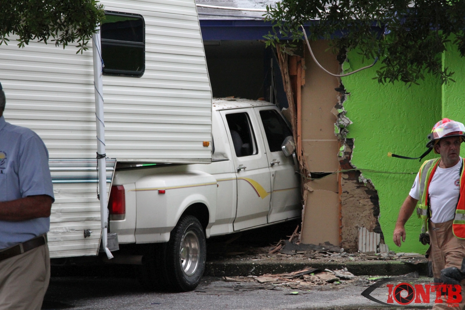 Investigation is on-going, but preliminary information indicates that a Ford Dually Pick Up truck was pulling a 5th Wheel RV east bound on East Bay Dr. Another vehicle, a Lincoln Town Car was turning left (south) from west bound East Bay Dr also at Fulton. The Town Car was struck by the Pick Up/5th Wheel combo. The Pick Up/5th Wheel then lost control and struck a building at 3201 East Bay Dr.