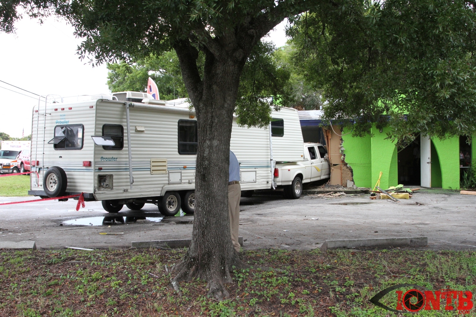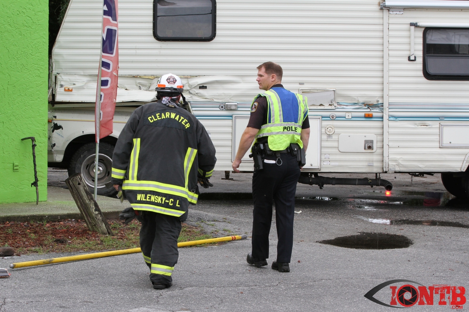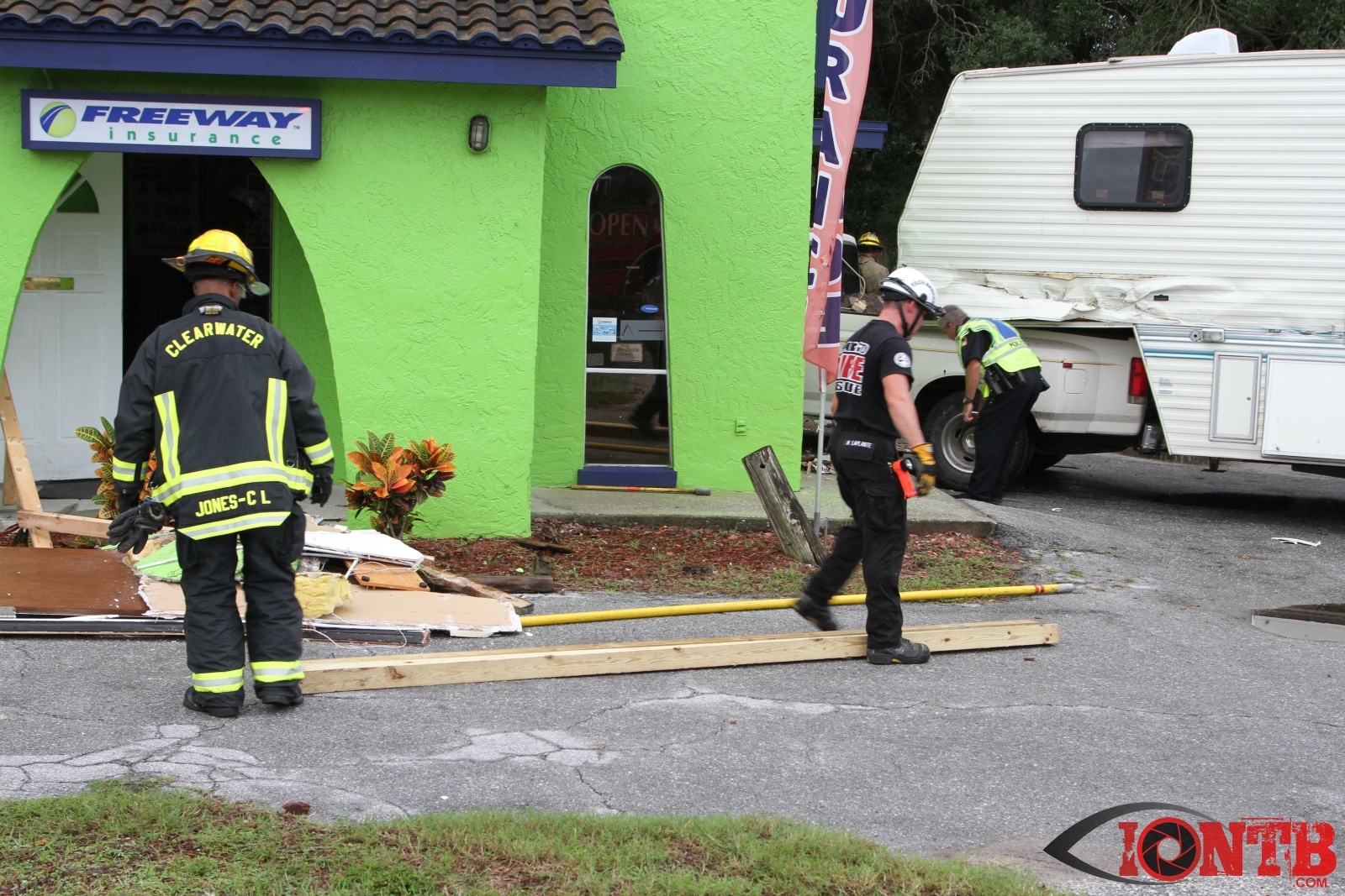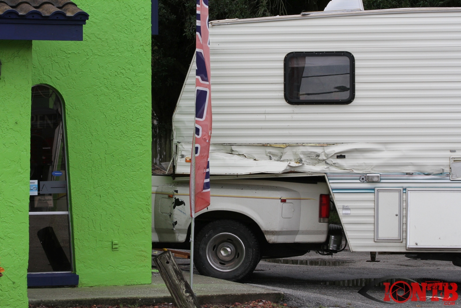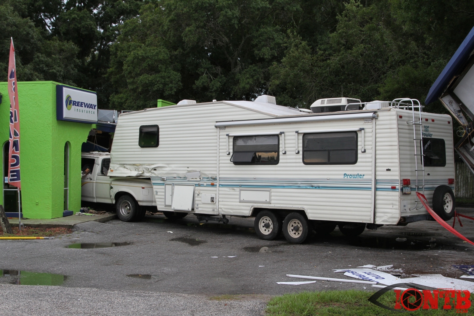Investigation is on-going, but preliminary information indicates that a Ford Dually Pick Up truck was pulling a 5th Wheel RV east bound on East Bay Dr. Another vehicle, a Lincoln Town Car was turning left (south) from west bound East Bay Dr also at Fulton. The Town Car was struck by the Pick Up/5th Wheel combo. The Pick Up/5th Wheel then lost control and struck a building at 3201 East Bay Dr.