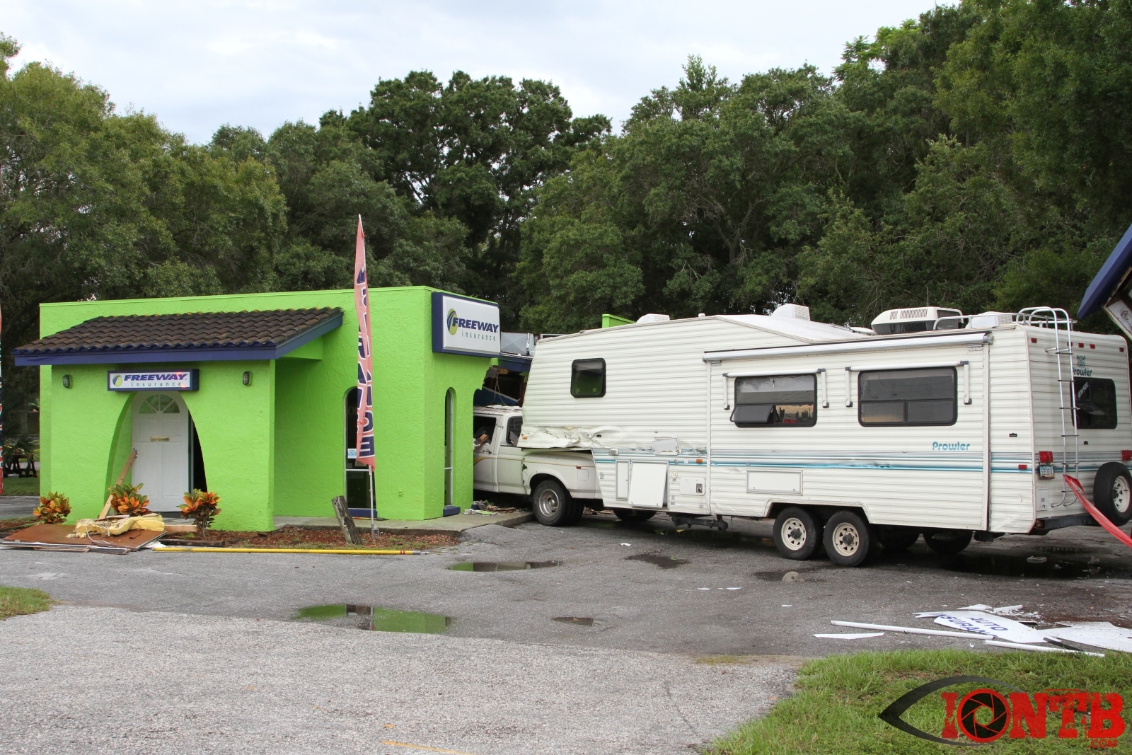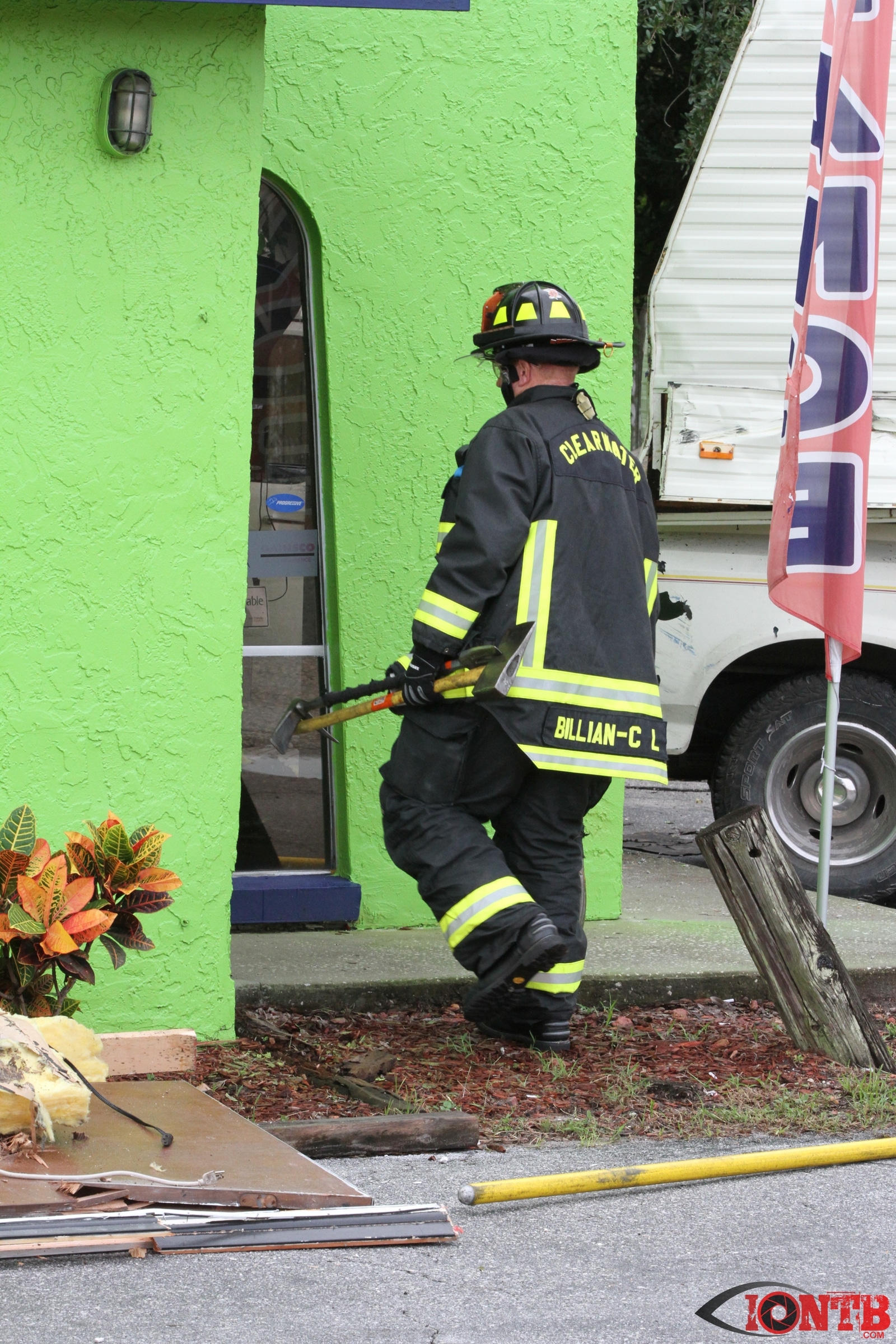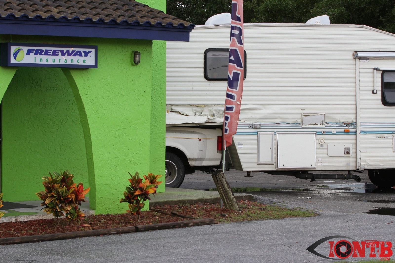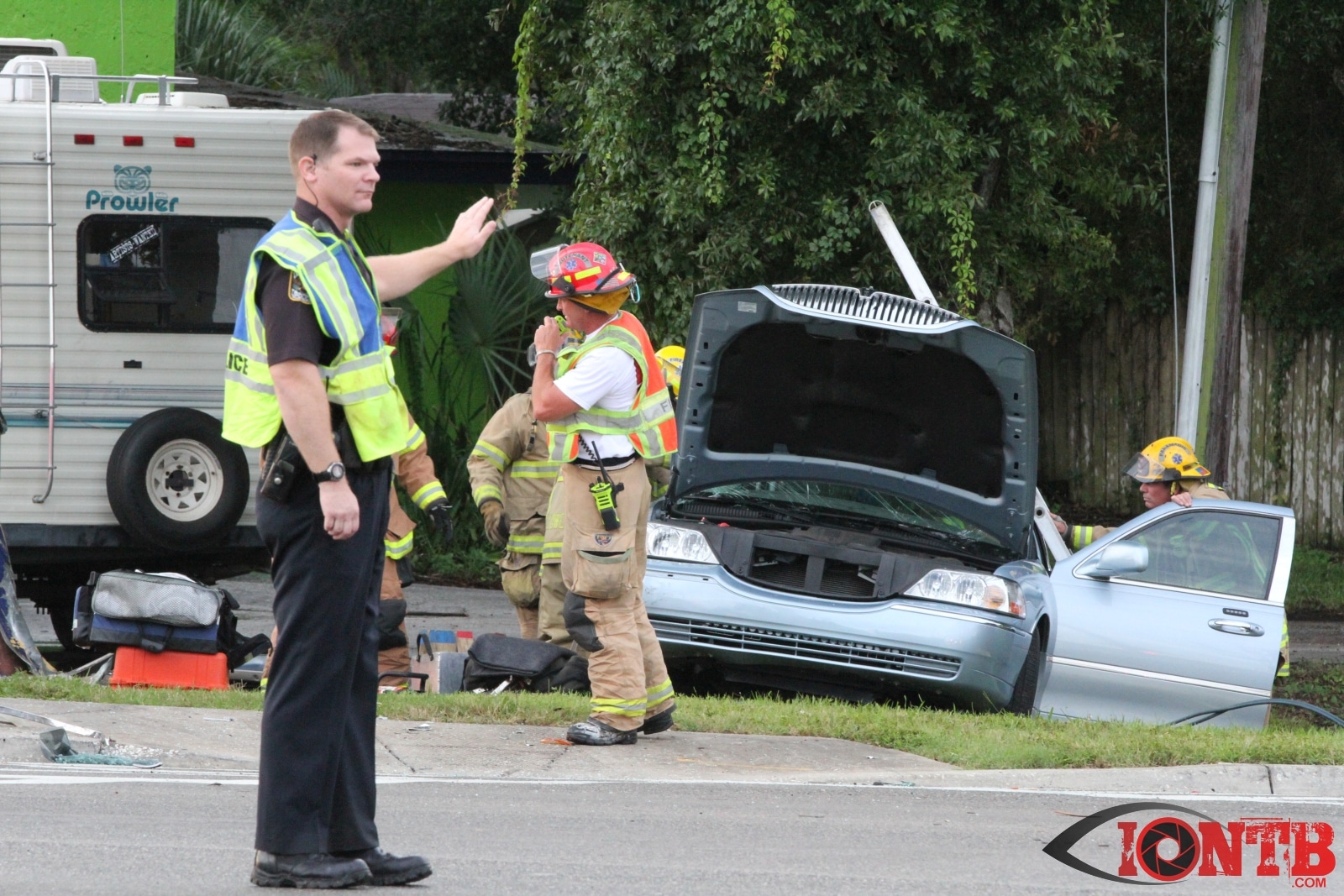 Investigation is on-going, but preliminary information indicates that a Ford Dually Pick Up truck was pulling a 5th Wheel RV east bound on East Bay Dr. Another vehicle, a Lincoln Town Car was turning left (south) from west bound East Bay Dr also at Fulton. The Town Car was struck by the Pick Up/5th Wheel combo. The Pick Up/5th Wheel then lost control and struck a building at 3201 East Bay Dr.