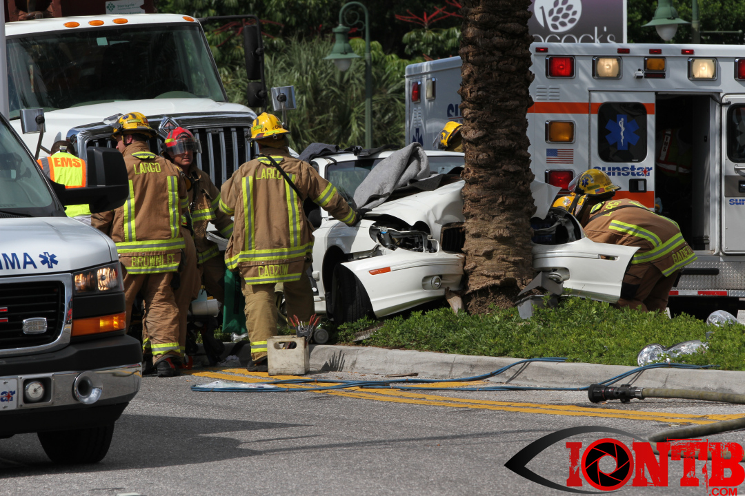 Units from Largo Fire Rescue were dispatched to a vehicle crash today at approximately 3:41pm. The crash was located just to the north of West Bay Drive on Clearwater Largo Road. Upon arrival, units encountered a vehicle with heavy damage that was crushed between a large hauling truck and a tree located in the center median. Largo Fire Rescue personnel utilized extrication equipment in order to remove those injured from the damaged vehicle.
