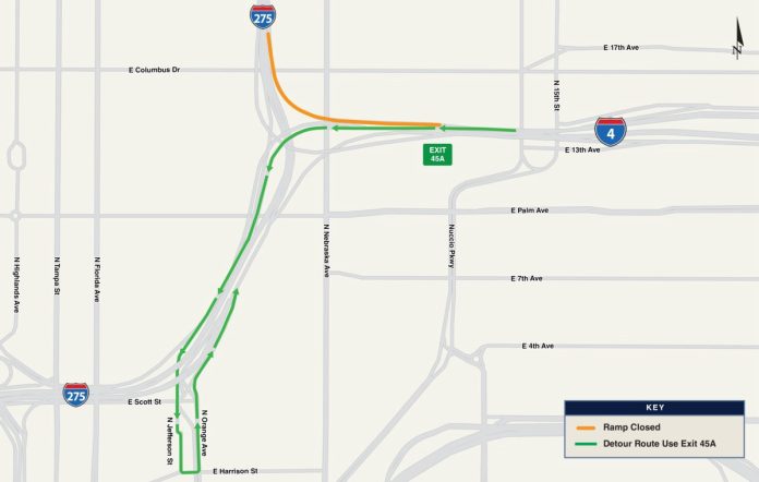 TAMPA – The westbound Interstate 4 ramp to northbound Interstate 275 will close overnight from 10 p.m. Tuesday, February 17, to 1 a.m. Wednesday, February 18, weather permitting.
